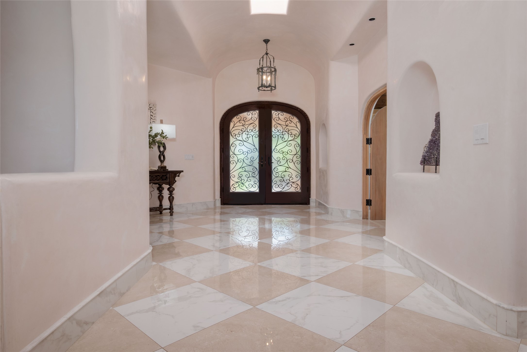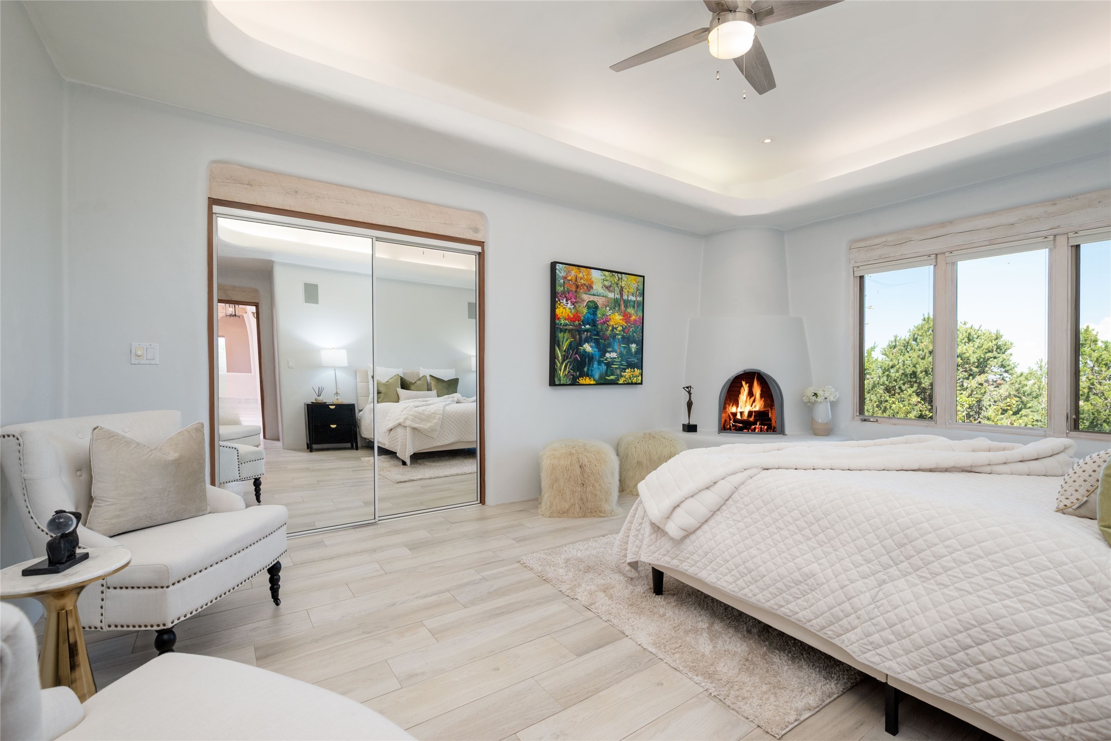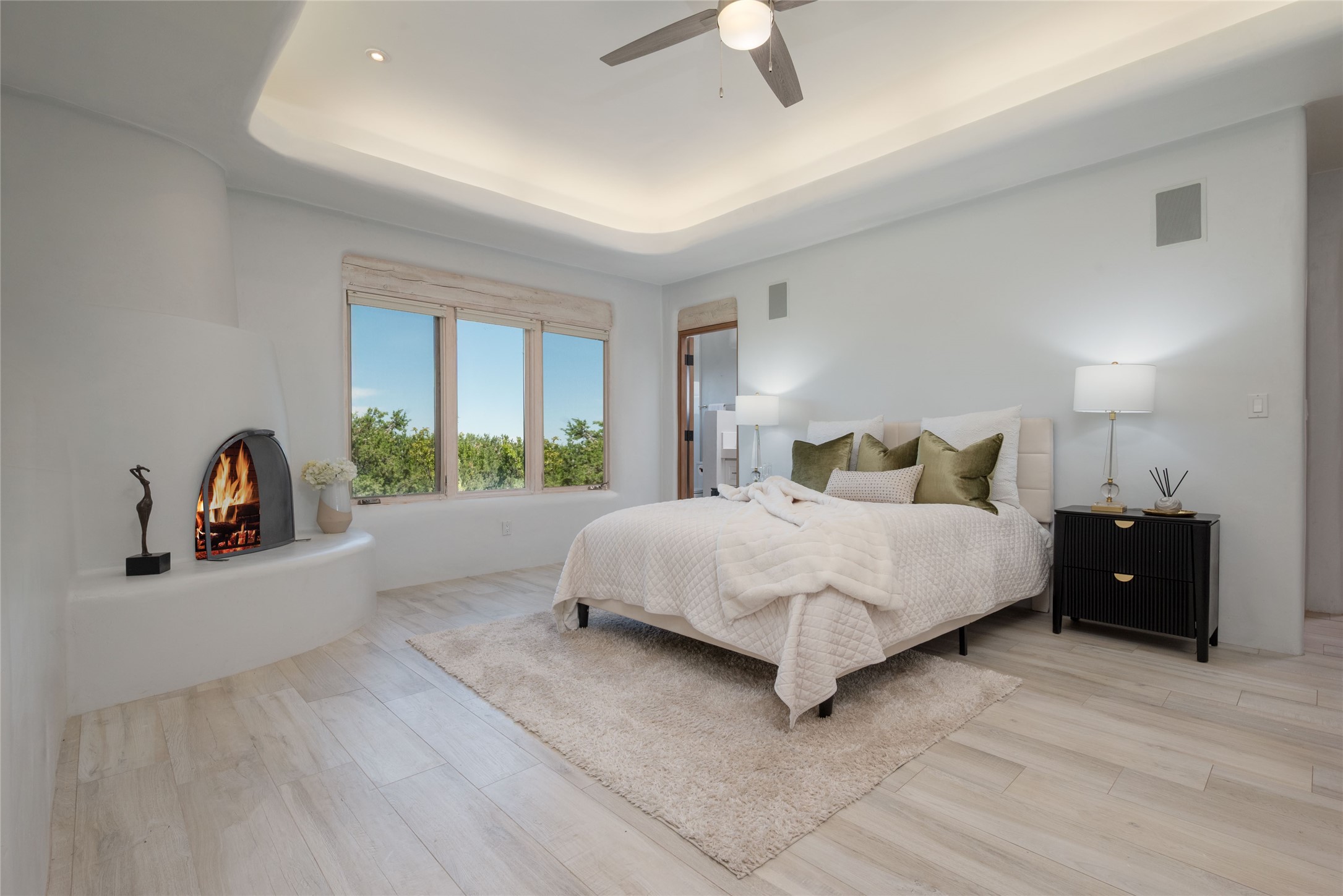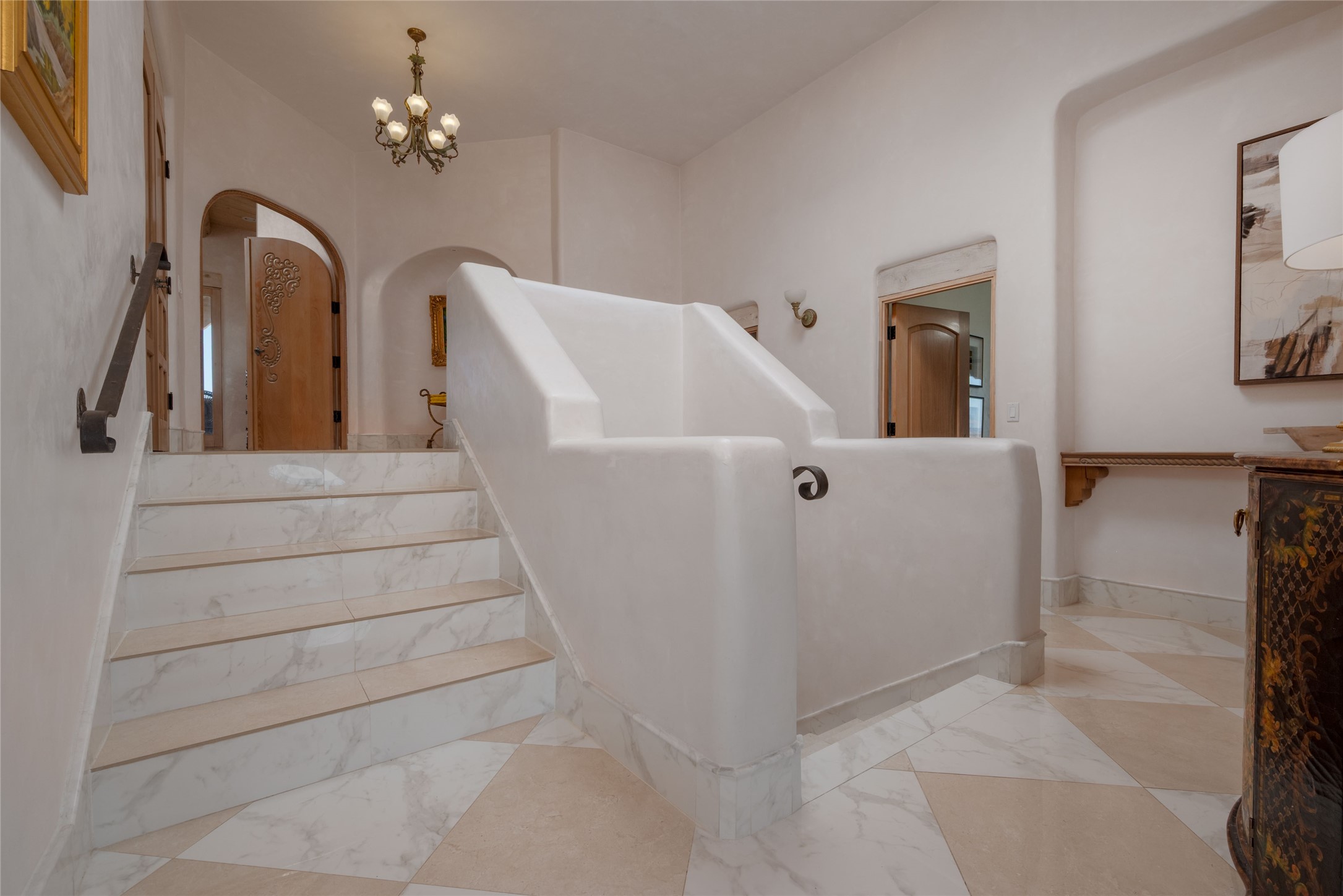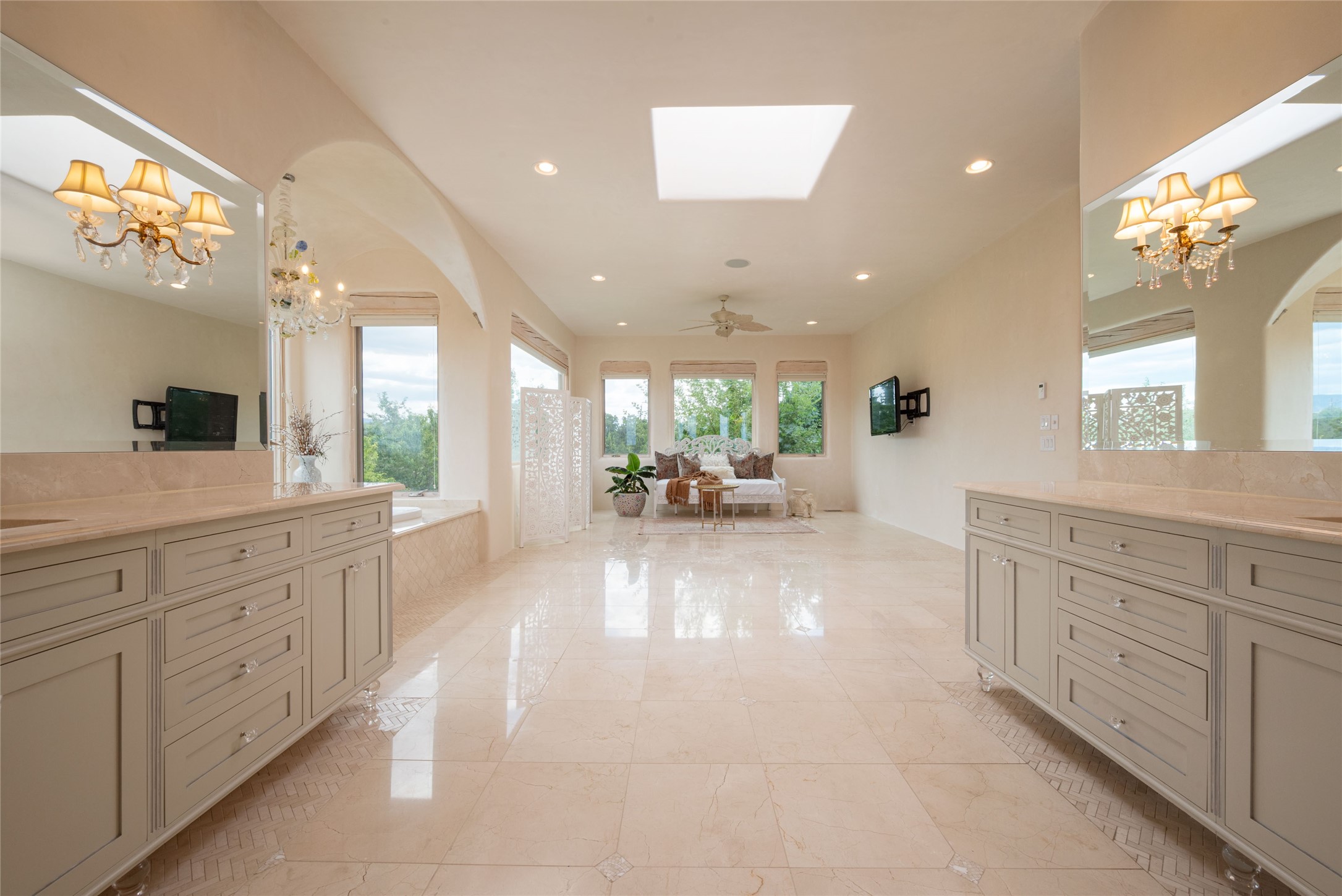 Grand Hacienda Winner and the unrivaled Belle of Tano Road redefines the essence of luxury living. Nestled behind exquisite handcrafted wrought iron gates, you are transported to a serene desert oasis, embraced by the splendor of nature, offering unparalleled privacy and sanctuary from the world. As you enter through handcrafted mahogany and wrought iron doors, the soaring ceilings and diamond plaster walls create an atmosphere of grandeur, while the Italian porcelain floors reflect a commitment to the highest standards of luxury and craftsmanship. Every detail has been meticulously curated for you. The great room, with its endless windows, invites you to bask in the breathtaking views of the sweeping mountains and the enchanting cityscape below, perfectly positioned above the exclusive enclave of Santa Fe. The sprawling estate houses two exquisite primary suites, each featuring spa-like bathrooms with soaking tubs, emperor showers, and ample space to have a powder room lounge, a meditation space, or a fitness area. Each of the four bedrooms is its own sanctuary, complete with fireplace and en-suite facilities, ensuring every guest feels like royalty and that their comfort and privacy are paramount. The gourmet kitchen is a culinary dream featuring custom cabinetry, Wolf range with double ovens and a warming drawer, Sub-Zero refrigerator, and a massive island seamlessly connecting to the outdoor cooking and dining spaces for effortless entertaining. Expansive grounds, nearly three lush acres, adorned with manicured lawns, vibrant rose gardens, and fruit trees, offer an idyllic setting for outdoor gatherings. These luxurious spaces provide not just comfort, but a lifestyle of sophistication. Immaculately maintained and thoughtfully expanded, this sprawling 6,700sq.ft estate is a testament to refined living. This is more than just a home - it is a lifestyle drenched in luxury and elegance. Design that speaks to the most discerning tastes and coveted desires. *Video*