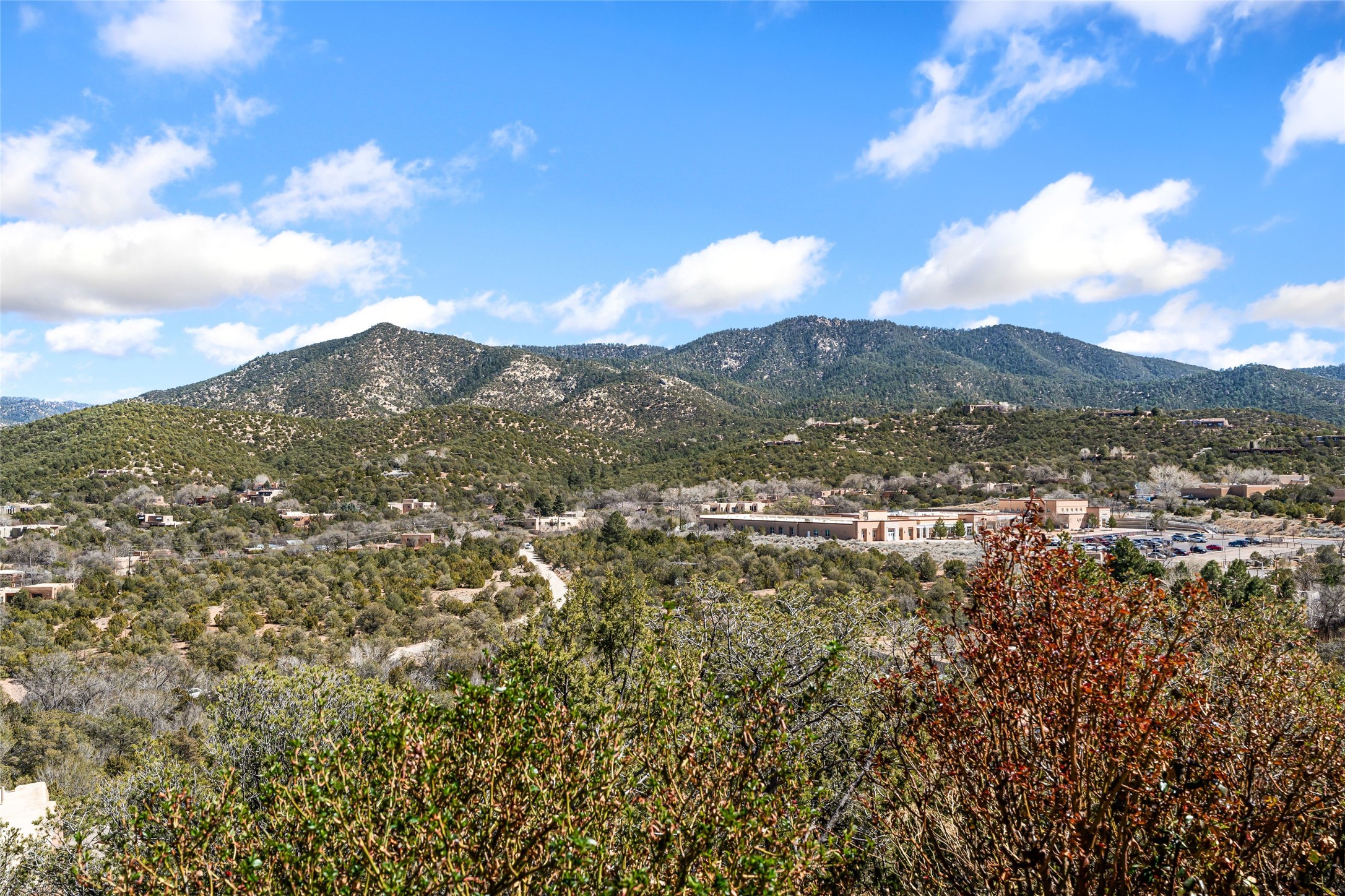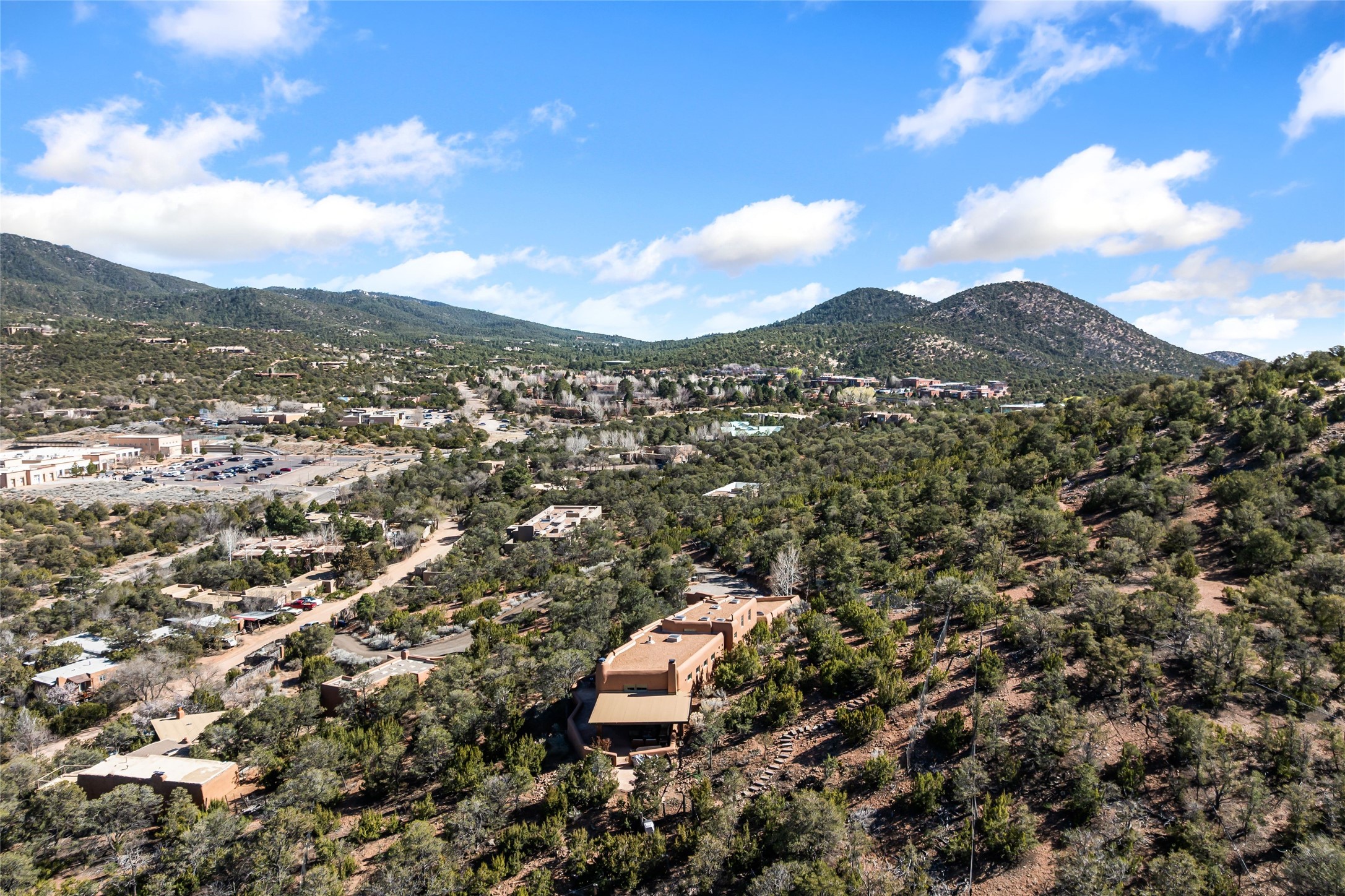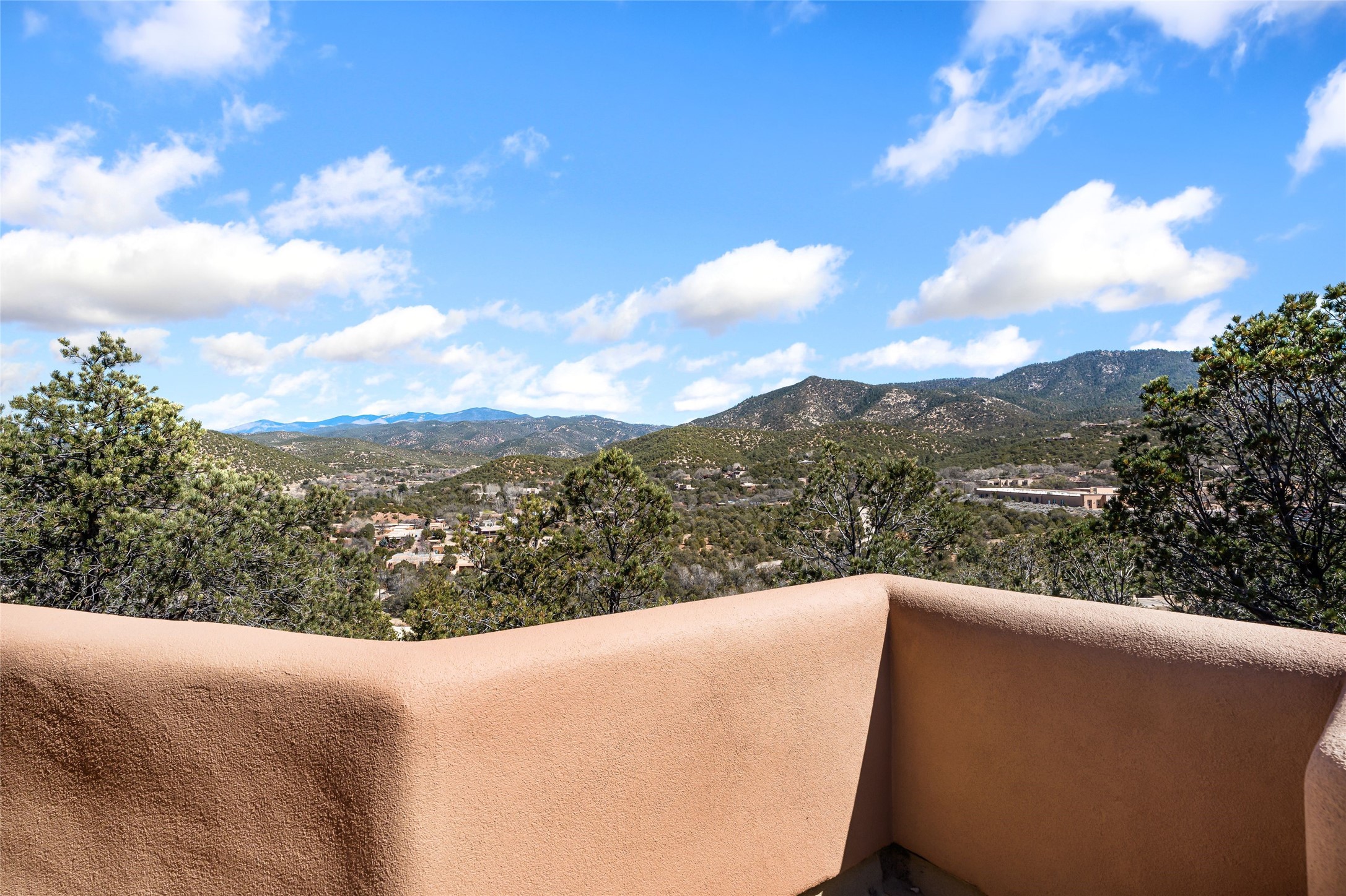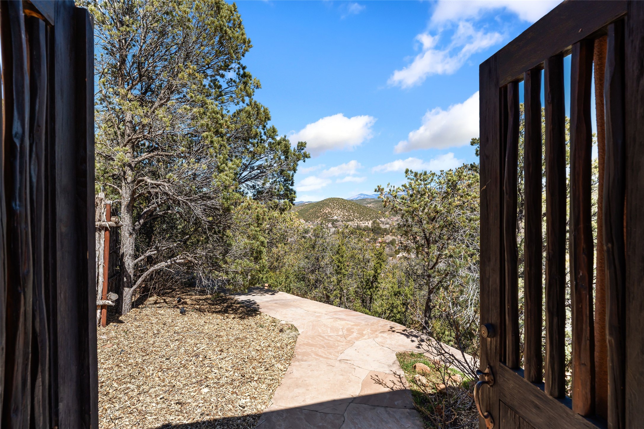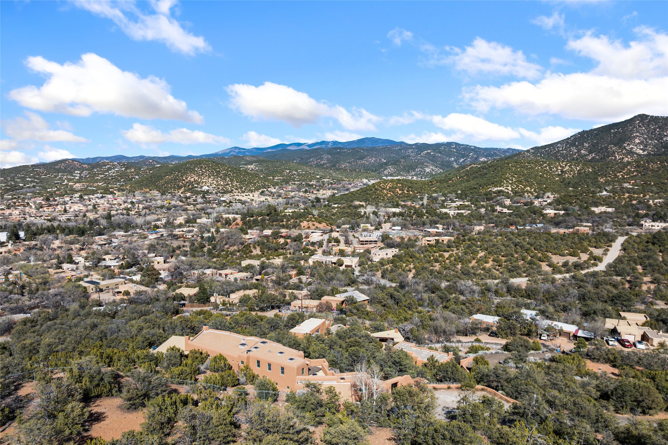 Are you looking for a big view house minutes from Canyon Rd and the Plaza? Villa Bettina is perched on a hillside on over 1.5 acres overlooking Canyon Rd and the Historic Eastside with huge Sangre Mountain views as well as spectacular views of Piccacho, Atalaya, Sun & Moon Mountains out every window! The front entry divides the house between the primary bedroom suite and public living spaces. This custom one-owner home is a rastra build with concrete floors, radiant heat and a beautiful open concept great room for kitchen, living and dining with high ceilings featuring vigas & latillas, a kiva fireplace and numerous French doors opening to the front of the house and covered portal. The covered portal with a kiva fireplace is a wonderful setting to enjoy indoor/outdoor living and to soak up the magnificent views of the mountains and city lights. An efficiently designed kitchen with the best kitchen window view in town, granite counters, breakfast bar, gas stove, Sub Zero fridge and a unique carved lintel with bees and honeycomb is perfectly placed to interact with all the happenings of life in the great room. The primary bedroom suite includes a full bath with river rock enclosed soaking tub and shower, an exercise/spa room with sauna, private South-facing enclosed patio (also accessible from the driveway) and home office. The wooden stairs ascending from the entry foyer feature a hand-crafted metal handrail made by MacArthur Fellow Tom Joyce (as was the hardware on the handcrafted front door) leading up to a guest bedroom, bath, office space and fun, special, secret loft. The guest casita, just down a little walkway from the house is frame and stucco with a full kitchen and bath, plenty of storage, a kiva fireplace in the main living space and a view-filled covered front portal. With a path that leads all around the house and property one can also climb up to the top of the hill for sunset vistas.