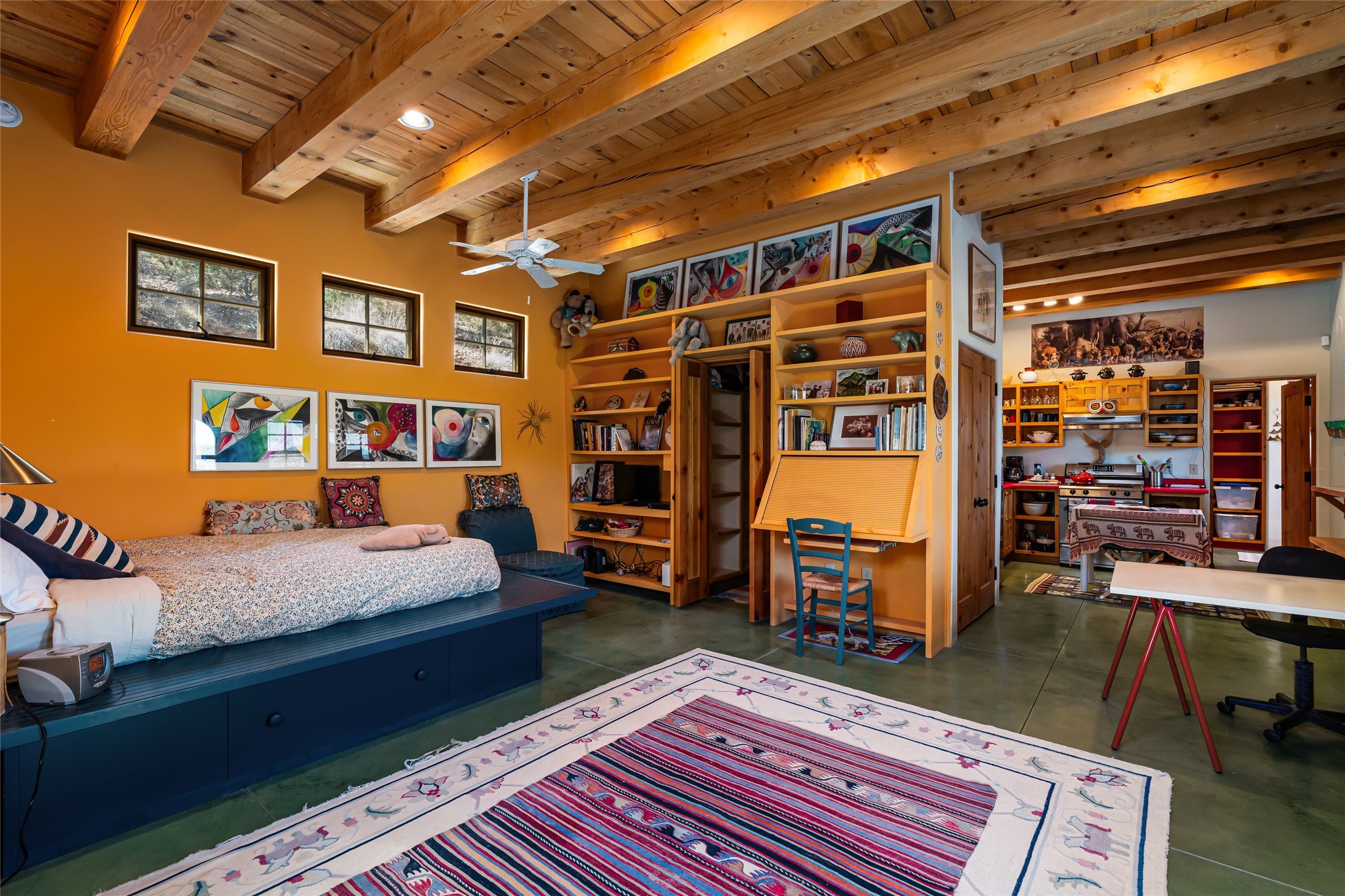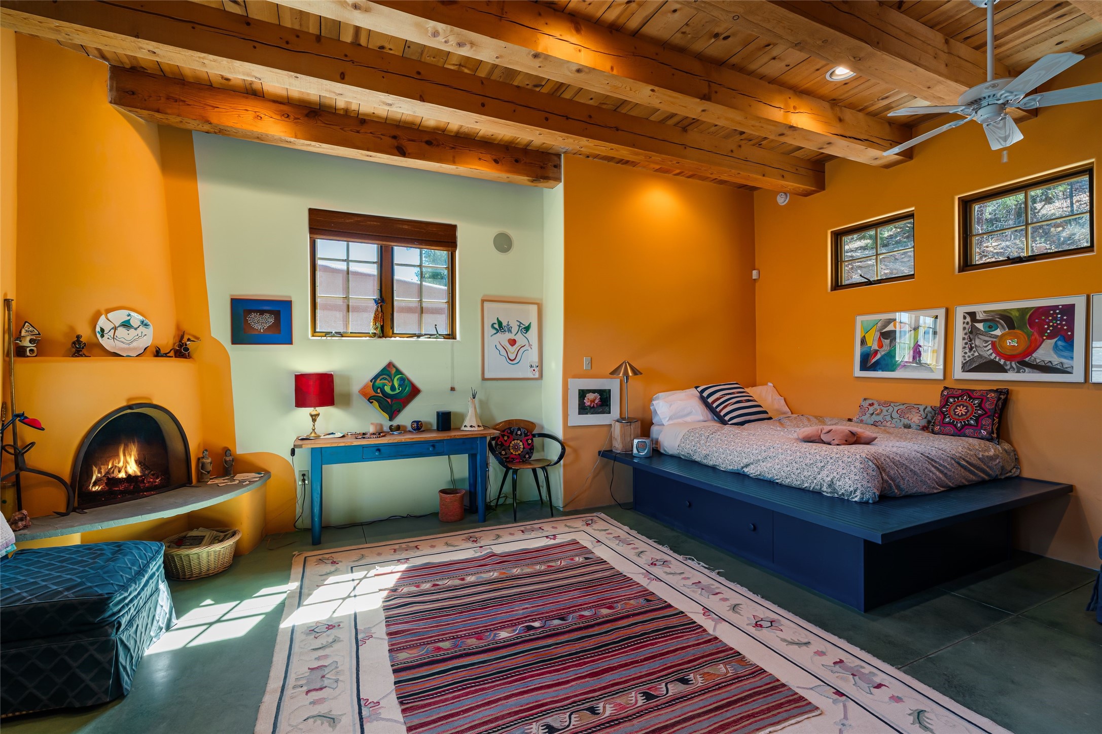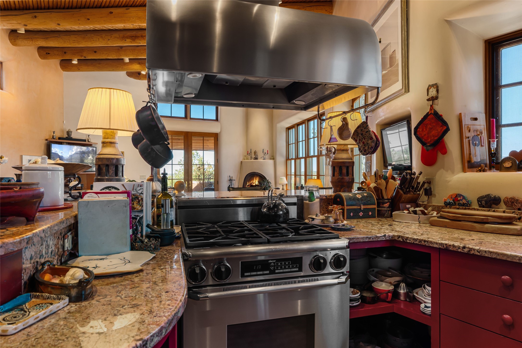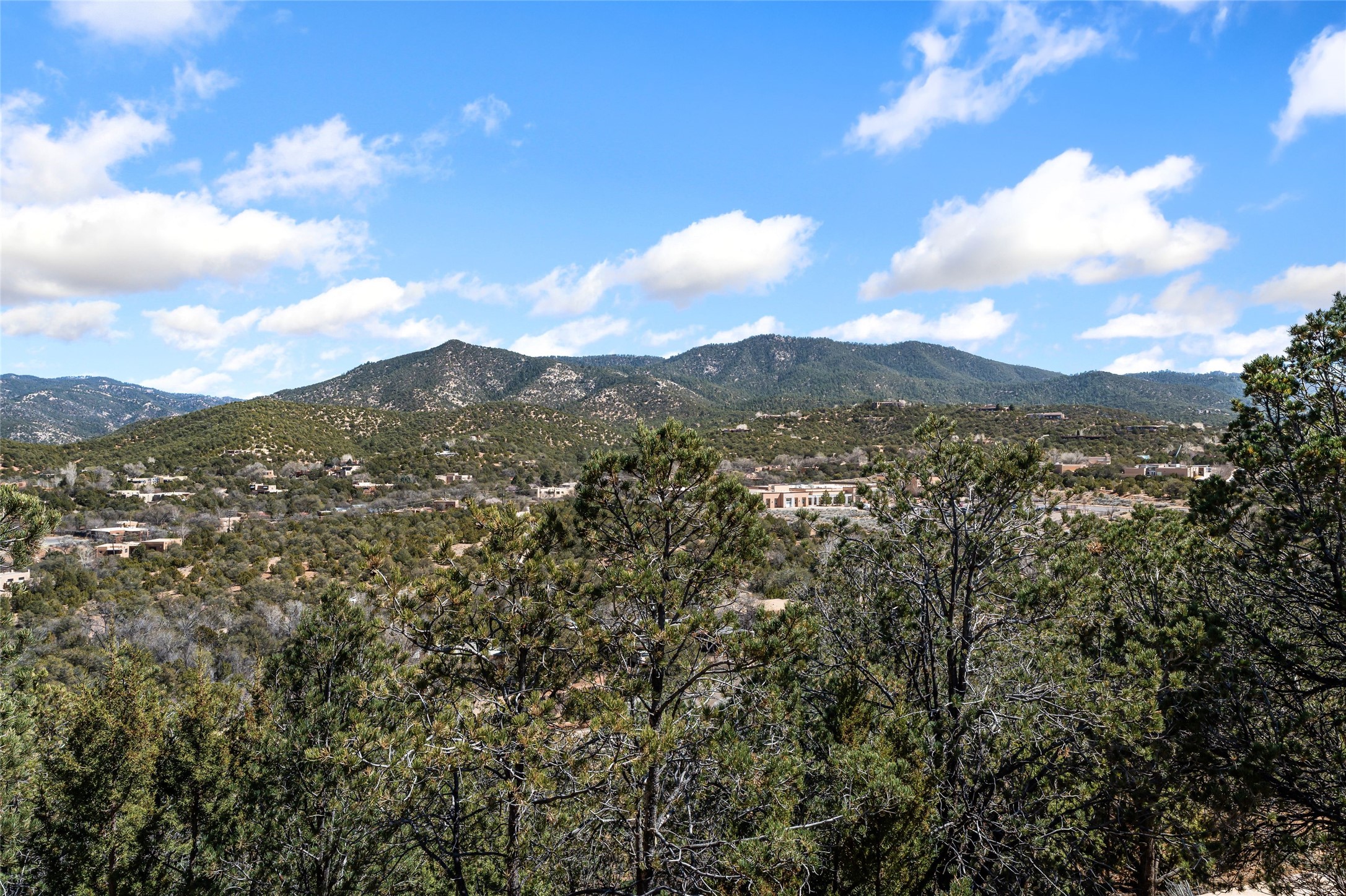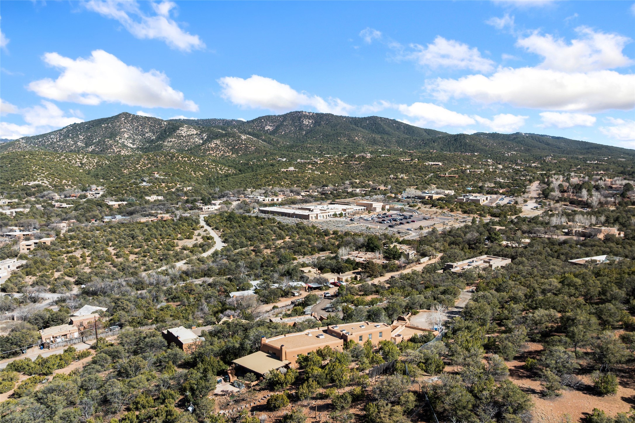 Are you looking for a big view house minutes from Canyon Rd and the Plaza? Villa Bettina is perched on a hillside on over 1.5 acres overlooking Canyon Rd and the Historic Eastside with huge Sangre Mountain views as well as spectacular views of Piccacho, Atalaya, Sun & Moon Mountains out every window! The front entry divides the house between the primary bedroom suite and public living spaces. This custom one-owner home is a rastra build with concrete floors, radiant heat and a beautiful open concept great room for kitchen, living and dining with high ceilings featuring vigas & latillas, a kiva fireplace and numerous French doors opening to the front of the house and covered portal. The covered portal with a kiva fireplace is a wonderful setting to enjoy indoor/outdoor living and to soak up the magnificent views of the mountains and city lights. An efficiently designed kitchen with the best kitchen window view in town, granite counters, breakfast bar, gas stove, Sub Zero fridge and a unique carved lintel with bees and honeycomb is perfectly placed to interact with all the happenings of life in the great room. The primary bedroom suite includes a full bath with river rock enclosed soaking tub and shower, an exercise/spa room with sauna, private South-facing enclosed patio (also accessible from the driveway) and home office. The wooden stairs ascending from the entry foyer feature a hand-crafted metal handrail made by MacArthur Fellow Tom Joyce (as was the hardware on the handcrafted front door) leading up to a guest bedroom, bath, office space and fun, special, secret loft. The guest casita, just down a little walkway from the house is frame and stucco with a full kitchen and bath, plenty of storage, a kiva fireplace in the main living space and a view-filled covered front portal. With a path that leads all around the house and property one can also climb up to the top of the hill for sunset vistas.