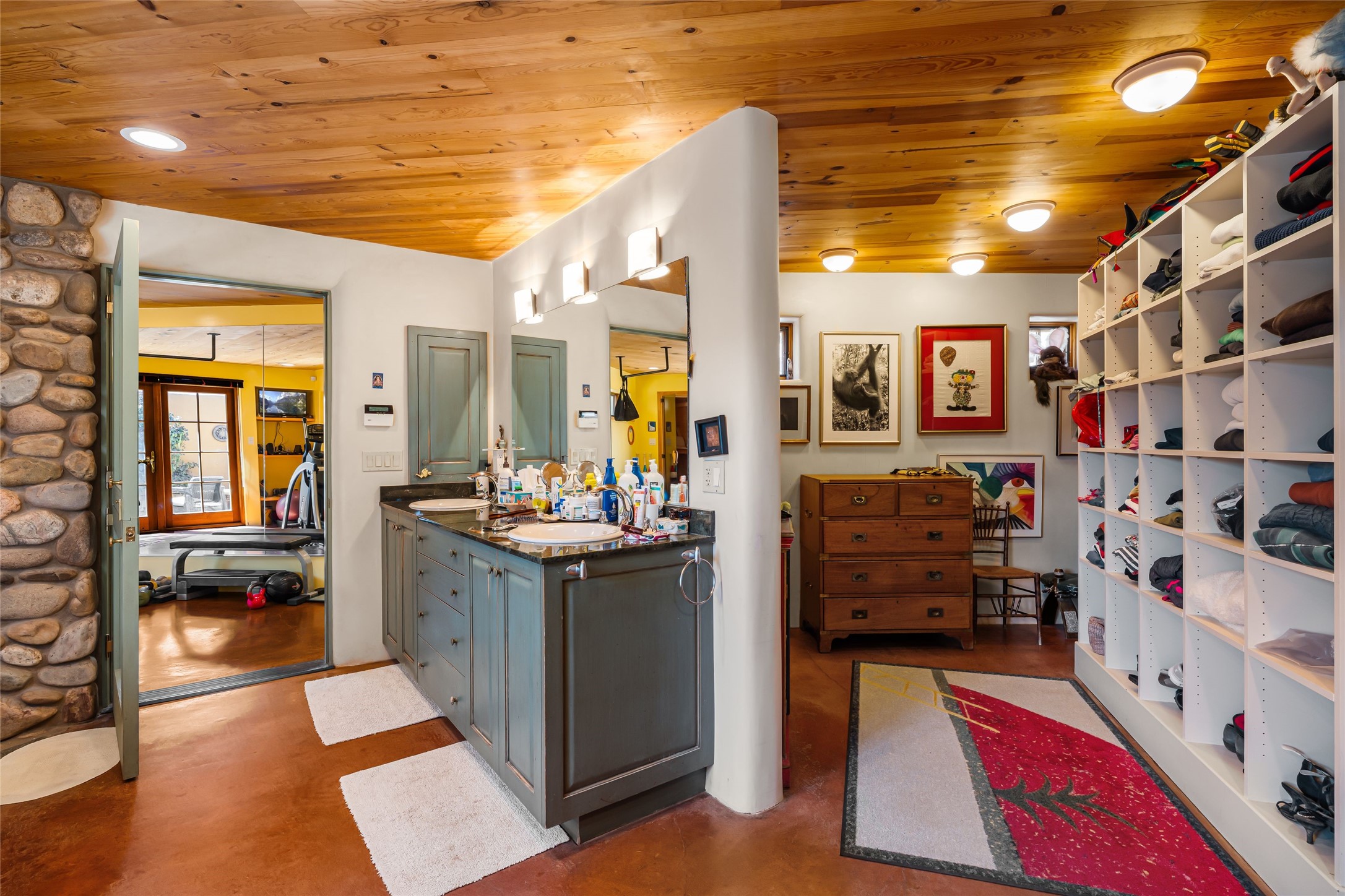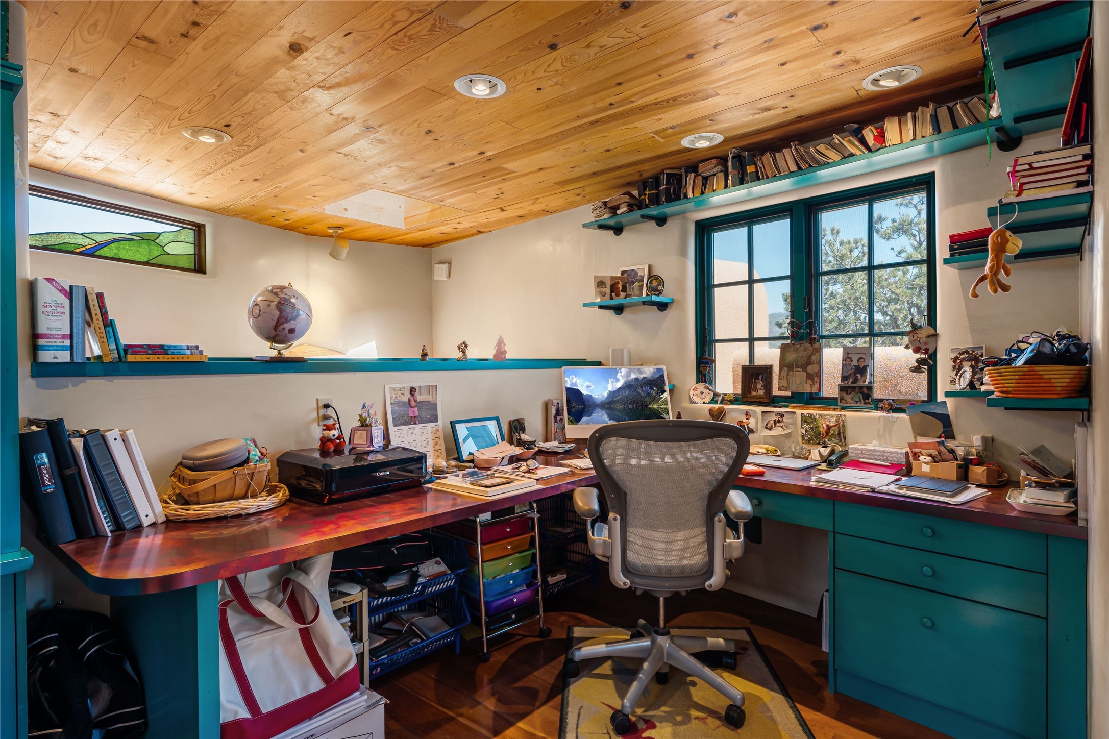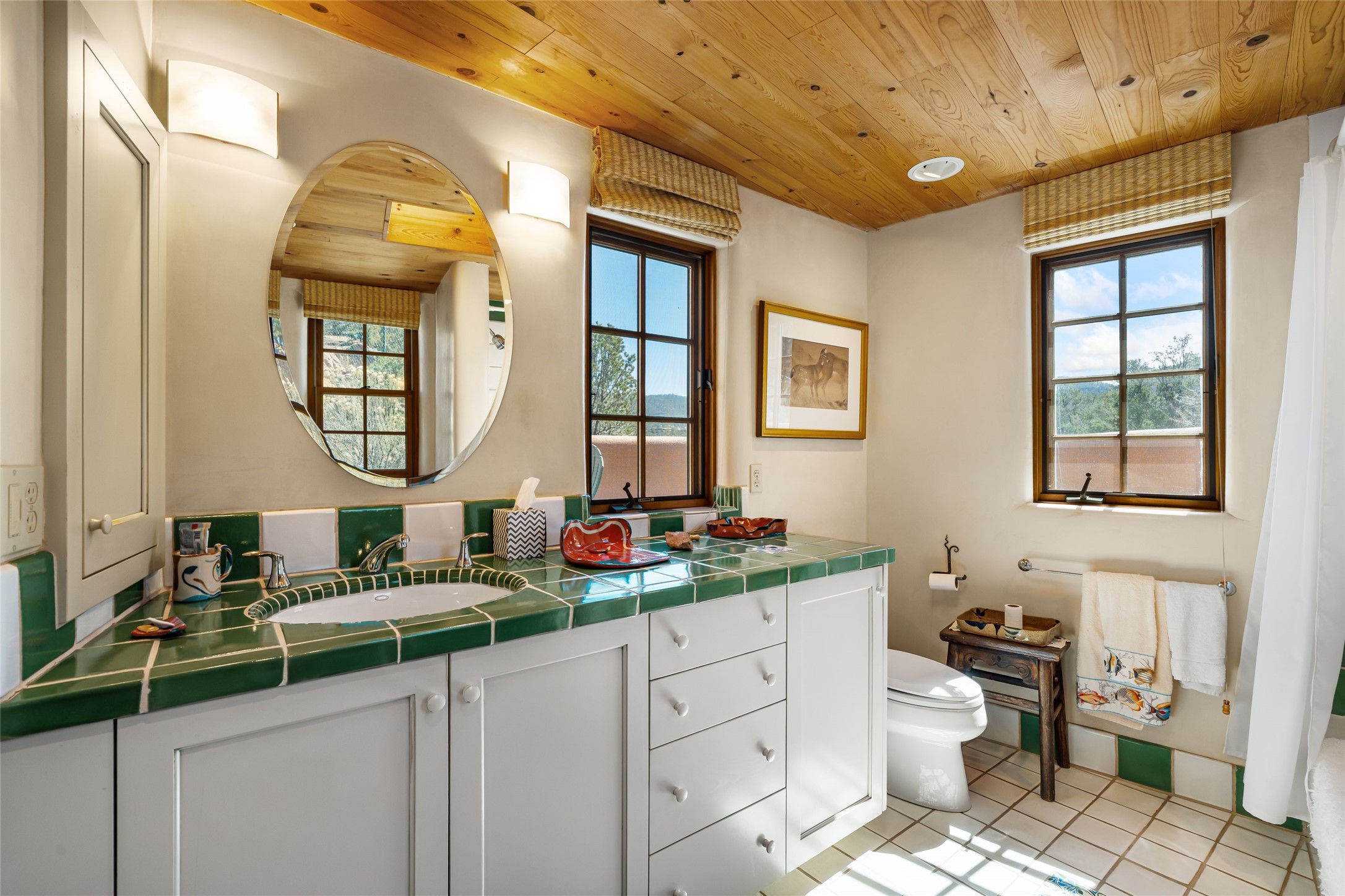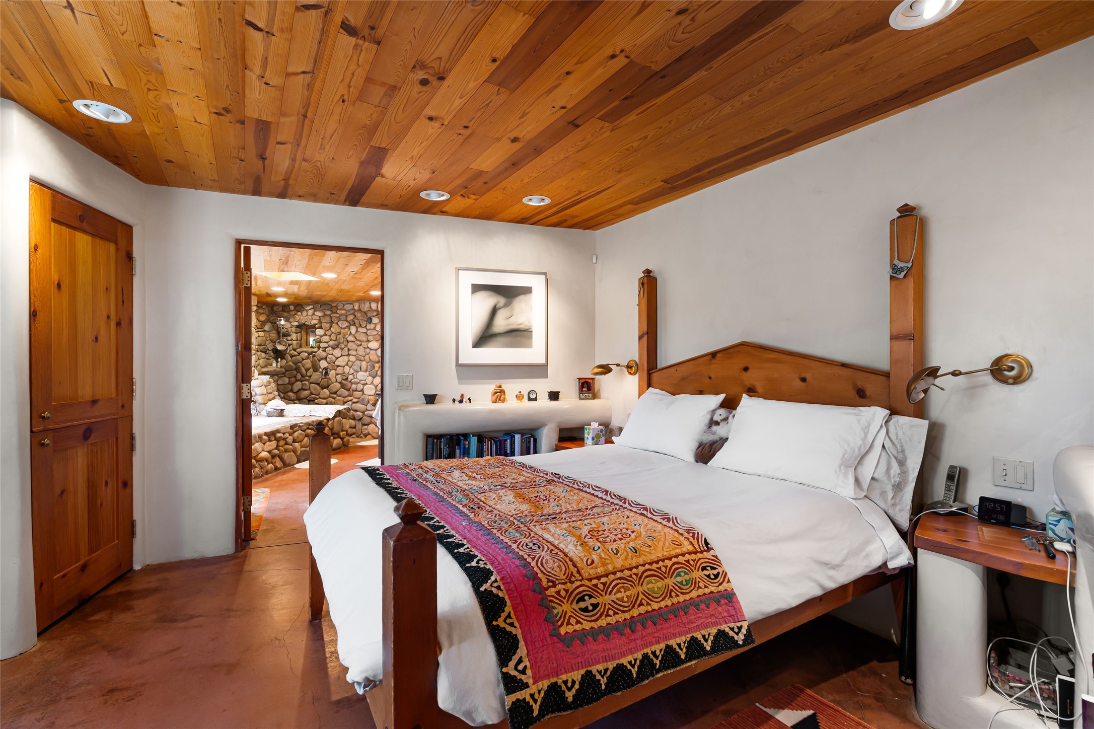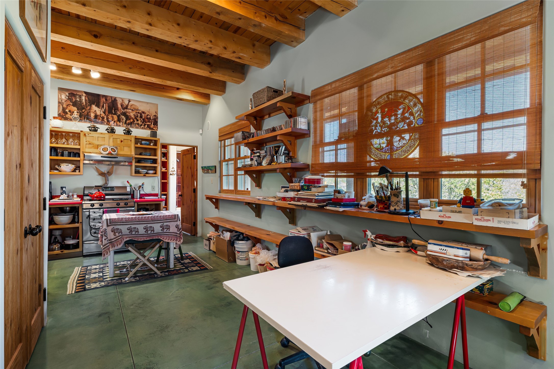 Are you looking for a big view house minutes from Canyon Rd and the Plaza? Villa Bettina is perched on a hillside on over 1.5 acres overlooking Canyon Rd and the Historic Eastside with huge Sangre Mountain views as well as spectacular views of Piccacho, Atalaya, Sun & Moon Mountains out every window! The front entry divides the house between the primary bedroom suite and public living spaces. This custom one-owner home is a rastra build with concrete floors, radiant heat and a beautiful open concept great room for kitchen, living and dining with high ceilings featuring vigas & latillas, a kiva fireplace and numerous French doors opening to the front of the house and covered portal. The covered portal with a kiva fireplace is a wonderful setting to enjoy indoor/outdoor living and to soak up the magnificent views of the mountains and city lights. An efficiently designed kitchen with the best kitchen window view in town, granite counters, breakfast bar, gas stove, Sub Zero fridge and a unique carved lintel with bees and honeycomb is perfectly placed to interact with all the happenings of life in the great room. The primary bedroom suite includes a full bath with river rock enclosed soaking tub and shower, an exercise/spa room with sauna, private South-facing enclosed patio (also accessible from the driveway) and home office. The wooden stairs ascending from the entry foyer feature a hand-crafted metal handrail made by MacArthur Fellow Tom Joyce (as was the hardware on the handcrafted front door) leading up to a guest bedroom, bath, office space and fun, special, secret loft. The guest casita, just down a little walkway from the house is frame and stucco with a full kitchen and bath, plenty of storage, a kiva fireplace in the main living space and a view-filled covered front portal. With a path that leads all around the house and property one can also climb up to the top of the hill for sunset vistas.