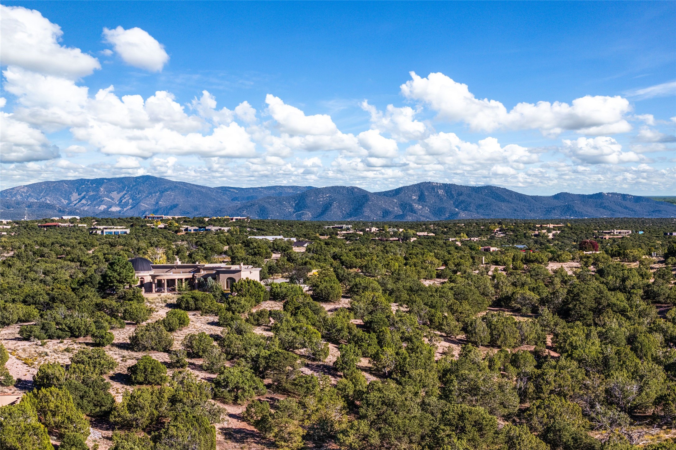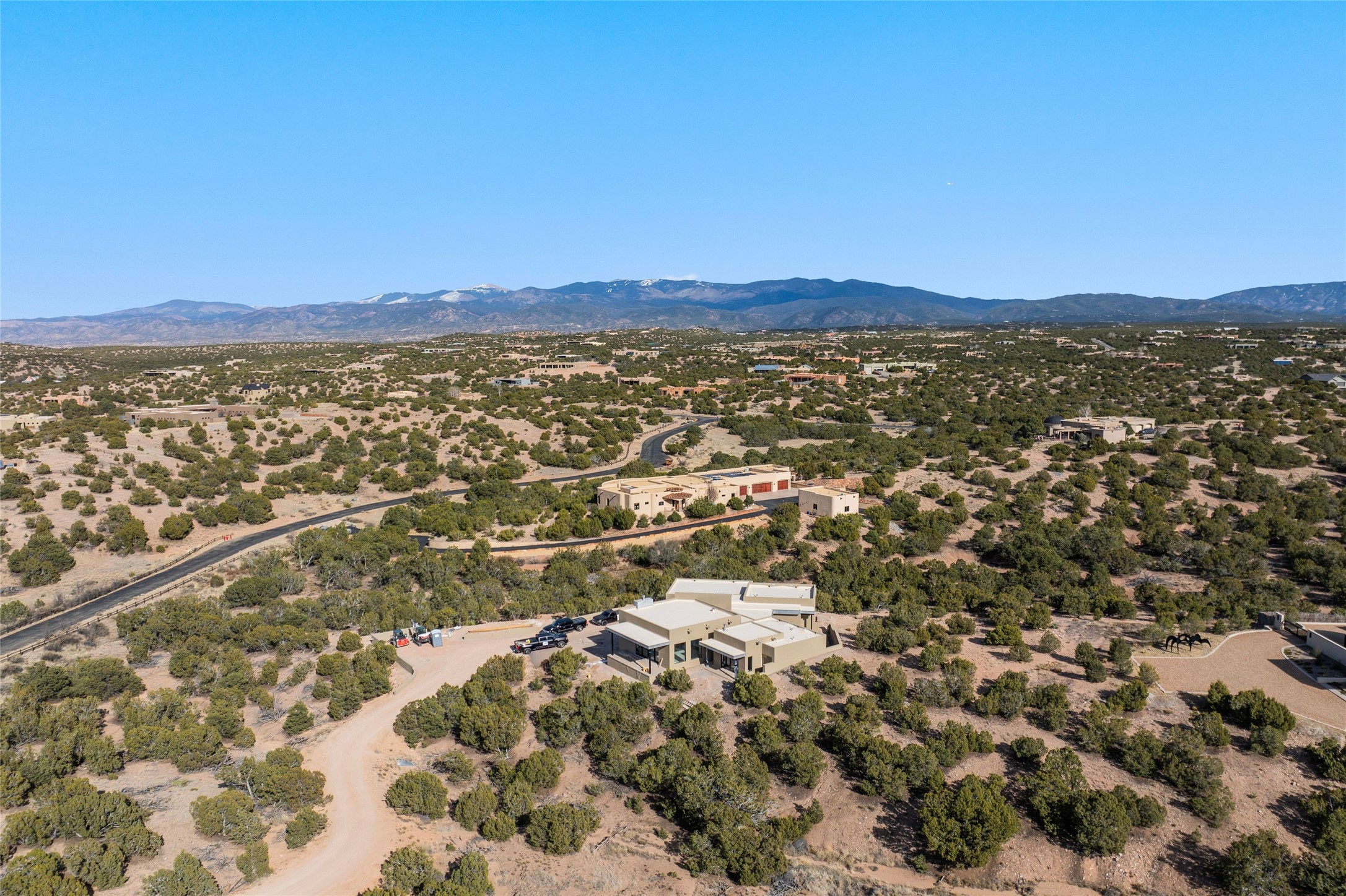 This stunning, soon to be completed, 3-bedroom 3.5 bath single-level Contemporary home by award-winning Montoya Custom Builders is located in the exclusive Las Cordilleras community, offering sweeping views of the Jemez Mountains. Set on 2.9+ acres, the home is elevated to maximize panoramic vistas and provide an ideal balance of privacy and modern luxury. The open-concept living area is flooded with natural light and features warm wood flooring, exposed beams, and smooth plaster walls that blend contemporary style with timeless charm. The chef's kitchen will be appointed with top-tier Wolf and Sub-Zero appliances, perfect for culinary creations. Featuring 3 spacious bedrooms, each with its own en-suite bath, the home is designed for both comfort and privacy. The primary suite is a true sanctuary, complete with a gas fireplace insert, a soaking tub with mountain views, and radiant floor heating. The thoughtfully designed floor plan separates the owner's suite from the guest bedrooms, ensuring a peaceful, private retreat. The home is equipped with radiant floor heating, forced air cooling, and a gas fireplace inserts to ensure year-round comfort. An enclosed courtyard provides a peaceful outdoor escape, while the elevated positioning of the home offers unmatched vistas. Located just 15 minutes from Santa Fe, this property combines the tranquility of rural living with easy access to city amenities. A new septic system, shared well, and a two-car garage add to the home's convenience and sustainability. This exceptional new build is the perfect blend of modern luxury and natural beauty.