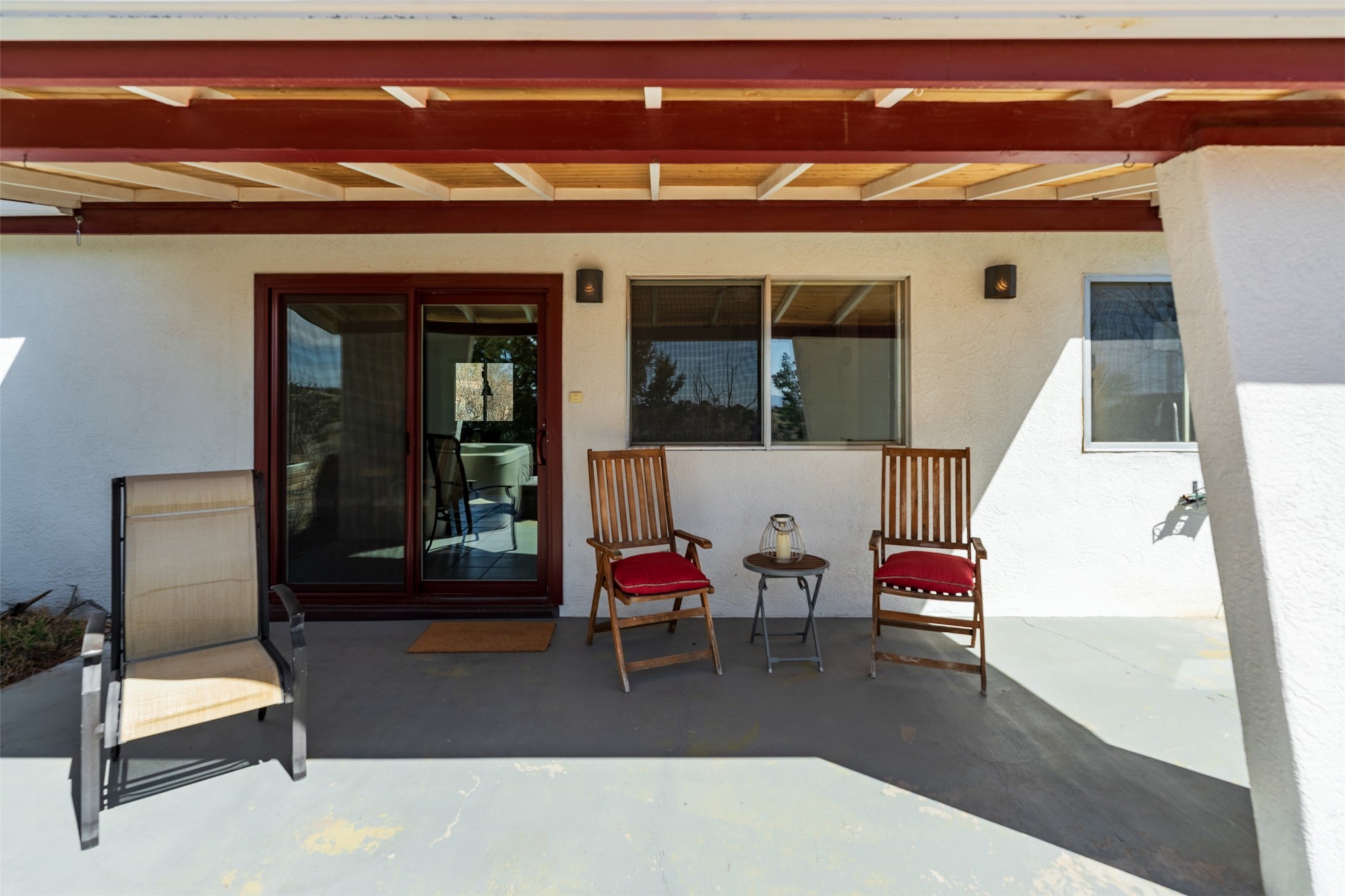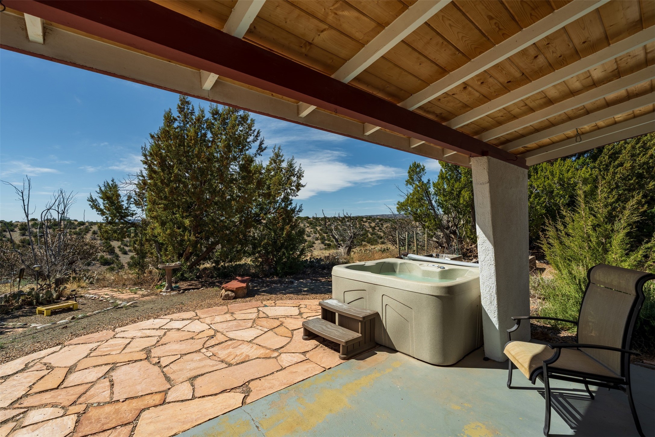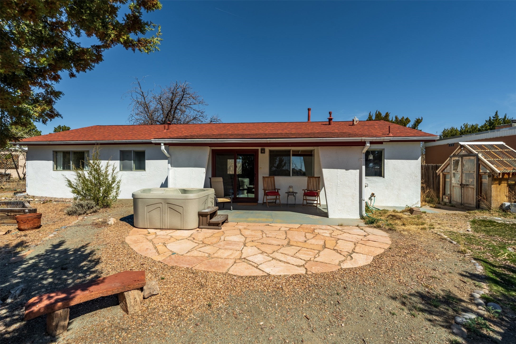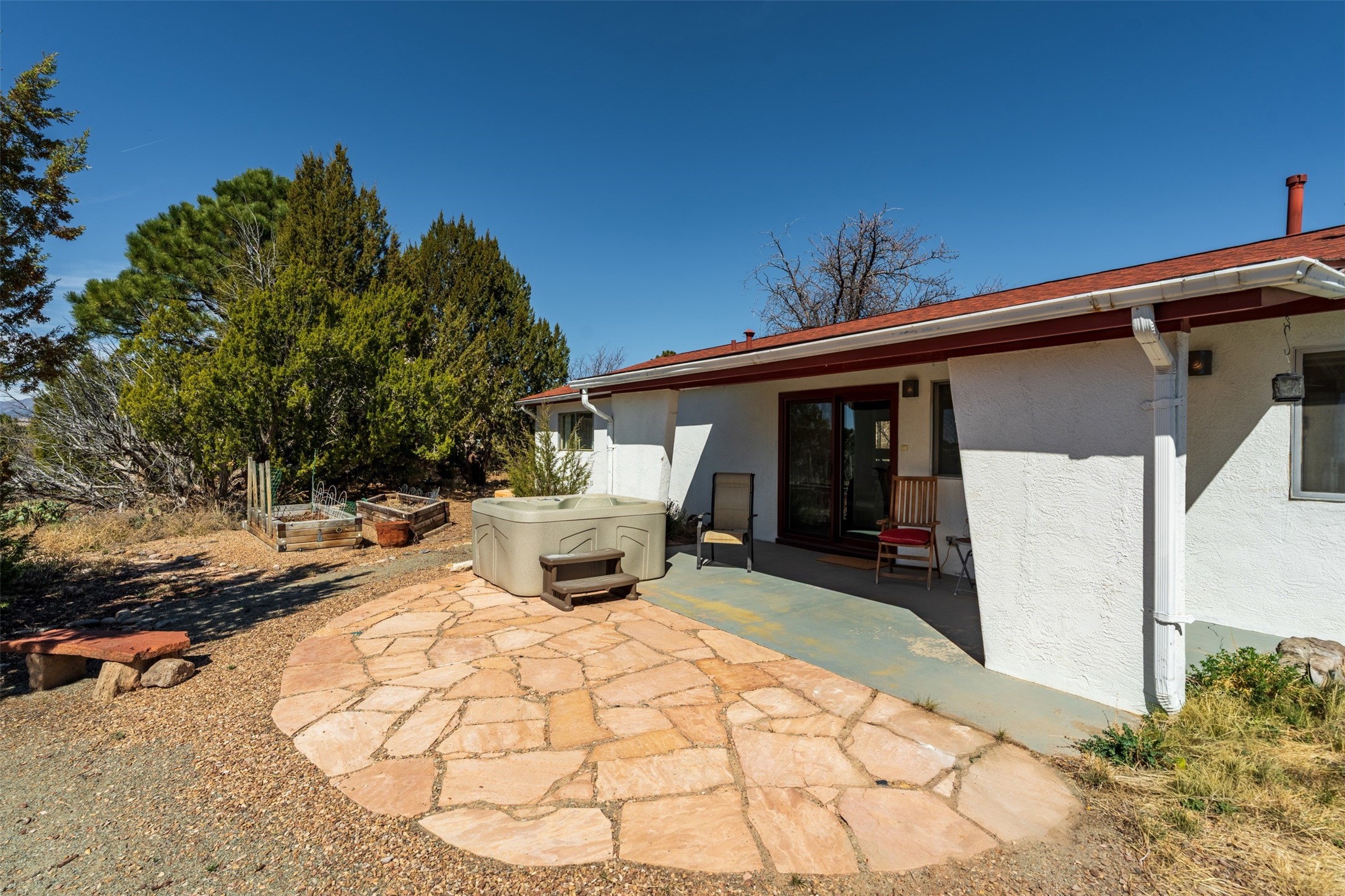 At 6445 Vooscane, the view is the headline. The backyard opens east toward the Sandia Mountains, where the landscape stretches across the Rio Grande valley in a wide, uninterrupted sweep of desert and sky. Morning light reaches the peaks first, and evenings bring the deep pink and purple hues the Sandias are known for.The move-in ready home offers approximately 1,250 square feet of comfortable, easy-to-maintain living space. Large windows frame the surrounding landscape, keeping the mountains present in everyday life. The scale is manageable yet comfortable, creating a home that feels easy to live in and connected to its remarkable natural setting.A covered rear portal provides a perfect place to take in the view--morning coffee, a quiet afternoon with a book, or dinner outside as the mountains shift color in the evening light. An adjacent hot tub, which conveys with the property, is the perfect place to unwind. Raised garden beds and a small gardening hutch add a practical outdoor touch.Cochiti Lake is a quiet, established community between Santa Fe and Albuquerque known for its open skies, dramatic scenery, and access to hiking, the lake, and nearby destinations like Tent Rocks and Bandelier National Monument.