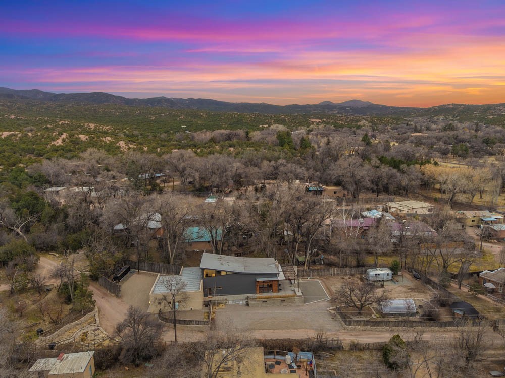Discover a Scandi-Modern sanctuary where architectural precision meets the organic beauty of the Tesuque Valley. This 3-bed, 2-bath retreat offers a lifestyle of quiet luxury and environmental harmony. Located on a lush .84-acre lot along a private gated road, you are perfectly positioned just 10 minutes from downtown Santa Fe while remaining steps away from hiking trails, the iconic Tesuque Village Market, and fine dining at El Nido.Evolution of Design: This home is a masterclass in modern reconstruction. While the original steel structure dates to 1967, the home was meticulously rebuilt from the framing and foundation up in 2006. Further architectural expansions followed in 2010 and 2016, adding a garage, custom patios, and a sophisticated "pop-top" second story. The exterior is a striking composition of steel panels, smooth stucco, and a seamless, high-durability pro-panel metal roof. Inside, the "Scandi" influence is felt through soaring ceilings and expansive clear-view windows that invite the outside in, framing glorious high-desert sunsets and the region's famous dark skies.The interior boasts high-end, tactile finishes including polished concrete and tile flooring, sleek concrete countertops, and modern European cabinetry. A main-floor primary suite ensures long-term accessibility and ease of living. For year-round climate control, the home is equipped with efficient ductless mini-split HVAC units and a cozy gas fireplace, ensuring comfort regardless of the season.The grounds are a rare find with a running acequia with valuable transferable water rights. This is a true gardener's paradise, complete with a 10x20 powered greenhouse, an electric-equipped chicken coop, and a productive orchard of apricot, pear, and apple trees--all supported by a comprehensive drip irrigation system. Outdoor living is redefined by a wrapped patio with a custom steel portal. With a private well and septic, this property offers the ultimate in autonomy and modern elegance.