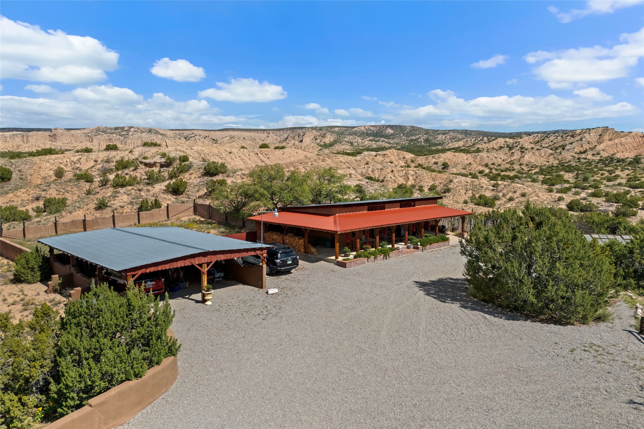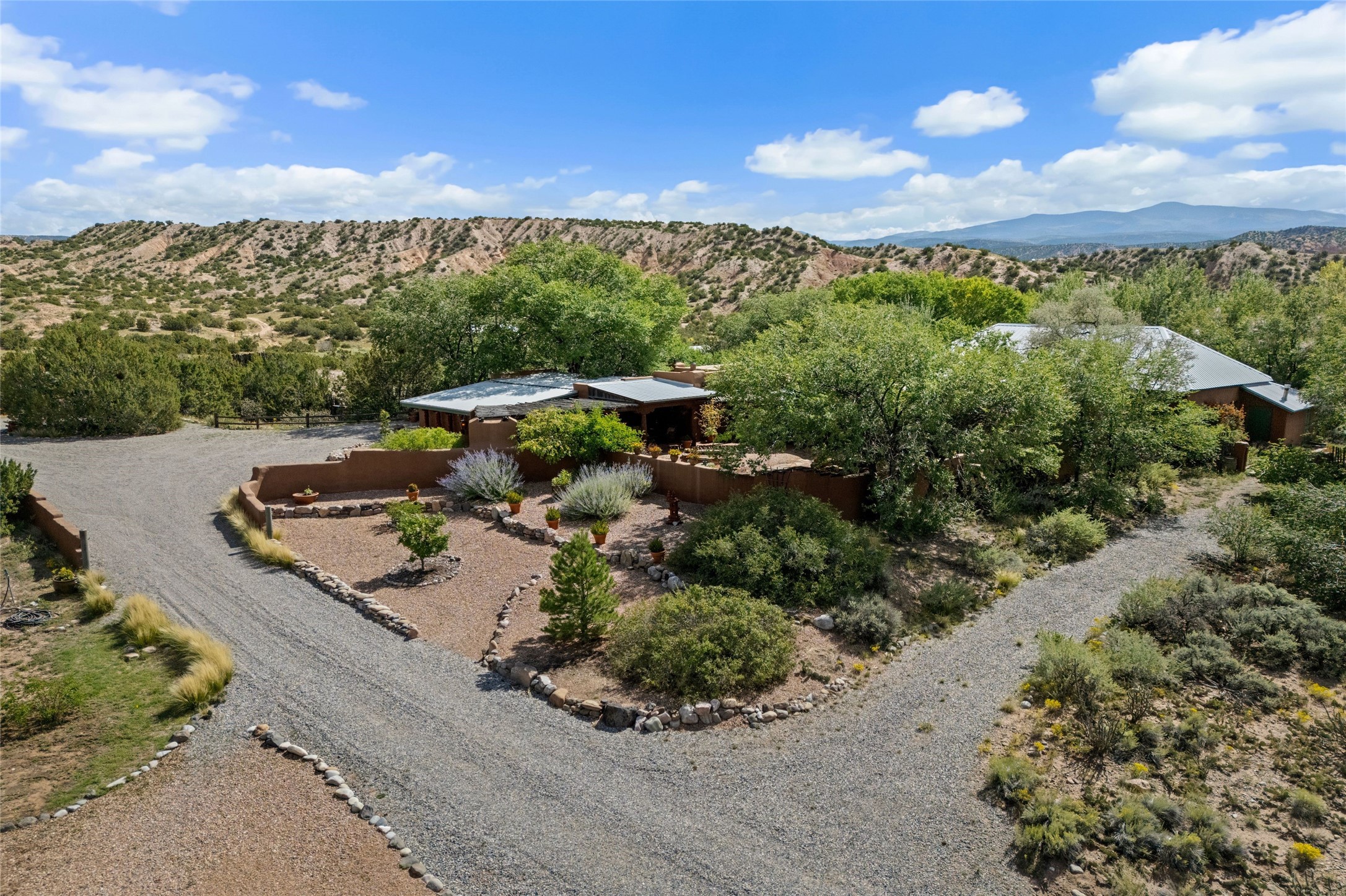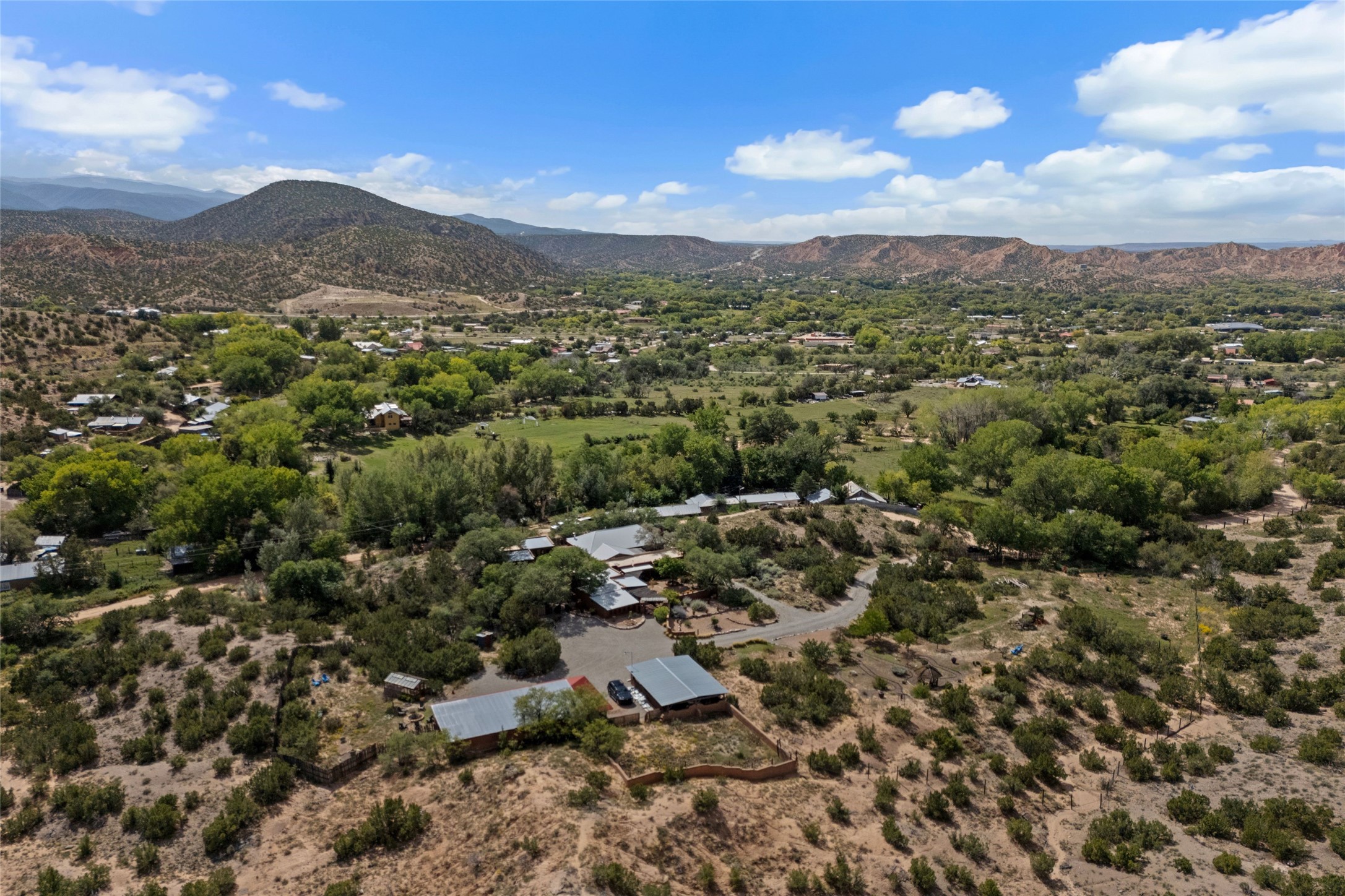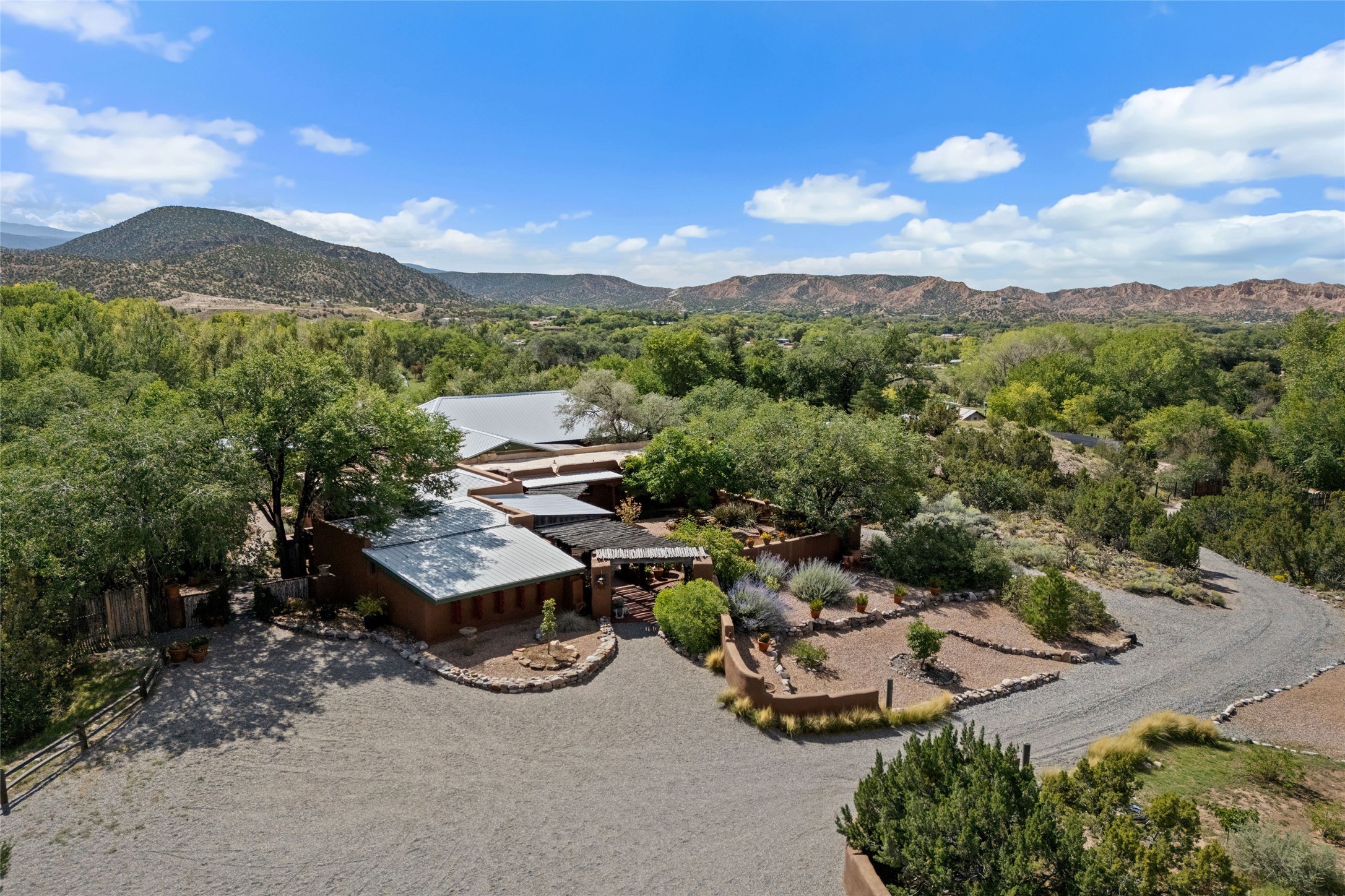 Rare opportunity to own your own private retreat and sanctuary on just under 7 acres in the historic village of Chimay. Nestled in the foothills of the Sangre de Cristo Mountains, within easy commuting distance to either Los Alamos or Santa Fe, this hilltop, gated hacienda is located on a tranquil tree-lined country road. The 3-bedroom, 2-bath property is surrounded by gardens, courtyards and a lovely orchard. Quality construction, utilities, and finishings throughout. Traditional Spanish and Pueblo design filled with vigas and beams, stone, tile and brick floors, 4 kiva fireplaces, nichos, bancos, and multiple portales. Two living areas provide room for both privacy and gatherings. Formal dining room for special occasion meals or cozy dinners at home. Chefs will enjoy the impressive kitchen with granite counters, wood and glass cabinets, and breakfast nook with banco. There is a studio/office with wine room in a detached building. Outdoor parties under the New Mexican sun and starlit nights? The extensive portal attached to the spacious shop building and adjacent firepit provide the perfect setting. Bonus features include a greenhouse for gardeners, carport, and new septic installed in 2025. Other features include combination subfloor and mini-split heating, top-quality Andersen windows throughout, Northern NM style peaked and silicon-sealed flat roofs, a community potable water system, and a brand new irrigation well. For those who are seeking a peaceful country home with authentic New Mexico character, this is a rare find. Chimay is a special place, known for the National Historic Landmark Santuario de Chimay, numerous weaving shops, and the famous Rancho de Chimay restaurant.