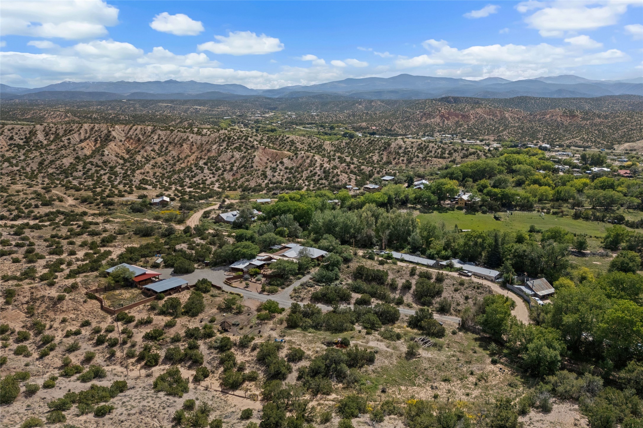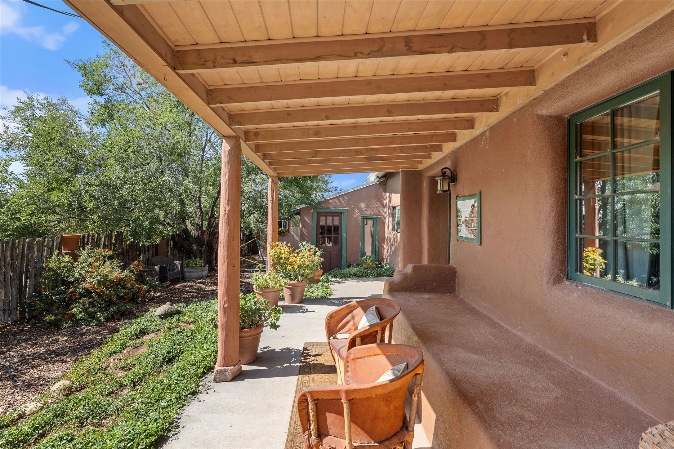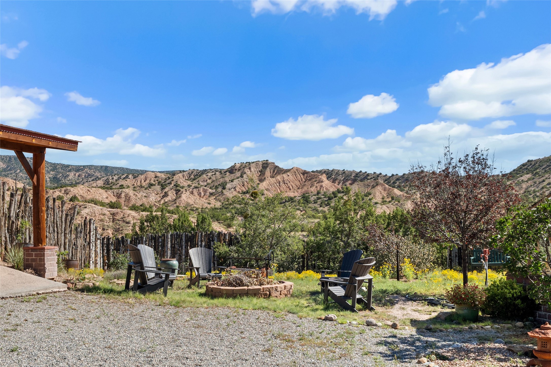 Rare opportunity to own your own private retreat and sanctuary on just under 7 acres in the historic village of Chimay. Nestled in the foothills of the Sangre de Cristo Mountains, within easy commuting distance to either Los Alamos or Santa Fe, this hilltop, gated hacienda is located on a tranquil tree-lined country road. The 3-bedroom, 2-bath property is surrounded by gardens, courtyards and a lovely orchard. Quality construction, utilities, and finishings throughout. Traditional Spanish and Pueblo design filled with vigas and beams, stone, tile and brick floors, 4 kiva fireplaces, nichos, bancos, and multiple portales. Two living areas provide room for both privacy and gatherings. Formal dining room for special occasion meals or cozy dinners at home. Chefs will enjoy the impressive kitchen with granite counters, wood and glass cabinets, and breakfast nook with banco. There is a studio/office with wine room in a detached building. Outdoor parties under the New Mexican sun and starlit nights? The extensive portal attached to the spacious shop building and adjacent firepit provide the perfect setting. Bonus features include a greenhouse for gardeners, carport, and new septic installed in 2025. Other features include combination subfloor and mini-split heating, top-quality Andersen windows throughout, Northern NM style peaked and silicon-sealed flat roofs, a community potable water system, and a brand new irrigation well. For those who are seeking a peaceful country home with authentic New Mexico character, this is a rare find. Chimay is a special place, known for the National Historic Landmark Santuario de Chimay, numerous weaving shops, and the famous Rancho de Chimay restaurant.