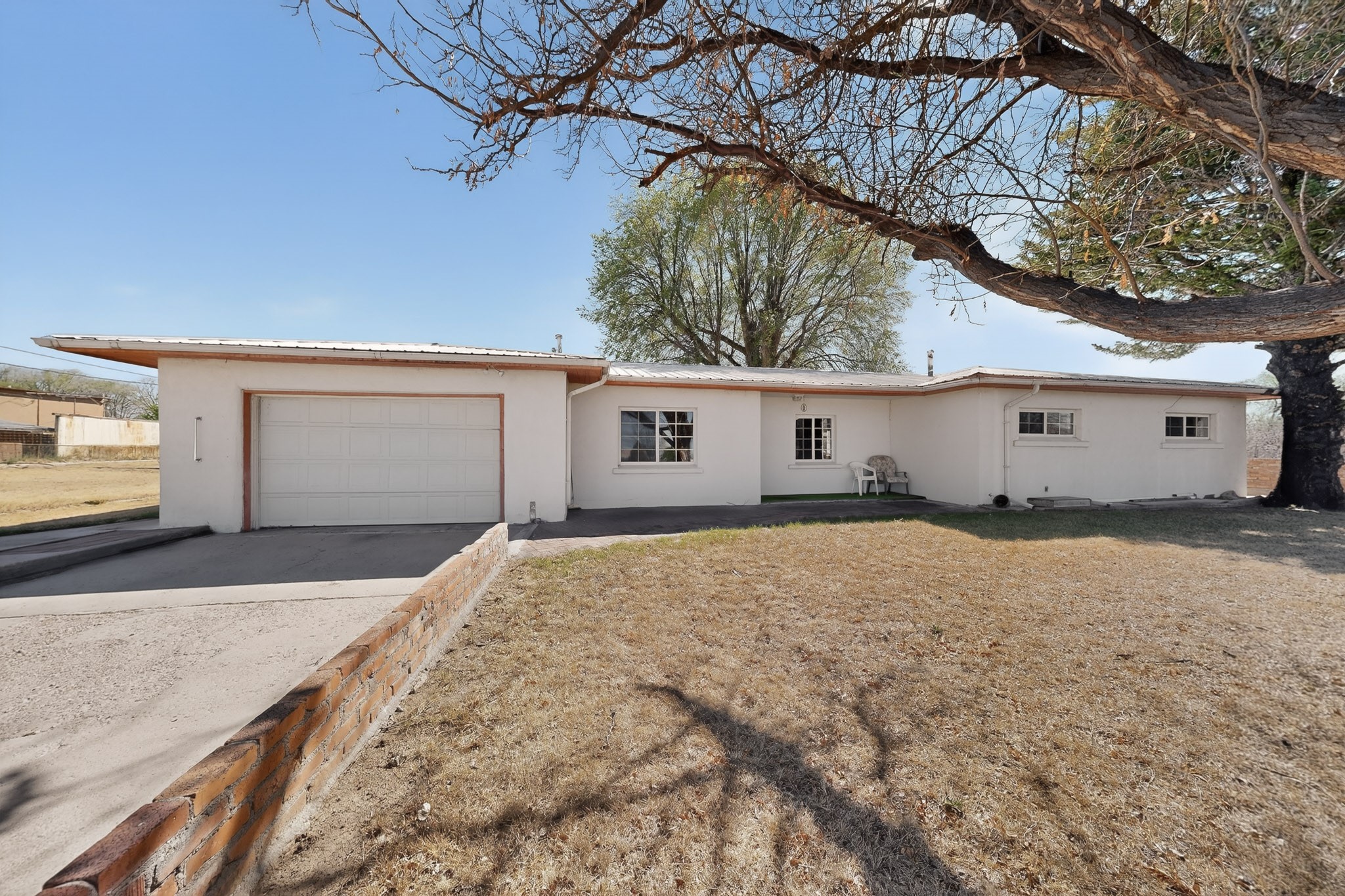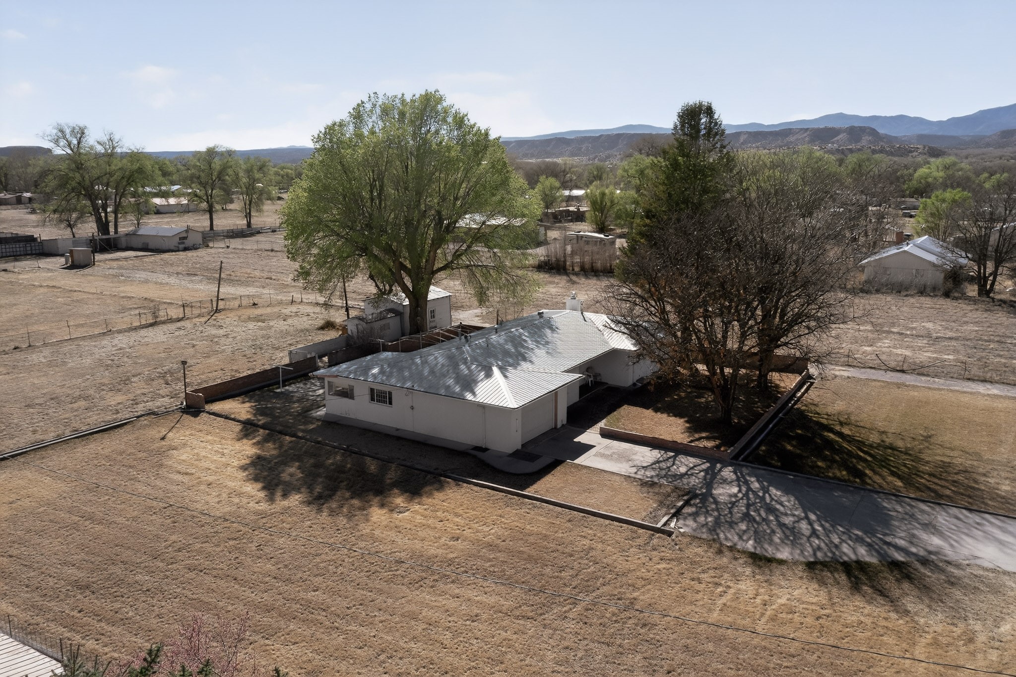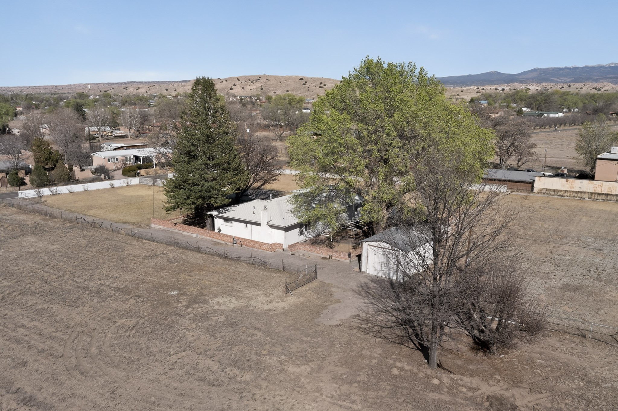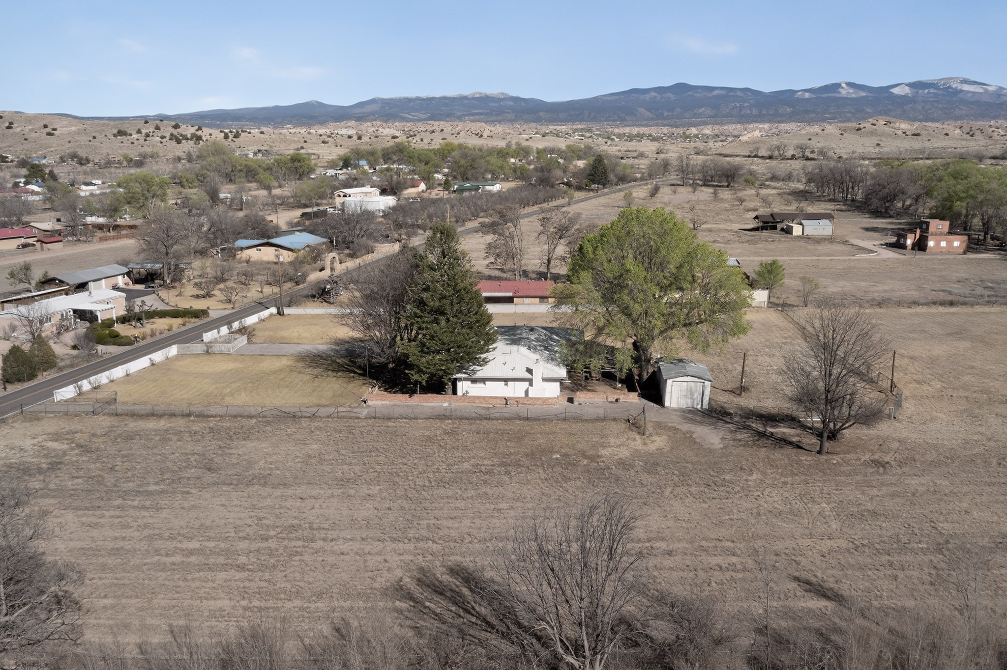 This charming adobe home is ready for its new owners to step inside and appreciate its potential. Featuring original oak wood flooring (currently under carpet), the interior offers a clean slate, allowing a buyer to easily personalize the space. The property includes a two-car garage and a lovely screened-in outdoor porch. The land (3.6 acres) is a fantastic feature, surrounded by mature vegetation. While mostly covered in grass now, it can be readily prepared for planting the buyer's choice of fruits, vegetables, and/or flowers. There is ample space for farm animals. For the avid gardener or farmer, the property is equipped with valuable irrigation rights and a dedicated extra well for working the soil. Outbuildings provide perfect storage for all landscaping and farming tools. This home and land are poised to become a dream dwelling for a family that enjoys a vibrant lifestyle, both indoors and out, surrounded by nature and the things they cherish.
