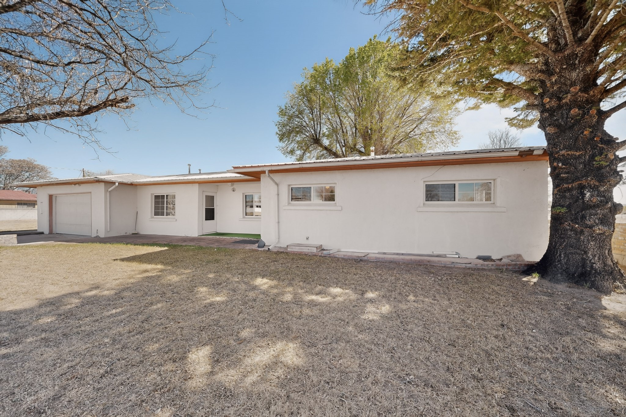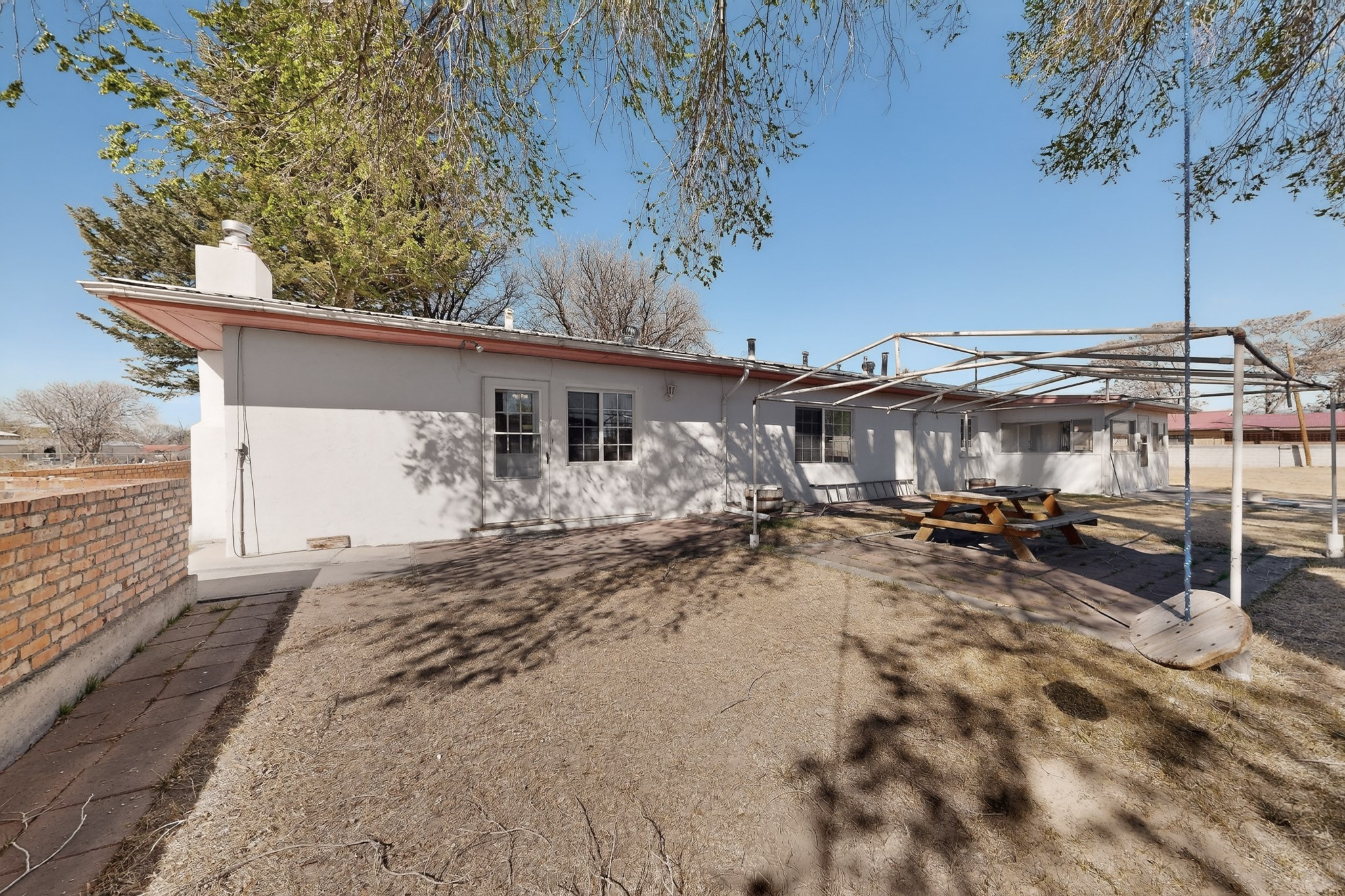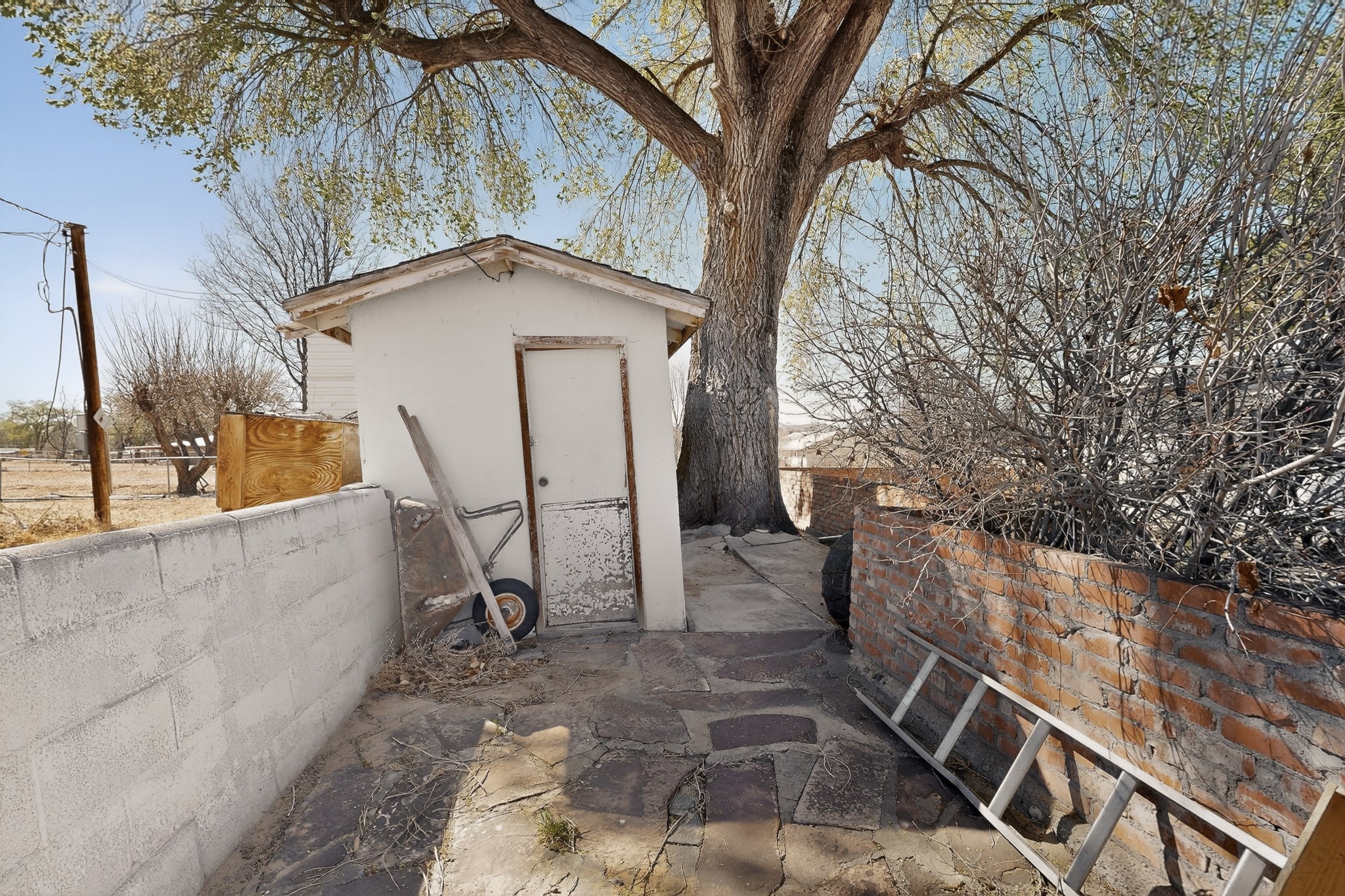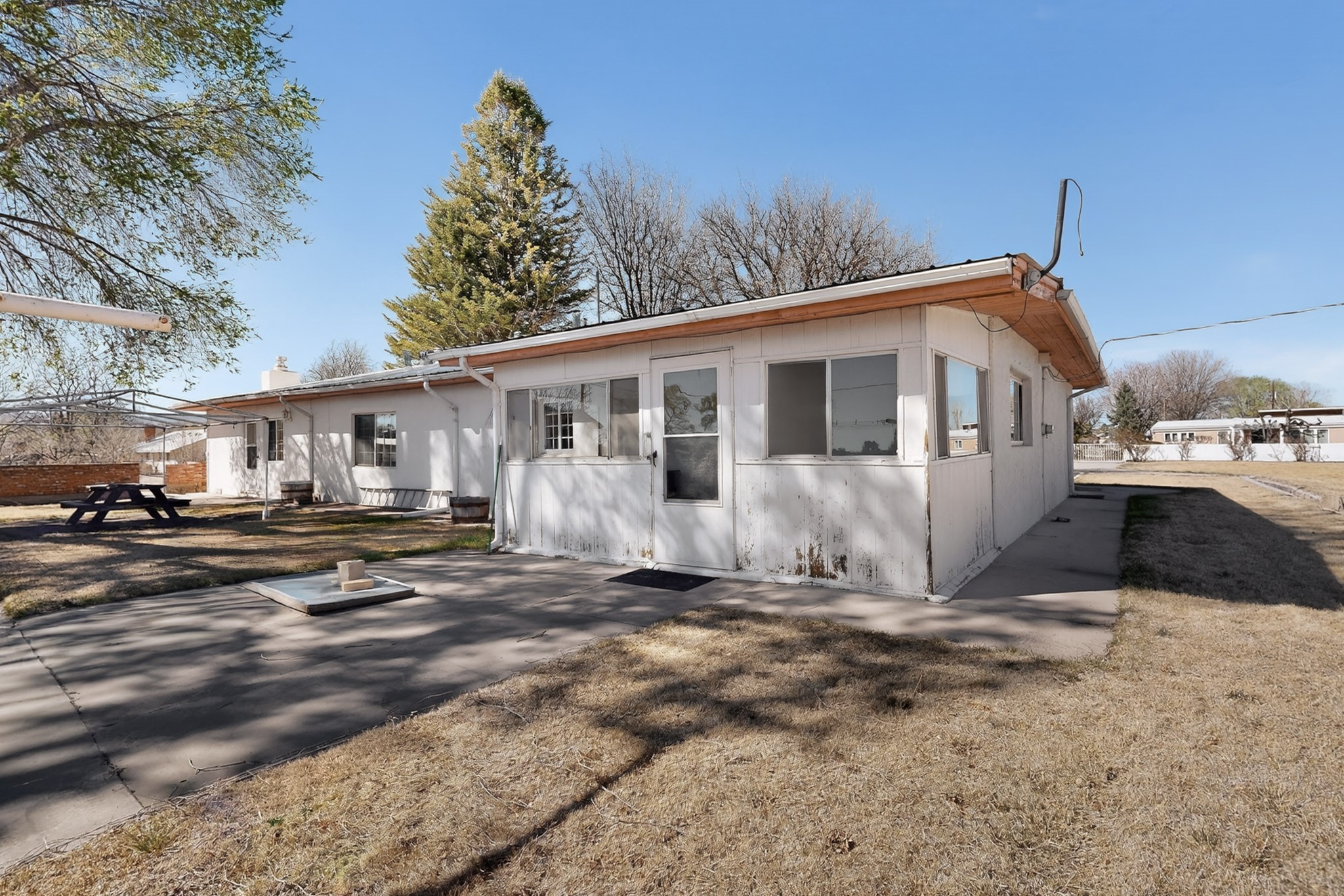 This charming adobe home is ready for its new owners to step inside and appreciate its potential. Featuring original oak wood flooring (currently under carpet), the interior offers a clean slate, allowing a buyer to easily personalize the space. The property includes a two-car garage and a lovely screened-in outdoor porch. The land (3.6 acres) is a fantastic feature, surrounded by mature vegetation. While mostly covered in grass now, it can be readily prepared for planting the buyer's choice of fruits, vegetables, and/or flowers. There is ample space for farm animals. For the avid gardener or farmer, the property is equipped with valuable irrigation rights and a dedicated extra well for working the soil. Outbuildings provide perfect storage for all landscaping and farming tools. This home and land are poised to become a dream dwelling for a family that enjoys a vibrant lifestyle, both indoors and out, surrounded by nature and the things they cherish.