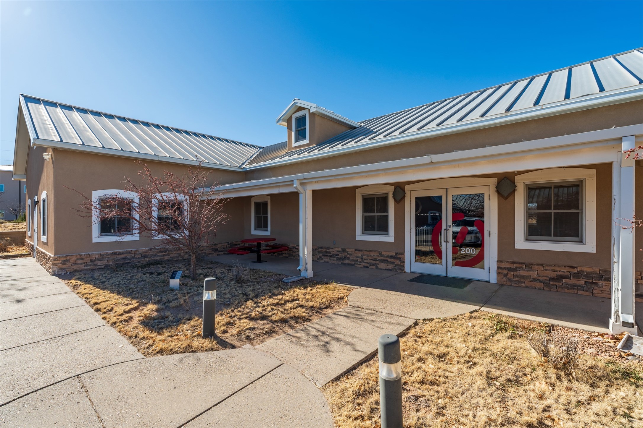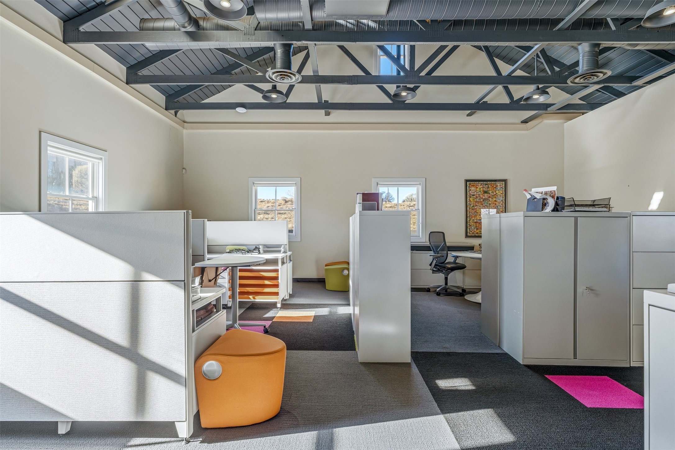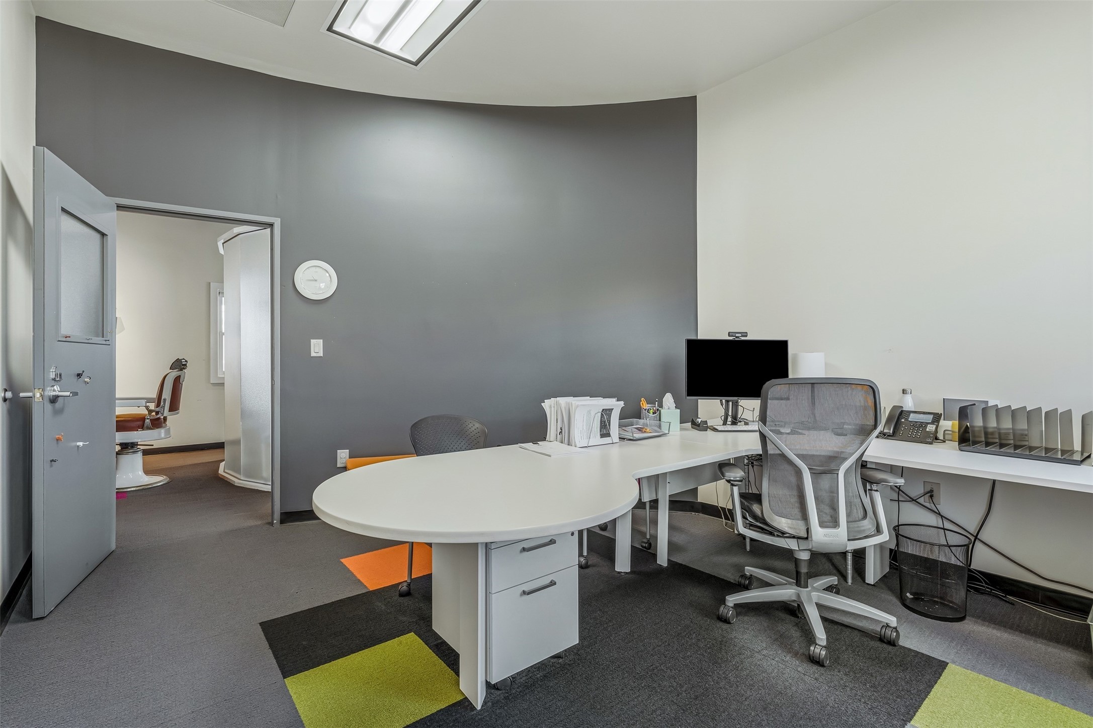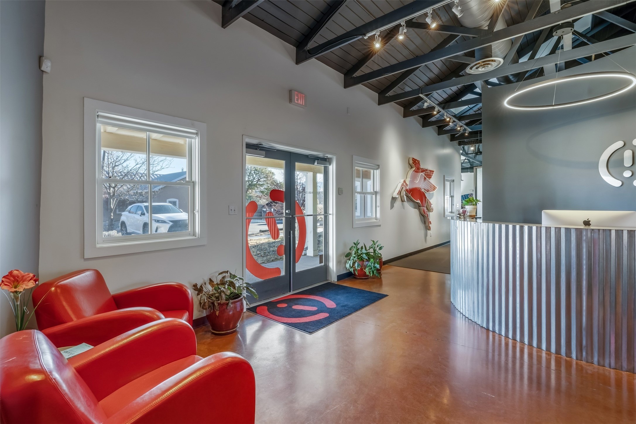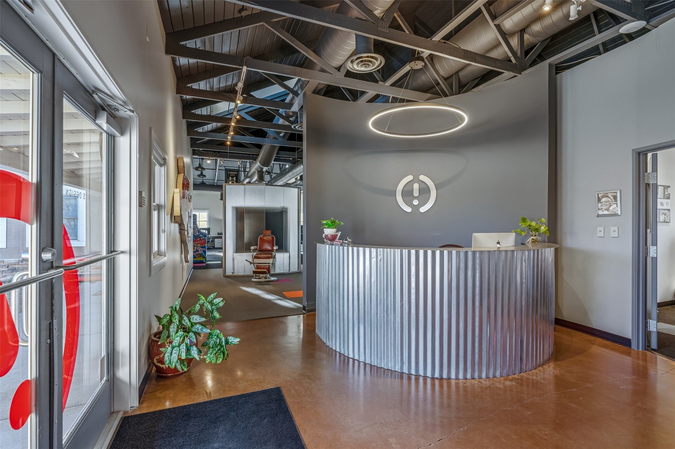 Standalone office building for sale for the first time! This single level office suite features a striking and modern interior designed to make a strong first impression. The space opens into a stylish reception area with polished concrete floors, exposed structural ceilings, and contemporary lighting that creates a bright and creative atmosphere. A curved reception desk anchors the entry, while large openings lead to collaborative meeting spaces, kitchen, conference room and private offices. The layout offers a functional blend of reception, private offices, and open workspace areas, complemented by vibrant design accents and ample natural light. With ADA-accessible entry and convenient ground-floor access, the suite provides excellent usability for clients and staff alike. Ideal for creative, tech, marketing, or professional office users seeking a distinctive and highly accessible workplace. Plenty of parking and an easily accessible in the Rodeo Park Commercial Condominium Business Park! Currently Owner Occupied. Condo dues are $2,048.18/ Quarter and cover exterior maint., master insurance, refuse, parking lot. Owner responsible for their own roof, stucco and HVAC maint. Parking lot was resurfaced in 2025.