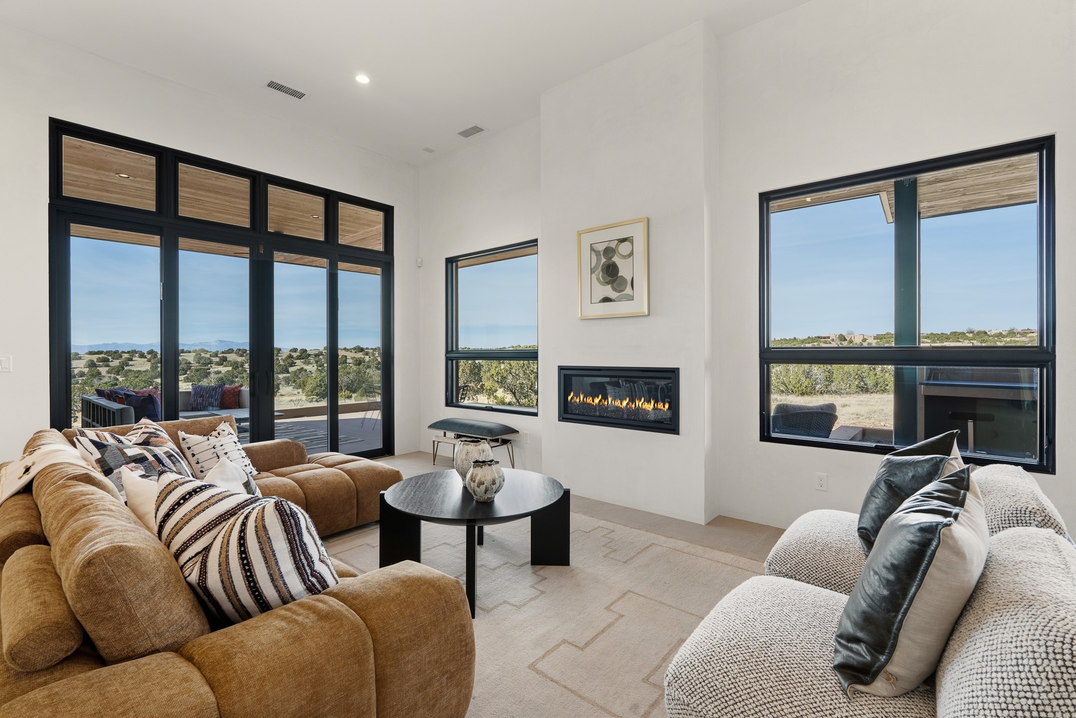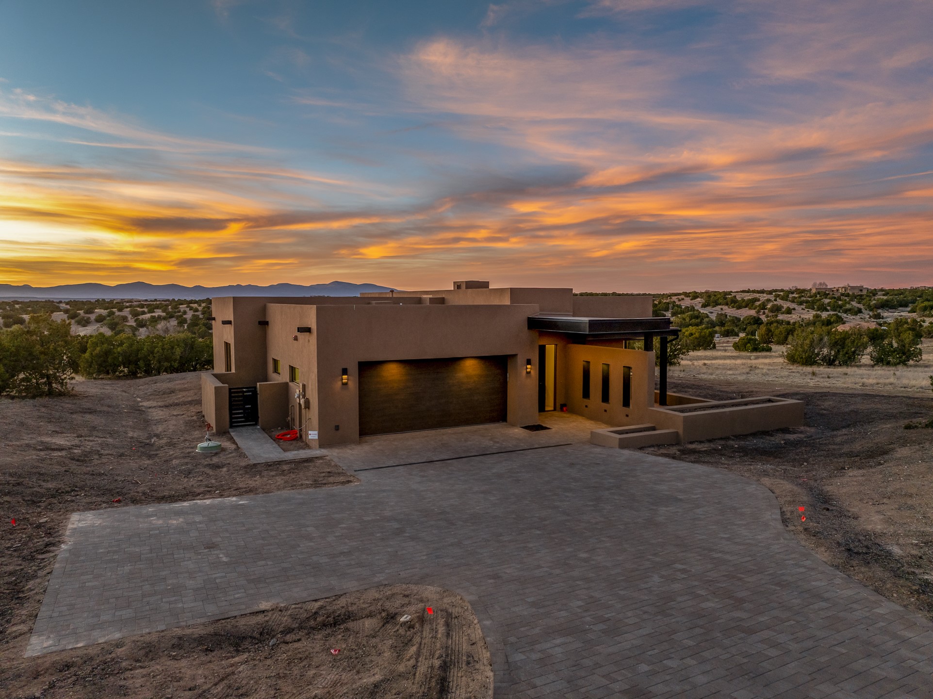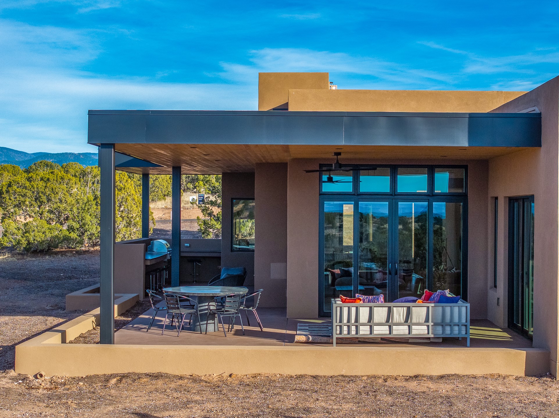 Newly completed and move-in ready, 9 Tierra Antigua (Lot #7) sits within one of Santa Fe's most thoughtfully conceived new communities -- a 44-acre high-desert enclave where more than half the land is preserved as open space, trails wind toward the horizon, and the Sangre de Cristo Mountains frame the morning sky. With homes designed by award-winning firms Five Ten Architecture and studioBOSE, Tierra Antigua honors Northern New Mexico's heritage with a modern eye for light, craft, and quiet luxury. Arete Homes of Santa Fe proudly presents the Stargazer Plan -- a 2,495-square-foot custom residence with 3 bedrooms and 3 baths (including two baths and a powder room). Contemporary Pueblo-style architecture blends seamlessly, capturing sweeping views of both the Jemez and Sangre de Cristo Mountains. A formal entry with expansive art walls and wall-wash skylights creates a gallery-like ambiance. Soaring vaulted ceilings in the great room flow into over 1,100 square feet of covered portal space -- perfect for year-round indoor-outdoor entertaining. The chef's kitchen features natural quartzite countertops, custom white oak cabinetry, a center island with wine refrigerator, and premium GE Monogram appliances including a 48" 6-burner range with griddle and built-in refrigerator. An outdoor kitchen with built-in grill completes the entertaining experience. Luxury finishes throughout include quartzite backsplash, designer sconces, large-format porcelain tile, custom bath tile accents, customized closet systems, and two fireplaces. Located just 15 minutes from downtown Santa Fe and minutes from the Club at Las Campanas, Tierra Antigua offers privacy, natural beauty, and cultural access. Only 23 homesites total. HOA dues are just $167/month. This is more than a home -- it's an entry point into a community designed for those who want to live within Santa Fe's spirit every day. Additional homesites available for custom builds or from five curated plans.
