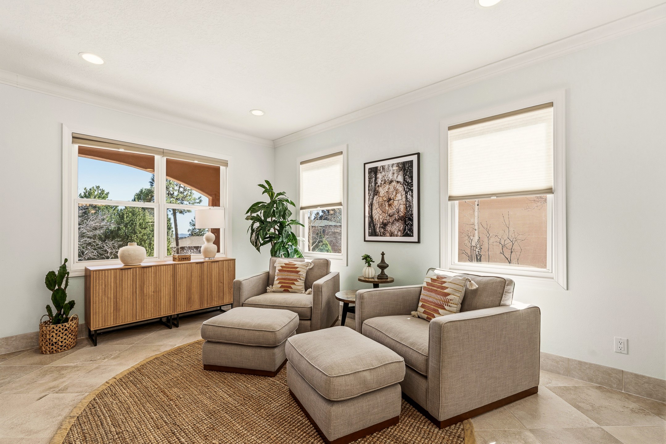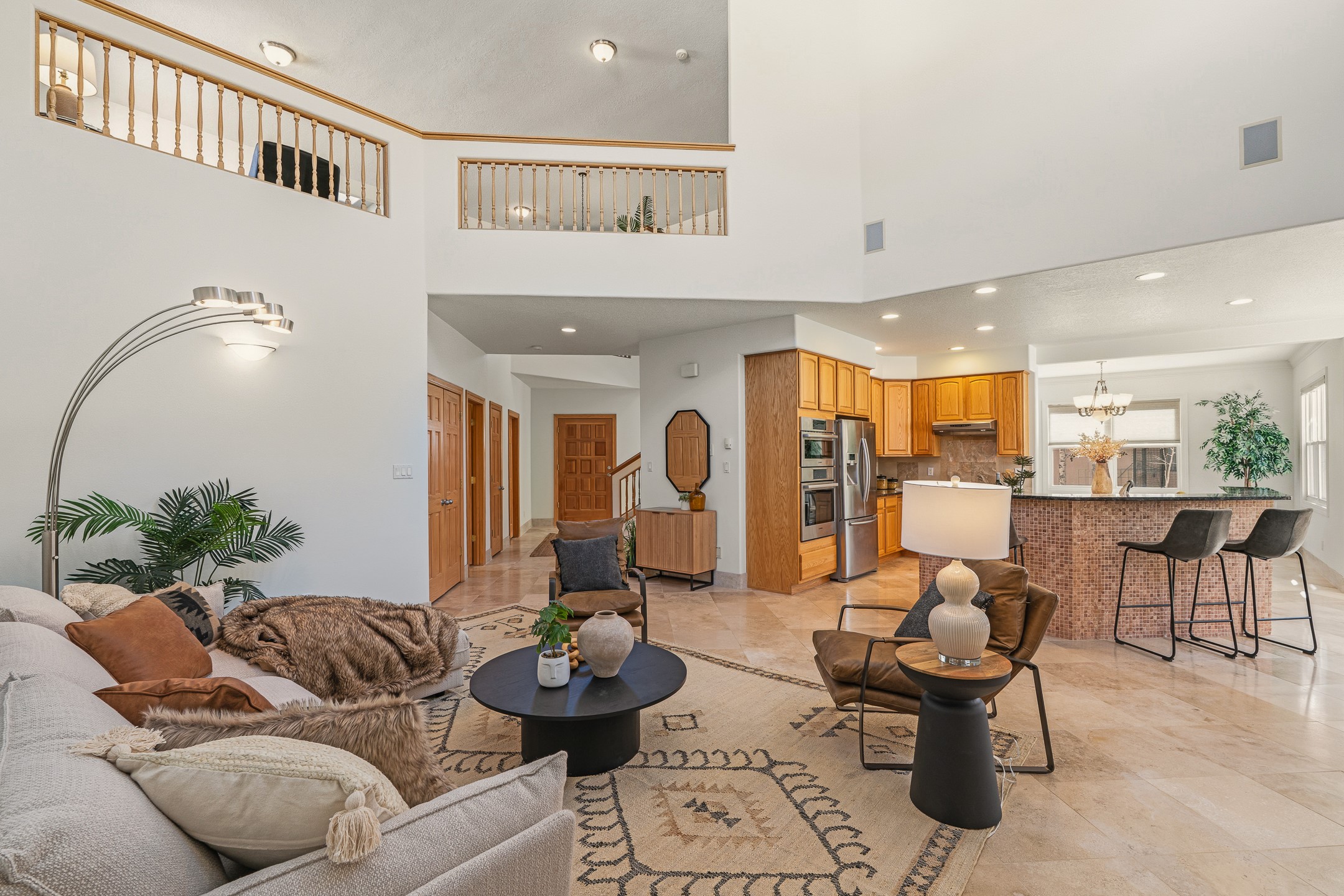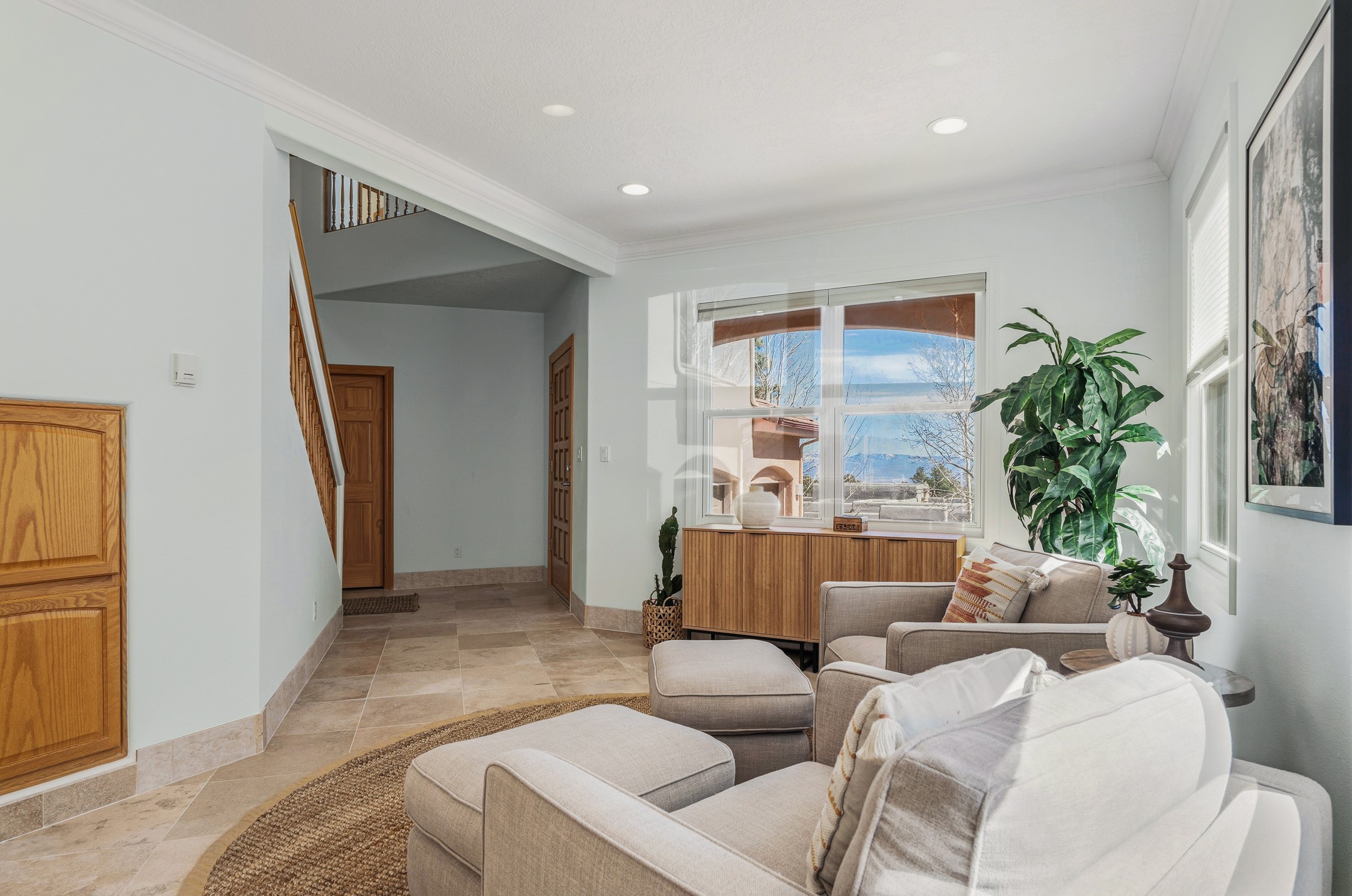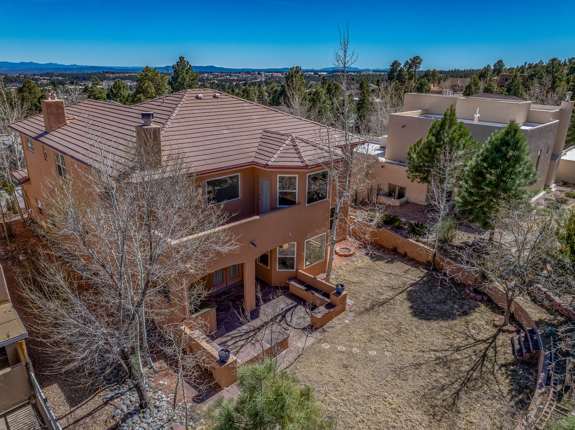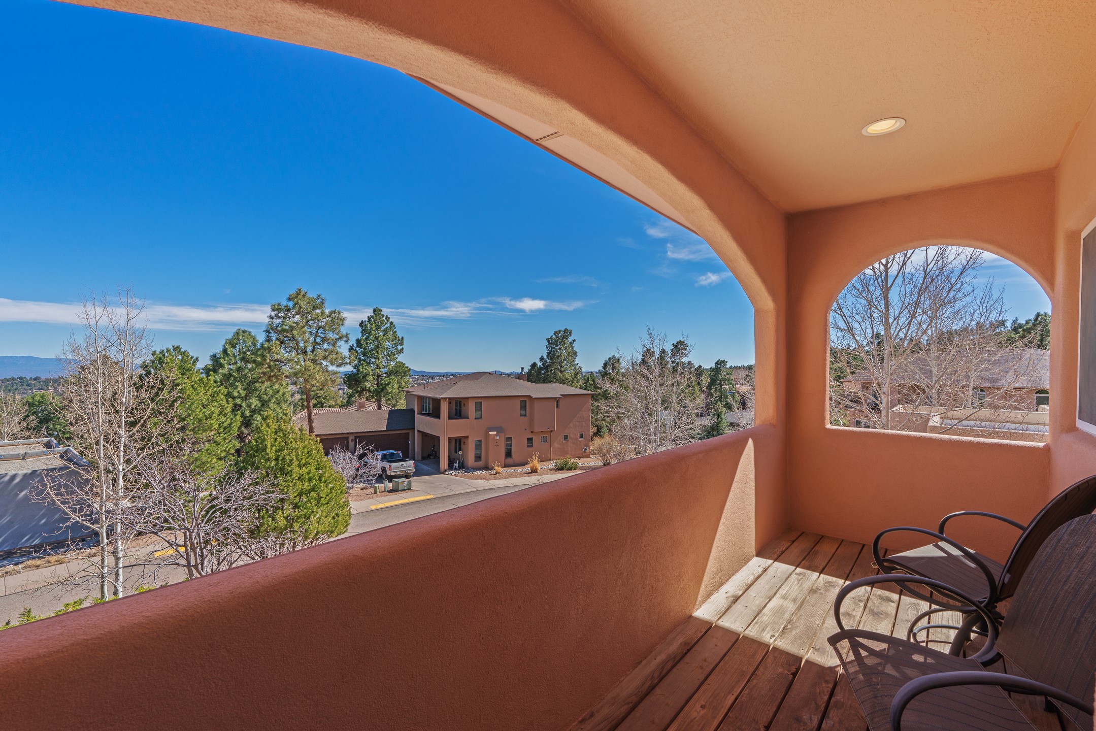 Exceptional custom residence in the highly sought-after Quemazon neighborhood, offering 3,125 square feet of refined living space, mountain views, and thoughtfully designed indoor-outdoor living.The main level is designed for comfort and ease, featuring a primary suite that allows for single-level living alongside beautifully appointed gathering spaces. A grand living room with soaring cathedral ceilings and a striking kiva fireplace creates a dramatic yet inviting focal point. The open-concept kitchen is both functional and elegant, featuring a large island with bar seating and seamless flow into a formal dining room and a sunlit breakfast nook--ideal for both entertaining and everyday living.Upstairs, hardwood flooring extends throughout, adding warmth and sophistication. A versatile loft overlooks the living area, providing an ideal space for a home office, library, or additional lounge. Two well-appointed guest bedrooms and a full bath offer comfortable accommodations, while an expansive upper-level primary suite serves as a true retreat, complete with a walk-in closet and a spa-inspired bath featuring dual vanities and a separate soaking tub. Step outside to enjoy two private balconies--an east-facing covered balcony with views of the Sangre de Cristo Mountains, and a west-facing balcony perfectly positioned for sunset vistas.The home's outdoor living is equally inviting, featuring a walk-out patio with a built-in gas grill, ideal for effortless entertaining. The backyard offers generous space to relax and gather, along with tiered garden beds for those who enjoy cultivating their own outdoor oasis.Additional highlights include an insulated three-car garage, travertine tile flooring throughout the main living areas, a durable concrete tile roof, and a new Navien combination boiler providing efficient in-floor radiant heating and domestic hot water.This exceptional Quemazon property blends architectural character, comfort, and scenic beauty in one of Los Alamos' premier neighborhoods. Schedule your private showing today and experience the elevated lifestyle this remarkable home has to offer! Seller plans to review offers on Wednesday, March 25.