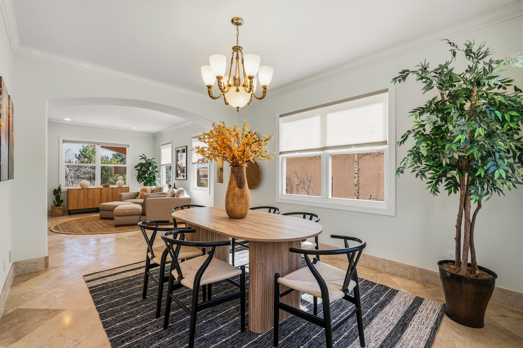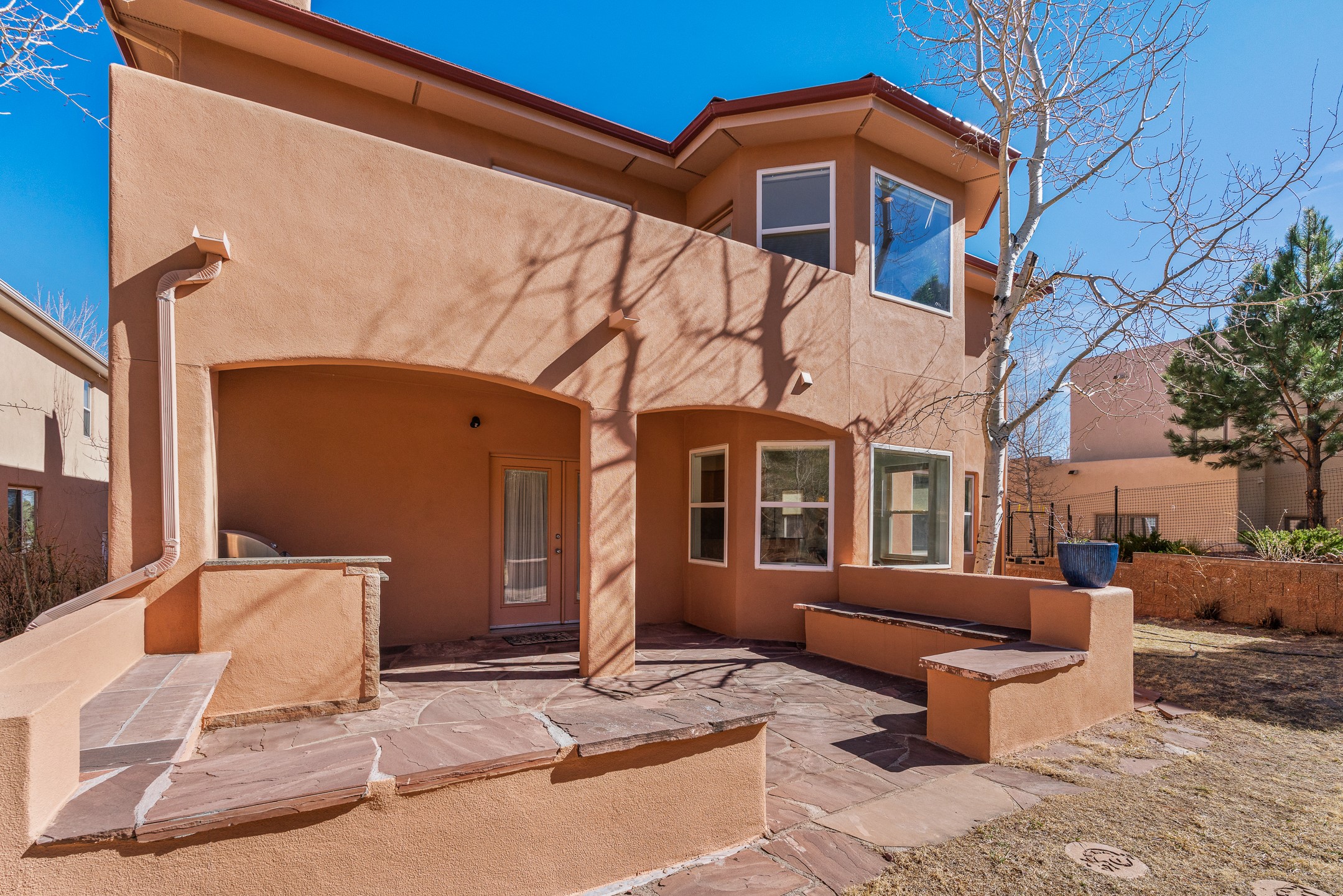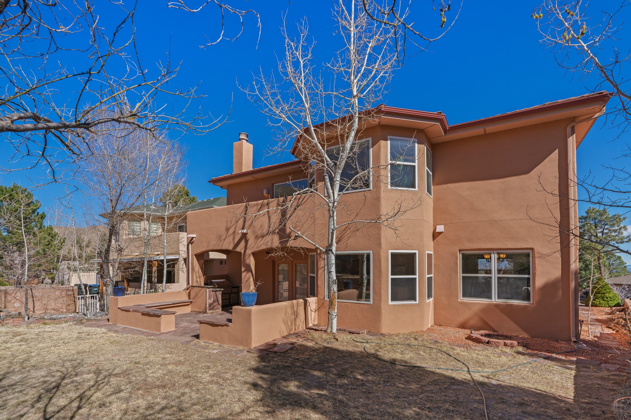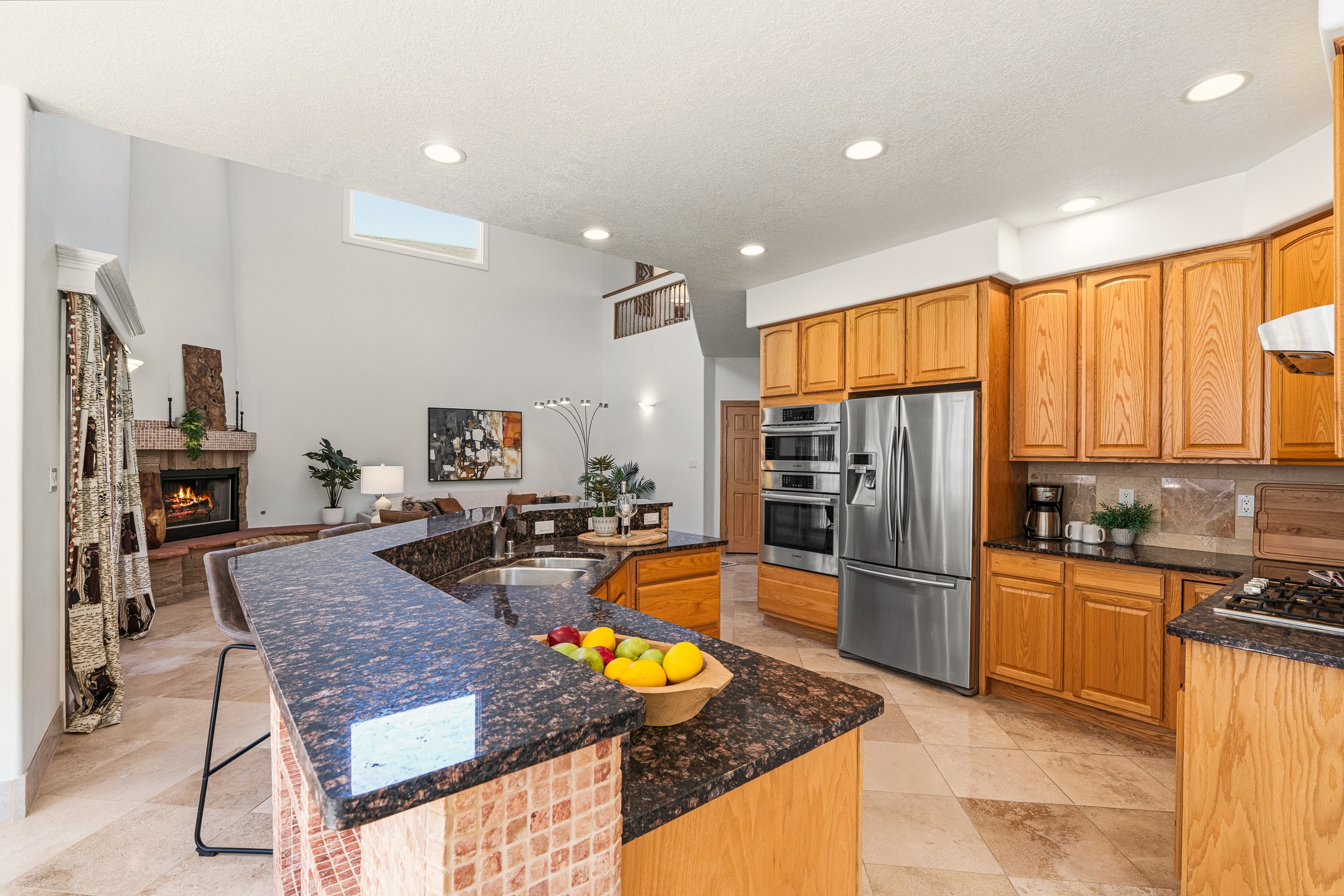 Exceptional custom residence in the highly sought-after Quemazon neighborhood, offering 3,125 square feet of refined living space, mountain views, and thoughtfully designed indoor-outdoor living.The main level is designed for comfort and ease, featuring a primary suite that allows for single-level living alongside beautifully appointed gathering spaces. A grand living room with soaring cathedral ceilings and a striking kiva fireplace creates a dramatic yet inviting focal point. The open-concept kitchen is both functional and elegant, featuring a large island with bar seating and seamless flow into a formal dining room and a sunlit breakfast nook--ideal for both entertaining and everyday living.Upstairs, hardwood flooring extends throughout, adding warmth and sophistication. A versatile loft overlooks the living area, providing an ideal space for a home office, library, or additional lounge. Two well-appointed guest bedrooms and a full bath offer comfortable accommodations, while an expansive upper-level primary suite serves as a true retreat, complete with a walk-in closet and a spa-inspired bath featuring dual vanities and a separate soaking tub. Step outside to enjoy two private balconies--an east-facing covered balcony with views of the Sangre de Cristo Mountains, and a west-facing balcony perfectly positioned for sunset vistas.The home's outdoor living is equally inviting, featuring a walk-out patio with a built-in gas grill, ideal for effortless entertaining. The backyard offers generous space to relax and gather, along with tiered garden beds for those who enjoy cultivating their own outdoor oasis.Additional highlights include an insulated three-car garage, travertine tile flooring throughout the main living areas, a durable concrete tile roof, and a new Navien combination boiler providing efficient in-floor radiant heating and domestic hot water.This exceptional Quemazon property blends architectural character, comfort, and scenic beauty in one of Los Alamos' premier neighborhoods. Schedule your private showing today and experience the elevated lifestyle this remarkable home has to offer! Seller plans to review offers on Wednesday, March 25.