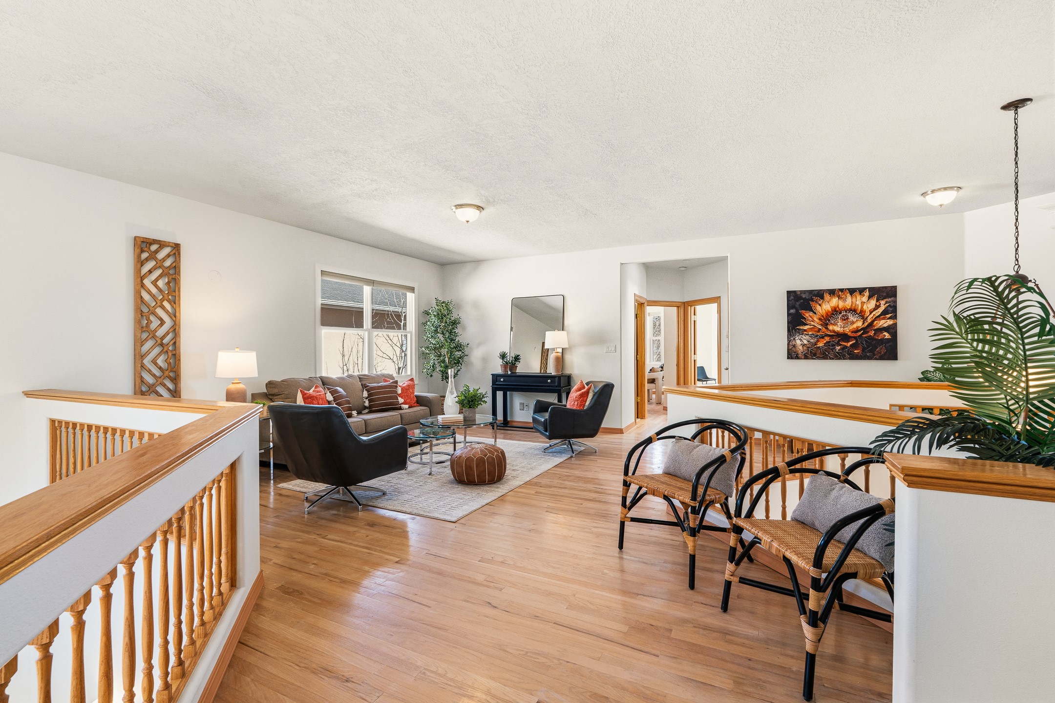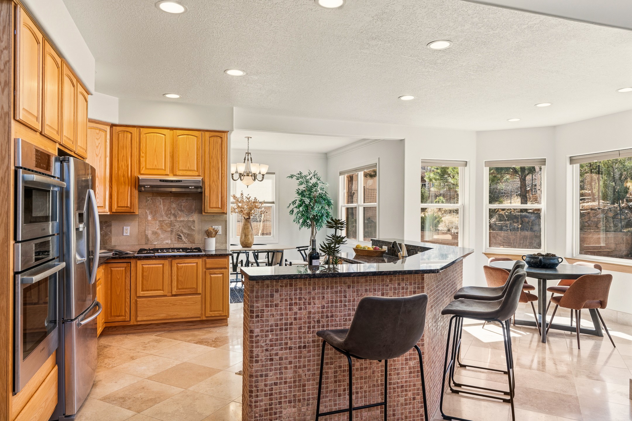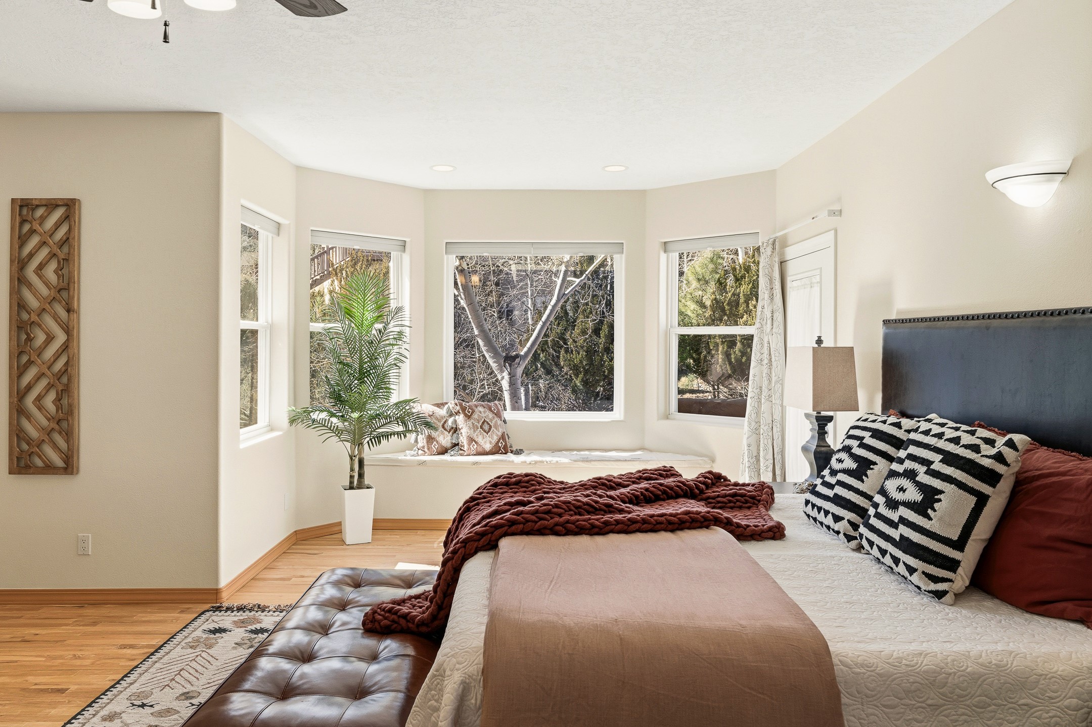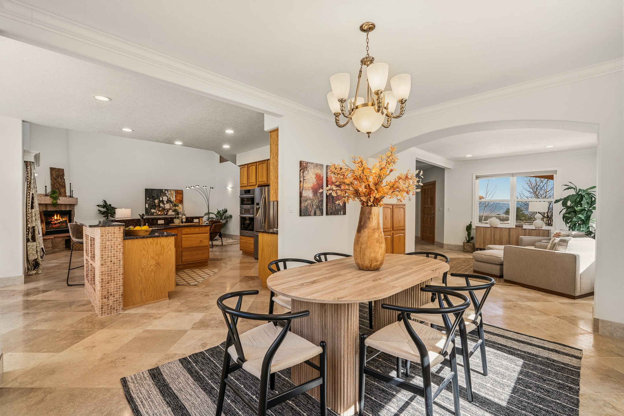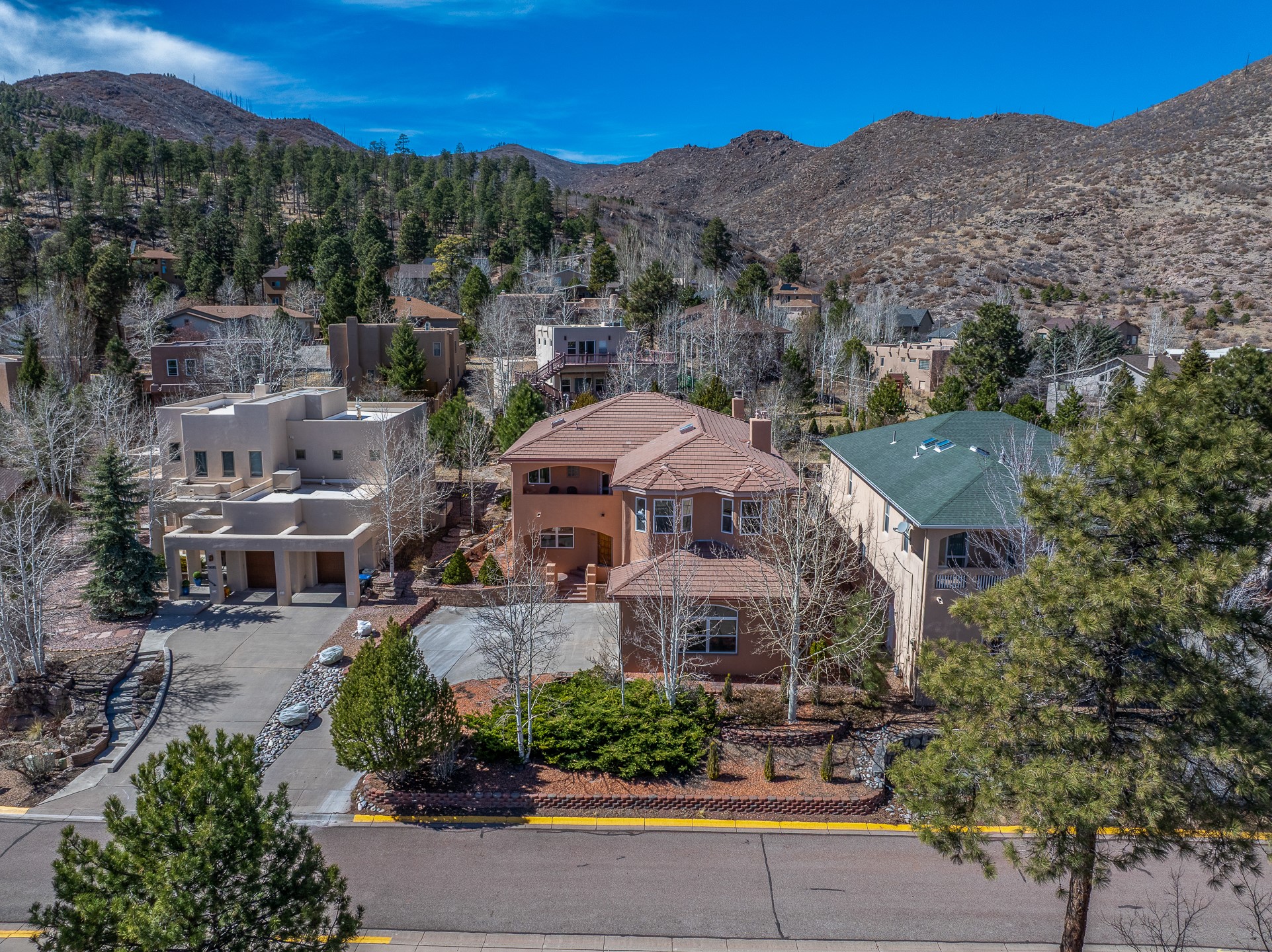 Exceptional custom residence in the highly sought-after Quemazon neighborhood, offering 3,125 square feet of refined living space, mountain views, and thoughtfully designed indoor-outdoor living.The main level is designed for comfort and ease, featuring a primary suite that allows for single-level living alongside beautifully appointed gathering spaces. A grand living room with soaring cathedral ceilings and a striking kiva fireplace creates a dramatic yet inviting focal point. The open-concept kitchen is both functional and elegant, featuring a large island with bar seating and seamless flow into a formal dining room and a sunlit breakfast nook--ideal for both entertaining and everyday living.Upstairs, hardwood flooring extends throughout, adding warmth and sophistication. A versatile loft overlooks the living area, providing an ideal space for a home office, library, or additional lounge. Two well-appointed guest bedrooms and a full bath offer comfortable accommodations, while an expansive upper-level primary suite serves as a true retreat, complete with a walk-in closet and a spa-inspired bath featuring dual vanities and a separate soaking tub. Step outside to enjoy two private balconies--an east-facing covered balcony with views of the Sangre de Cristo Mountains, and a west-facing balcony perfectly positioned for sunset vistas.The home's outdoor living is equally inviting, featuring a walk-out patio with a built-in gas grill, ideal for effortless entertaining. The backyard offers generous space to relax and gather, along with tiered garden beds for those who enjoy cultivating their own outdoor oasis.Additional highlights include an insulated three-car garage, travertine tile flooring throughout the main living areas, a durable concrete tile roof, and a new Navien combination boiler providing efficient in-floor radiant heating and domestic hot water.This exceptional Quemazon property blends architectural character, comfort, and scenic beauty in one of Los Alamos' premier neighborhoods. Schedule your private showing today and experience the elevated lifestyle this remarkable home has to offer! Seller plans to review offers on Wednesday, March 25.