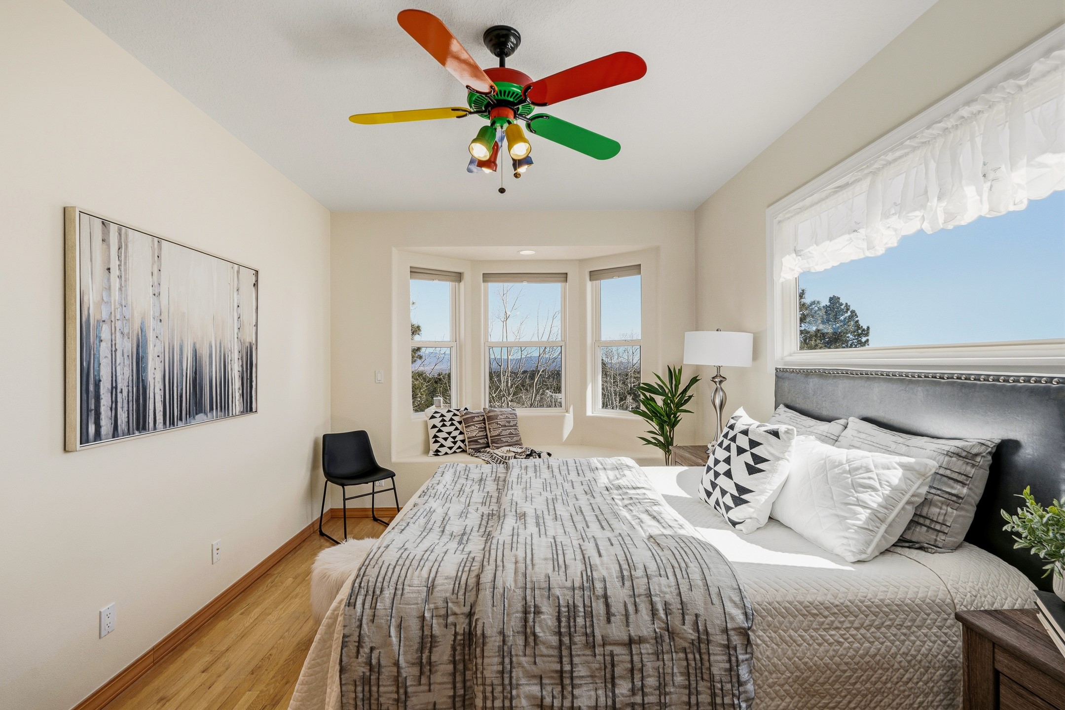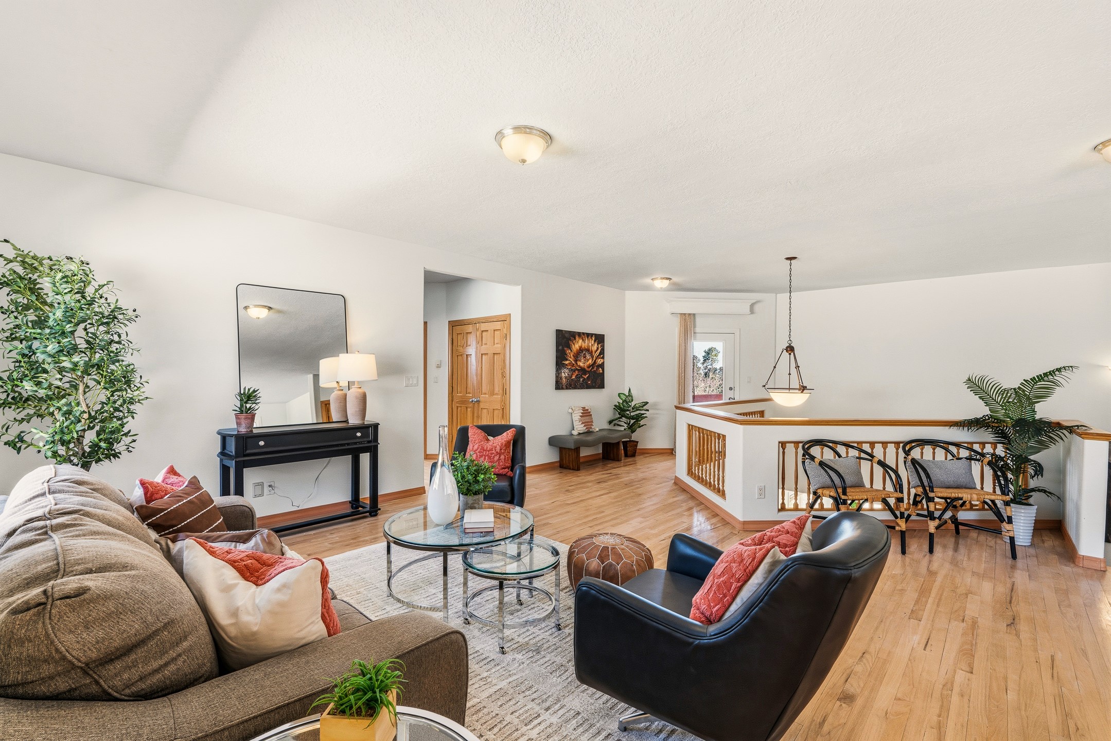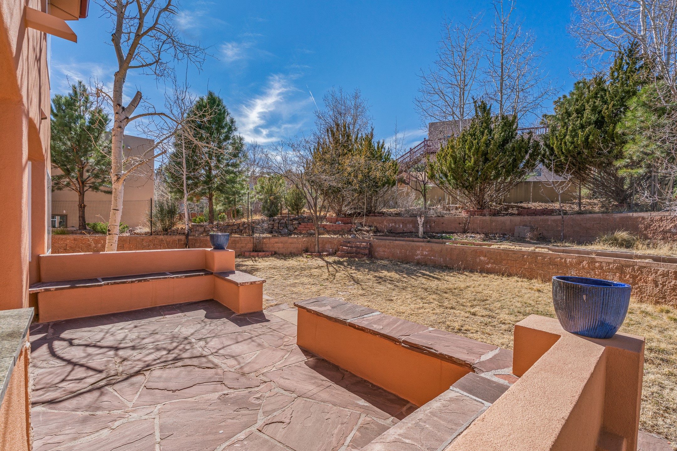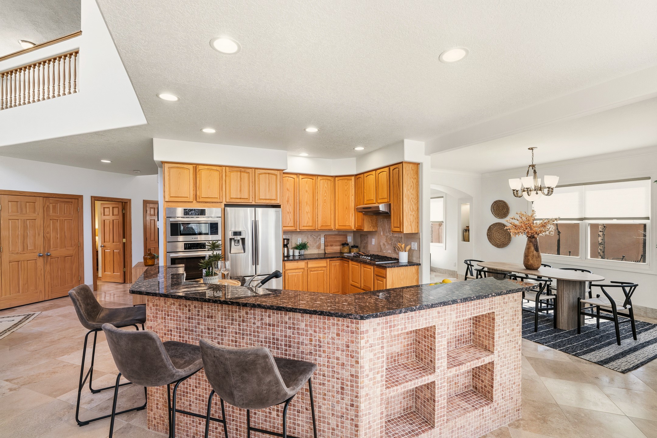 Exceptional custom residence in the highly sought-after Quemazon neighborhood, offering 3,125 square feet of refined living space, mountain views, and thoughtfully designed indoor-outdoor living.The main level is designed for comfort and ease, featuring a primary suite that allows for single-level living alongside beautifully appointed gathering spaces. A grand living room with soaring cathedral ceilings and a striking kiva fireplace creates a dramatic yet inviting focal point. The open-concept kitchen is both functional and elegant, featuring a large island with bar seating and seamless flow into a formal dining room and a sunlit breakfast nook--ideal for both entertaining and everyday living.Upstairs, hardwood flooring extends throughout, adding warmth and sophistication. A versatile loft overlooks the living area, providing an ideal space for a home office, library, or additional lounge. Two well-appointed guest bedrooms and a full bath offer comfortable accommodations, while an expansive upper-level primary suite serves as a true retreat, complete with a walk-in closet and a spa-inspired bath featuring dual vanities and a separate soaking tub. Step outside to enjoy two private balconies--an east-facing covered balcony with views of the Sangre de Cristo Mountains, and a west-facing balcony perfectly positioned for sunset vistas.The home's outdoor living is equally inviting, featuring a walk-out patio with a built-in gas grill, ideal for effortless entertaining. The backyard offers generous space to relax and gather, along with tiered garden beds for those who enjoy cultivating their own outdoor oasis.Additional highlights include an insulated three-car garage, travertine tile flooring throughout the main living areas, a durable concrete tile roof, and a new Navien combination boiler providing efficient in-floor radiant heating and domestic hot water.This exceptional Quemazon property blends architectural character, comfort, and scenic beauty in one of Los Alamos' premier neighborhoods. Schedule your private showing today and experience the elevated lifestyle this remarkable home has to offer! Seller plans to review offers on Wednesday, March 25.