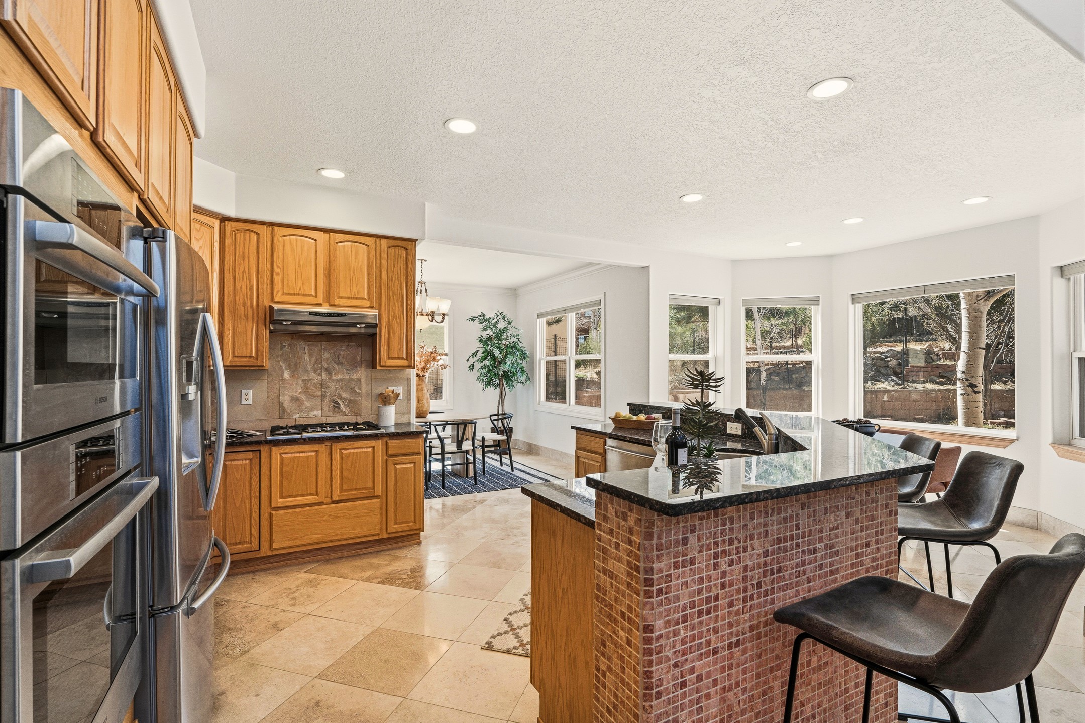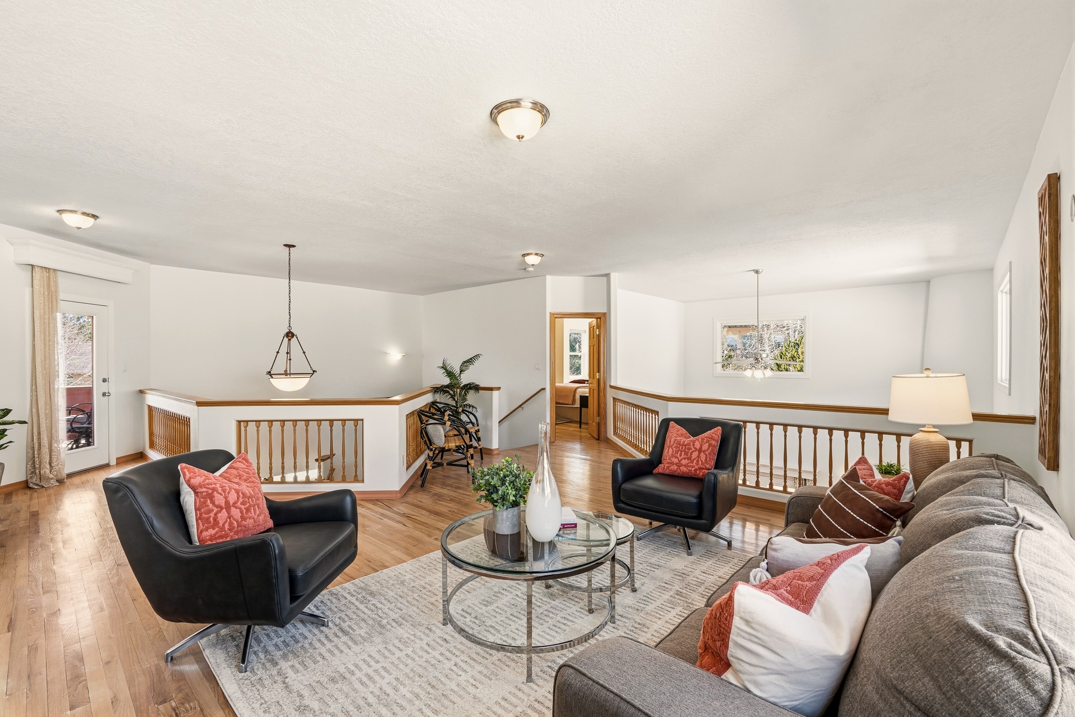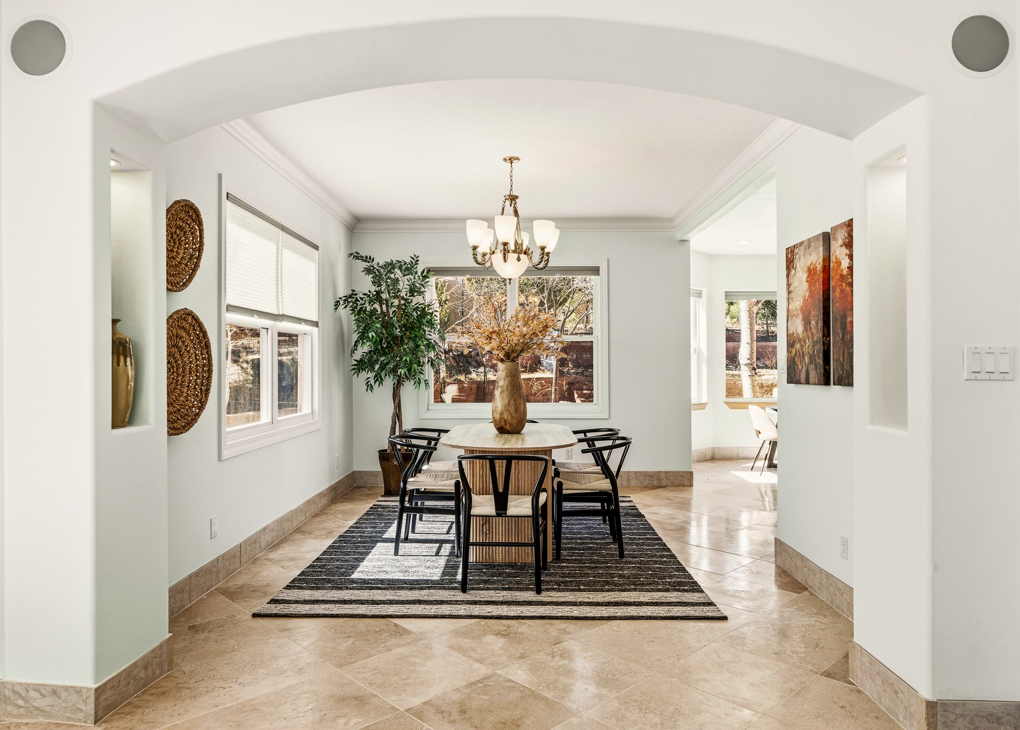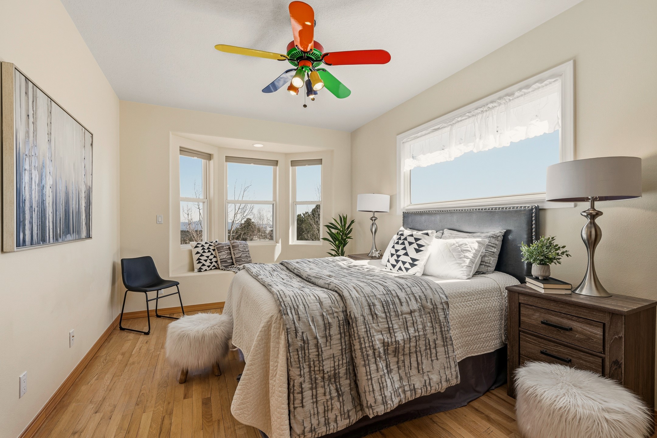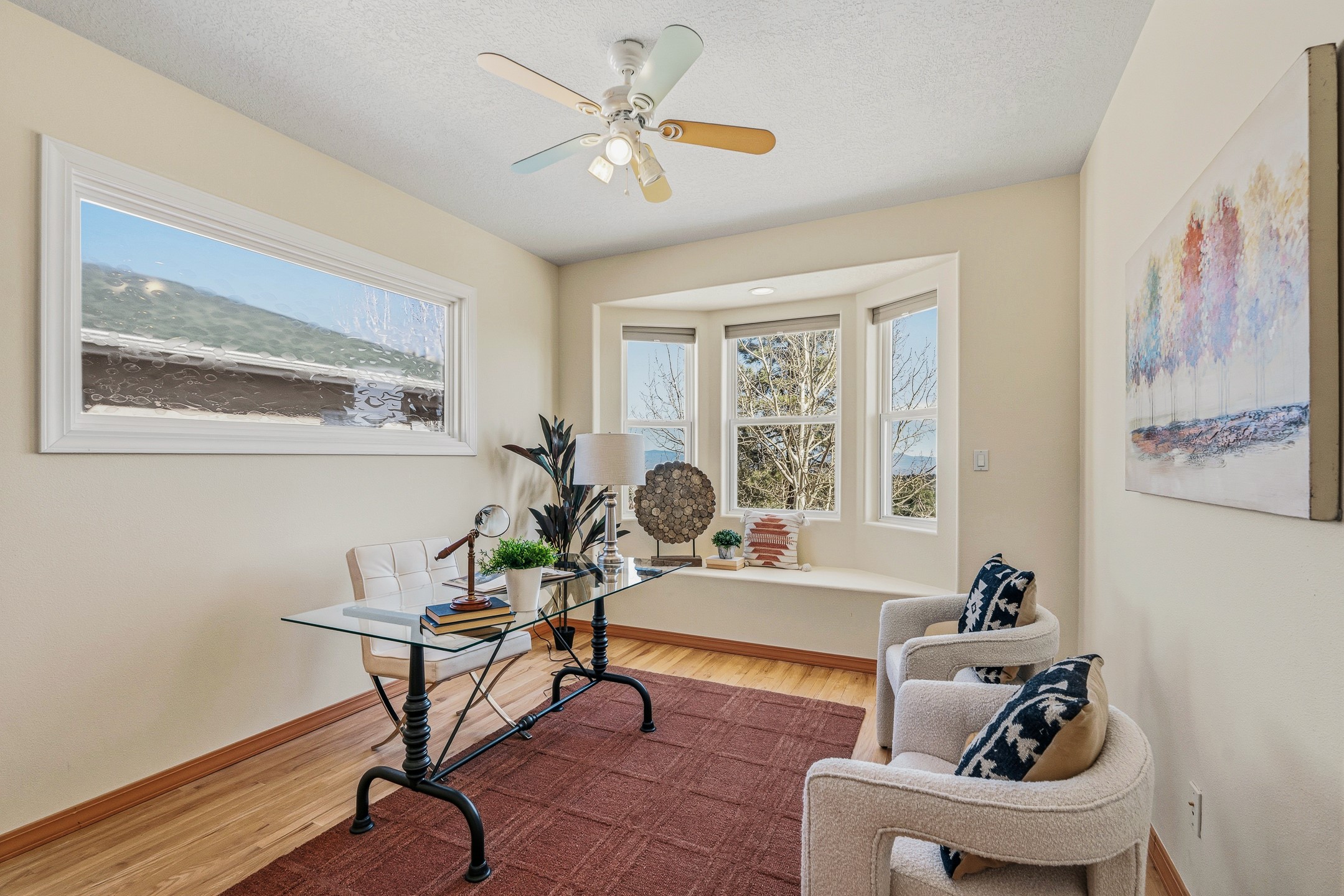 Exceptional custom residence in the highly sought-after Quemazon neighborhood, offering 3,125 square feet of refined living space, mountain views, and thoughtfully designed indoor-outdoor living.The main level is designed for comfort and ease, featuring a primary suite that allows for single-level living alongside beautifully appointed gathering spaces. A grand living room with soaring cathedral ceilings and a striking kiva fireplace creates a dramatic yet inviting focal point. The open-concept kitchen is both functional and elegant, featuring a large island with bar seating and seamless flow into a formal dining room and a sunlit breakfast nook--ideal for both entertaining and everyday living.Upstairs, hardwood flooring extends throughout, adding warmth and sophistication. A versatile loft overlooks the living area, providing an ideal space for a home office, library, or additional lounge. Two well-appointed guest bedrooms and a full bath offer comfortable accommodations, while an expansive upper-level primary suite serves as a true retreat, complete with a walk-in closet and a spa-inspired bath featuring dual vanities and a separate soaking tub. Step outside to enjoy two private balconies--an east-facing covered balcony with views of the Sangre de Cristo Mountains, and a west-facing balcony perfectly positioned for sunset vistas.The home's outdoor living is equally inviting, featuring a walk-out patio with a built-in gas grill, ideal for effortless entertaining. The backyard offers generous space to relax and gather, along with tiered garden beds for those who enjoy cultivating their own outdoor oasis.Additional highlights include an insulated three-car garage, travertine tile flooring throughout the main living areas, a durable concrete tile roof, and a new Navien combination boiler providing efficient in-floor radiant heating and domestic hot water.This exceptional Quemazon property blends architectural character, comfort, and scenic beauty in one of Los Alamos' premier neighborhoods. Schedule your private showing today and experience the elevated lifestyle this remarkable home has to offer! Seller plans to review offers on Wednesday, March 25.