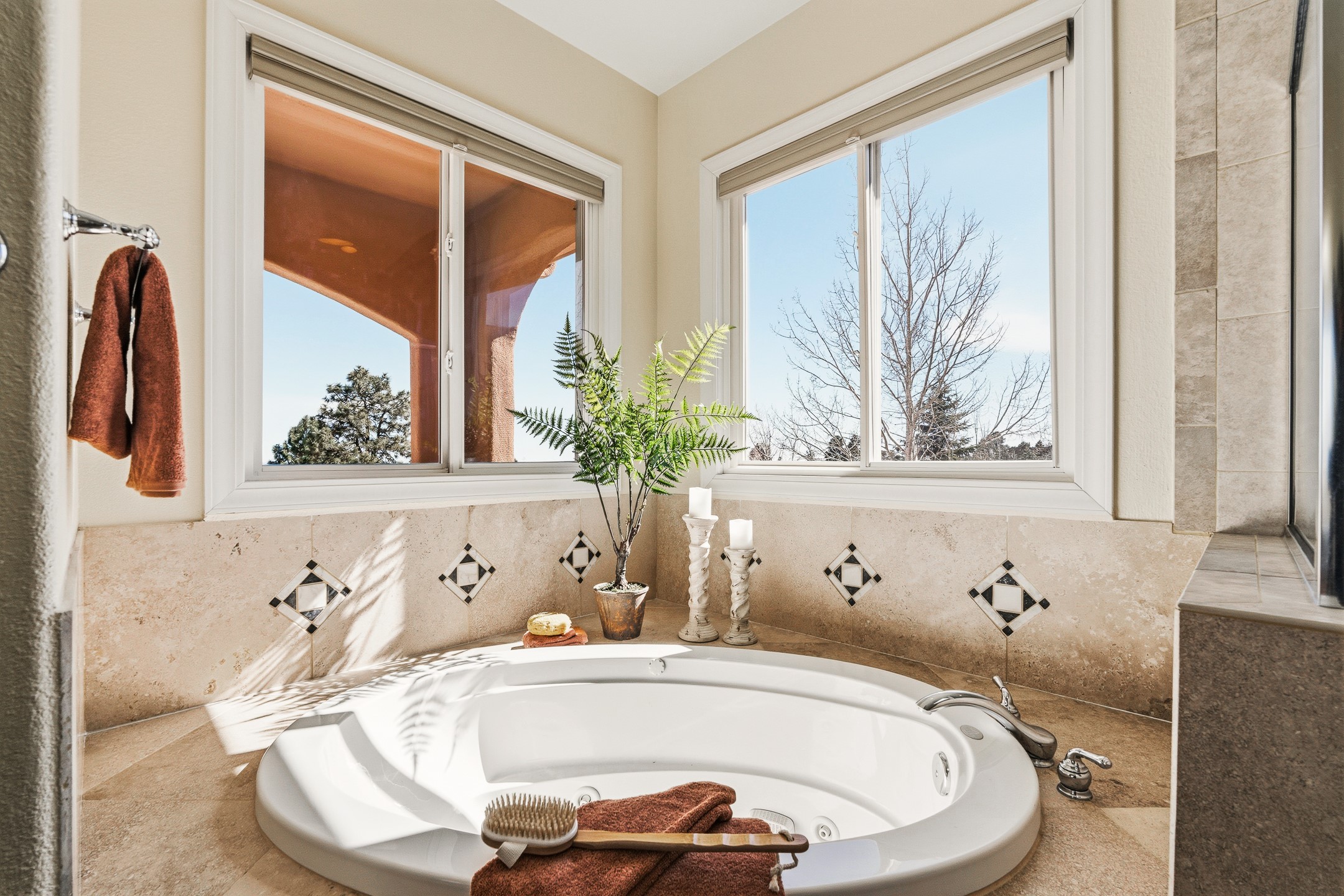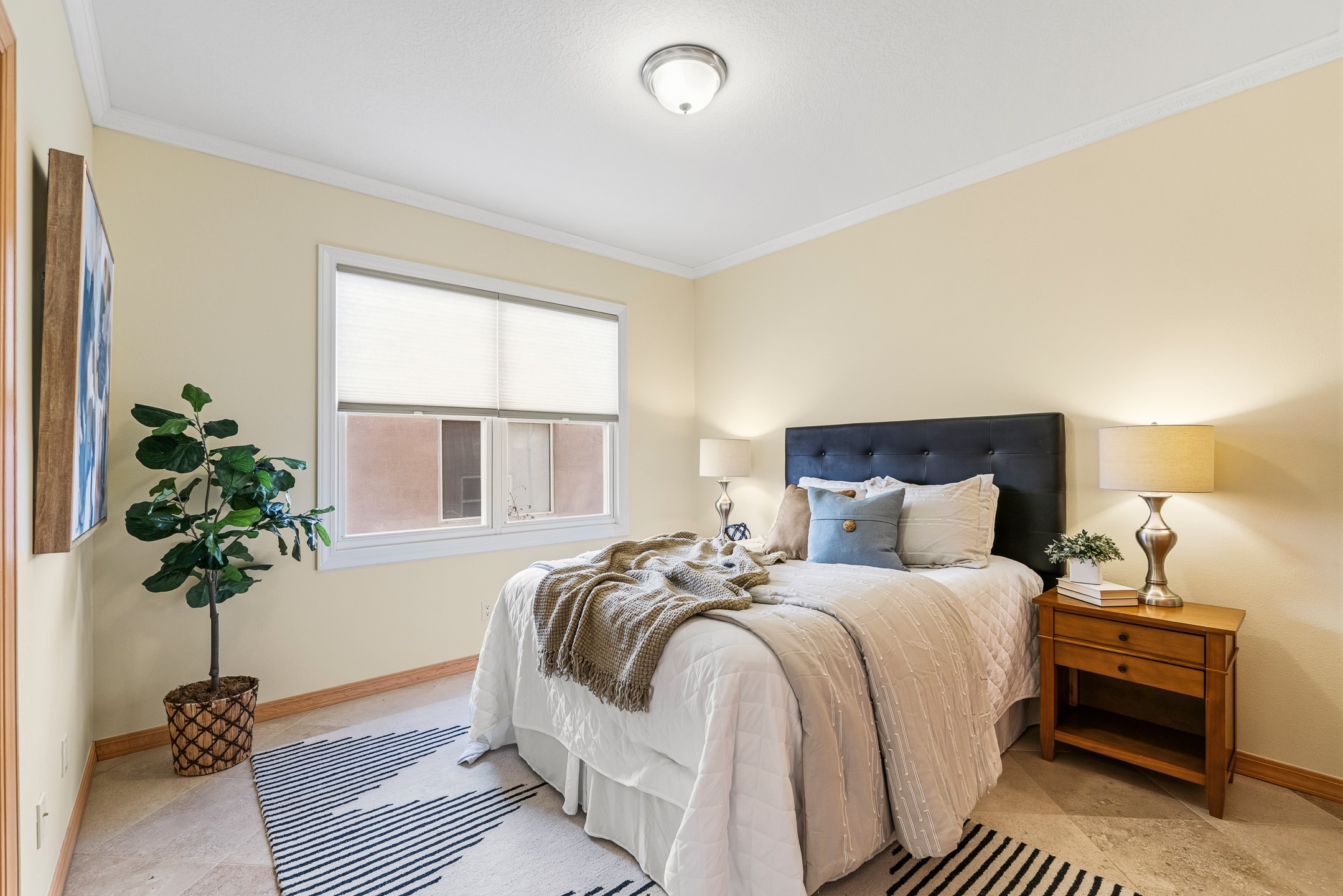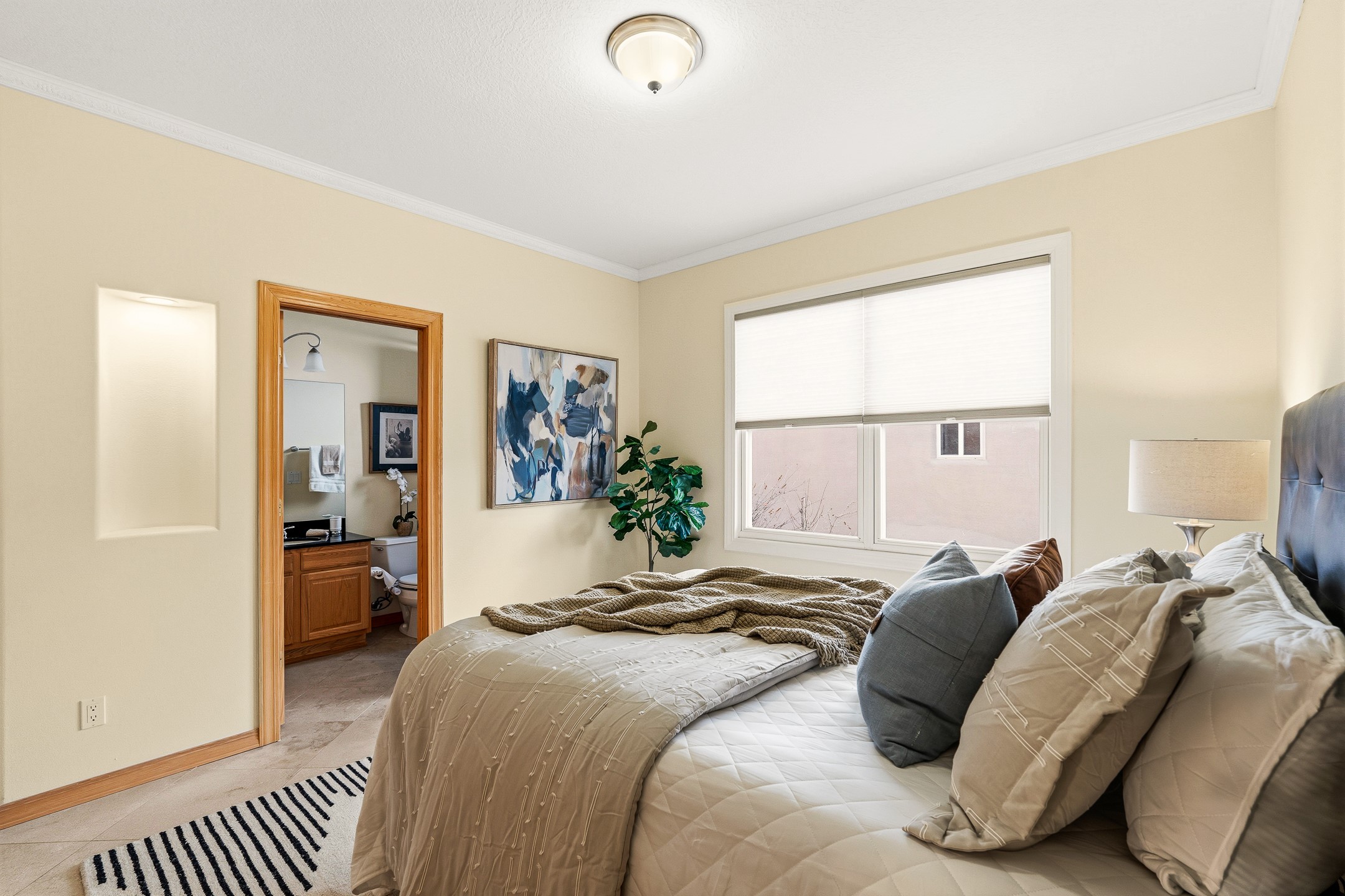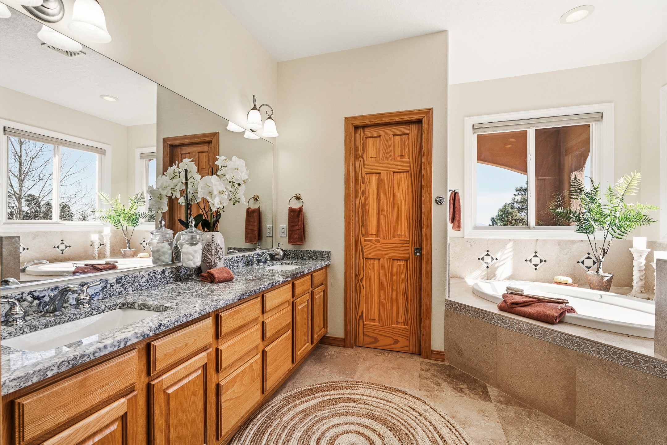 Exceptional custom residence in the highly sought-after Quemazon neighborhood, offering 3,125 square feet of refined living space, mountain views, and thoughtfully designed indoor-outdoor living.The main level is designed for comfort and ease, featuring a primary suite that allows for single-level living alongside beautifully appointed gathering spaces. A grand living room with soaring cathedral ceilings and a striking kiva fireplace creates a dramatic yet inviting focal point. The open-concept kitchen is both functional and elegant, featuring a large island with bar seating and seamless flow into a formal dining room and a sunlit breakfast nook--ideal for both entertaining and everyday living.Upstairs, hardwood flooring extends throughout, adding warmth and sophistication. A versatile loft overlooks the living area, providing an ideal space for a home office, library, or additional lounge. Two well-appointed guest bedrooms and a full bath offer comfortable accommodations, while an expansive upper-level primary suite serves as a true retreat, complete with a walk-in closet and a spa-inspired bath featuring dual vanities and a separate soaking tub. Step outside to enjoy two private balconies--an east-facing covered balcony with views of the Sangre de Cristo Mountains, and a west-facing balcony perfectly positioned for sunset vistas.The home's outdoor living is equally inviting, featuring a walk-out patio with a built-in gas grill, ideal for effortless entertaining. The backyard offers generous space to relax and gather, along with tiered garden beds for those who enjoy cultivating their own outdoor oasis.Additional highlights include an insulated three-car garage, travertine tile flooring throughout the main living areas, a durable concrete tile roof, and a new Navien combination boiler providing efficient in-floor radiant heating and domestic hot water.This exceptional Quemazon property blends architectural character, comfort, and scenic beauty in one of Los Alamos' premier neighborhoods. Schedule your private showing today and experience the elevated lifestyle this remarkable home has to offer! Seller plans to review offers on Wednesday, March 25.