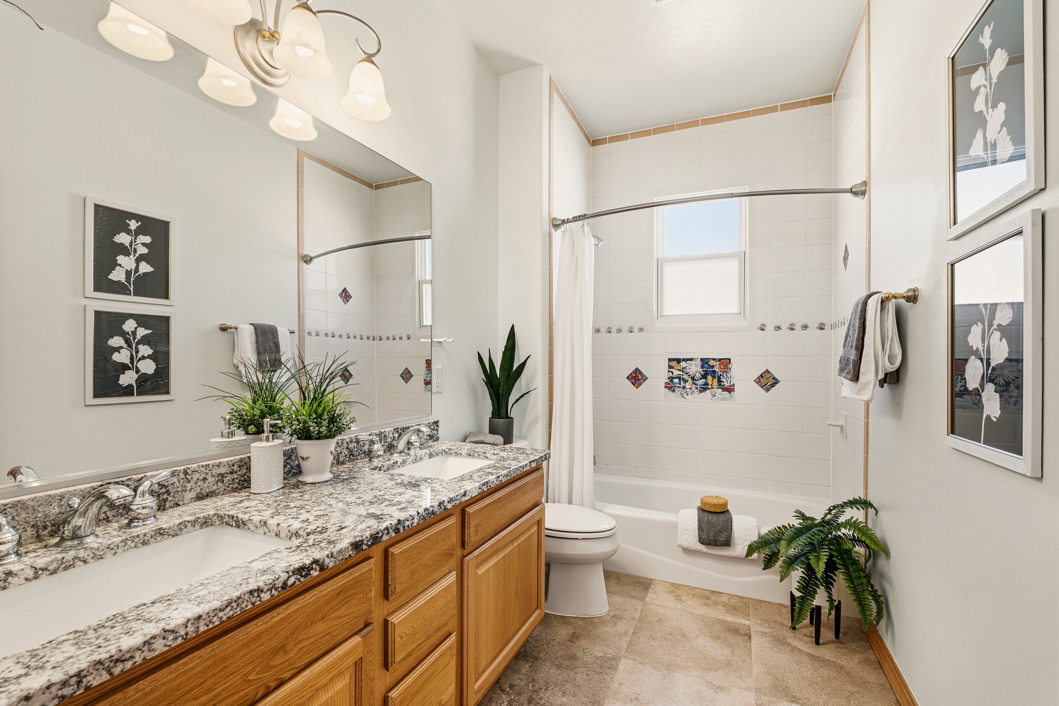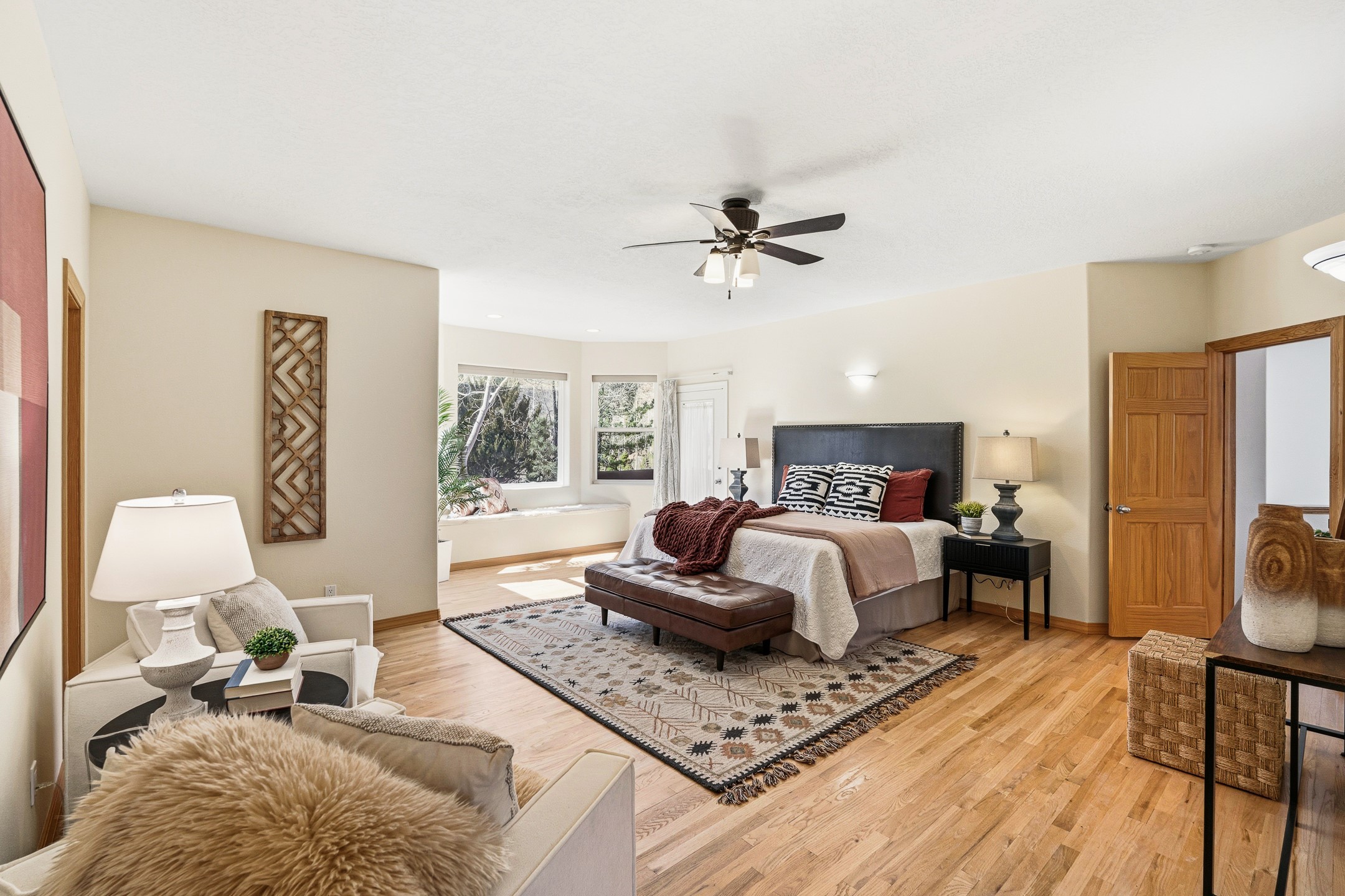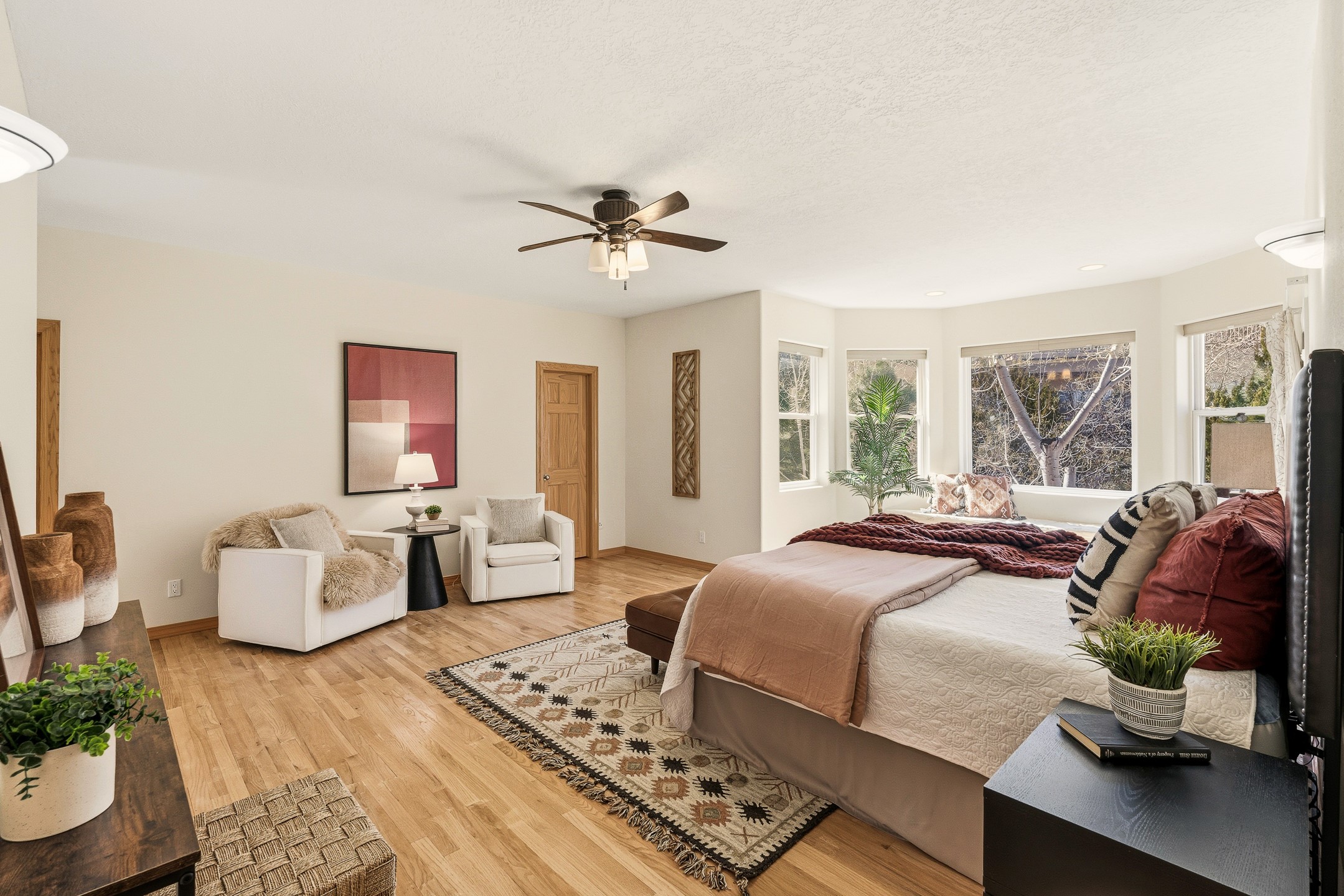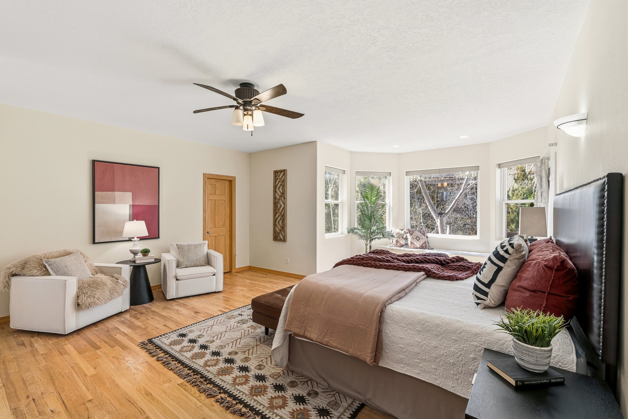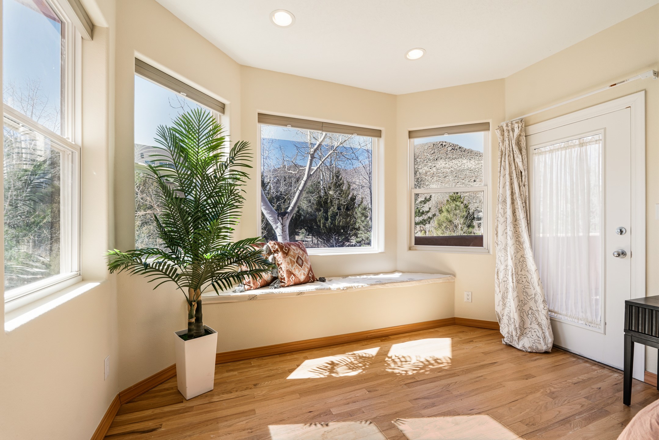 Exceptional custom residence in the highly sought-after Quemazon neighborhood, offering 3,125 square feet of refined living space, mountain views, and thoughtfully designed indoor-outdoor living.The main level is designed for comfort and ease, featuring a primary suite that allows for single-level living alongside beautifully appointed gathering spaces. A grand living room with soaring cathedral ceilings and a striking kiva fireplace creates a dramatic yet inviting focal point. The open-concept kitchen is both functional and elegant, featuring a large island with bar seating and seamless flow into a formal dining room and a sunlit breakfast nook--ideal for both entertaining and everyday living.Upstairs, hardwood flooring extends throughout, adding warmth and sophistication. A versatile loft overlooks the living area, providing an ideal space for a home office, library, or additional lounge. Two well-appointed guest bedrooms and a full bath offer comfortable accommodations, while an expansive upper-level primary suite serves as a true retreat, complete with a walk-in closet and a spa-inspired bath featuring dual vanities and a separate soaking tub. Step outside to enjoy two private balconies--an east-facing covered balcony with views of the Sangre de Cristo Mountains, and a west-facing balcony perfectly positioned for sunset vistas.The home's outdoor living is equally inviting, featuring a walk-out patio with a built-in gas grill, ideal for effortless entertaining. The backyard offers generous space to relax and gather, along with tiered garden beds for those who enjoy cultivating their own outdoor oasis.Additional highlights include an insulated three-car garage, travertine tile flooring throughout the main living areas, a durable concrete tile roof, and a new Navien combination boiler providing efficient in-floor radiant heating and domestic hot water.This exceptional Quemazon property blends architectural character, comfort, and scenic beauty in one of Los Alamos' premier neighborhoods. Schedule your private showing today and experience the elevated lifestyle this remarkable home has to offer! Seller plans to review offers on Wednesday, March 25.