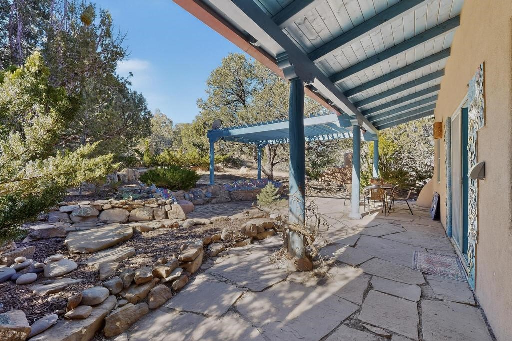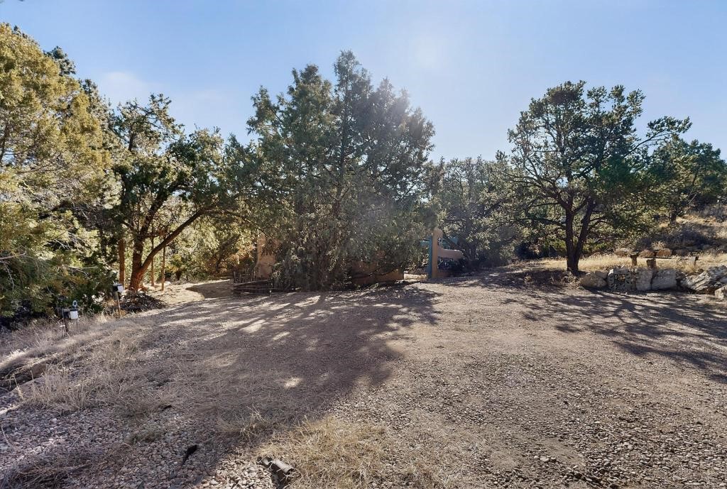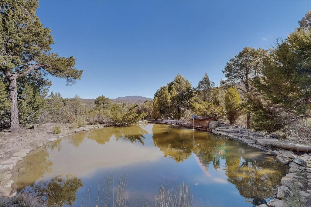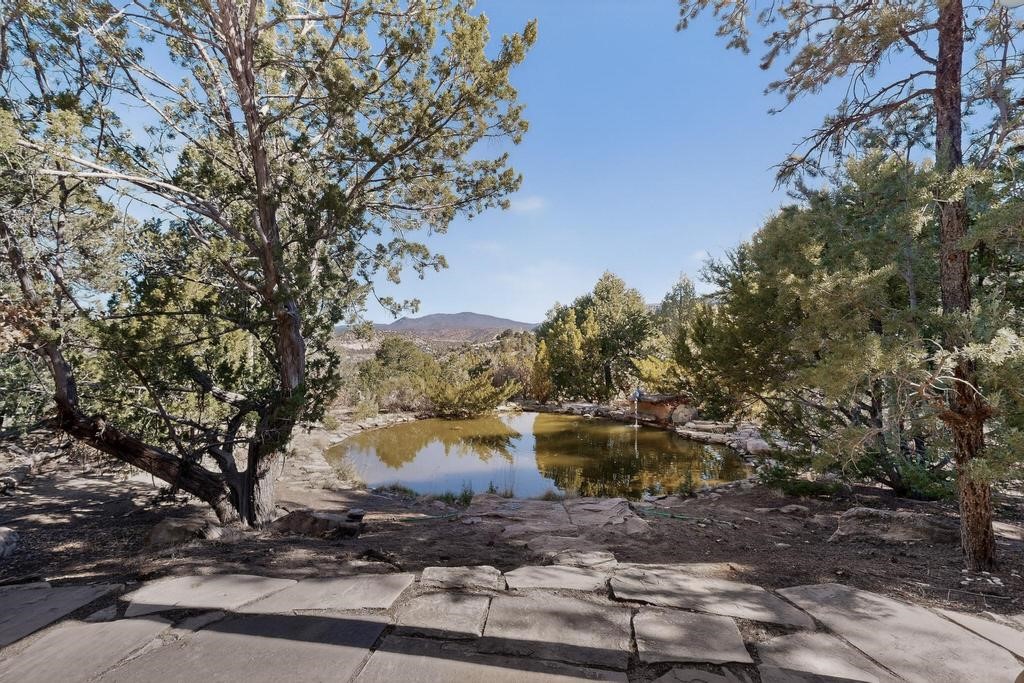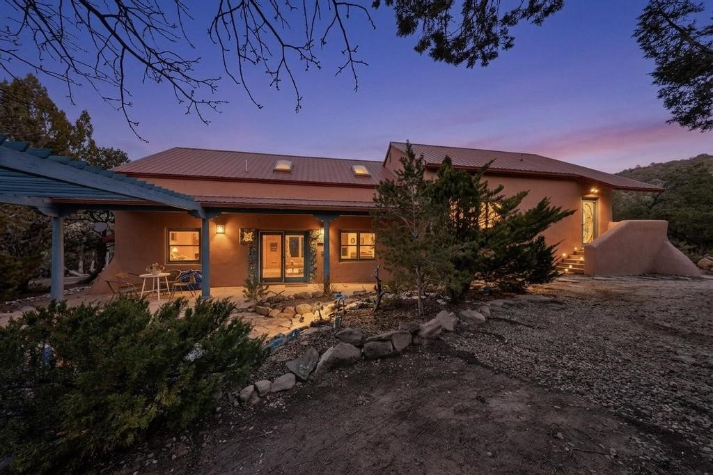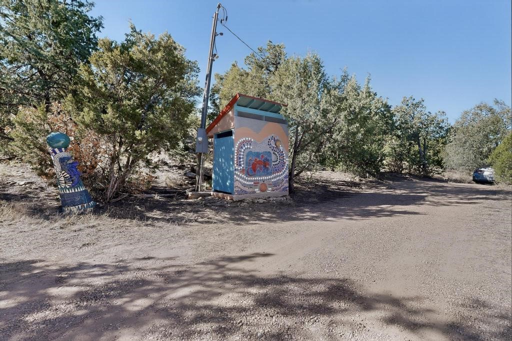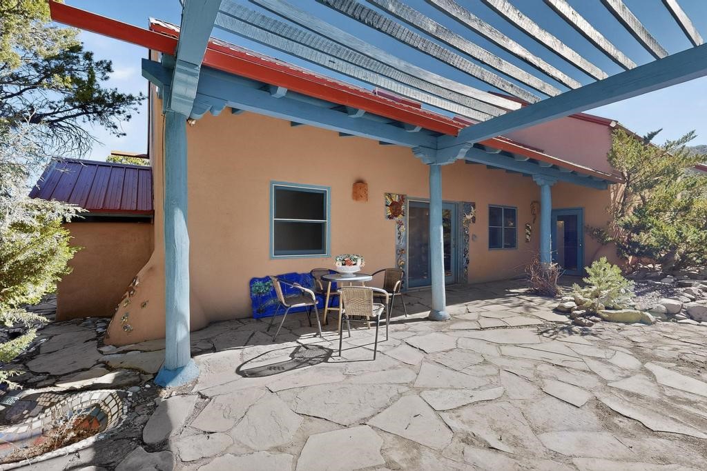 Surrounded by the open skies and hills of Canoncito, this custom-built 3-bedroom, 2-bath home showcases breathtaking views of the Sangre de Cristo Mountains, with artistic details flowing throughout the home and property. Thoughtfully constructed with Rastra construction for improved insulation performance and energy efficiency, the builder and artist designed the home to capture the changing light throughout the day through the large window fronts and skylights. The living room welcomes you with a soaring ceiling, skylights, and windows that fill the space with natural light, while a kiva-style wood-burning fireplace creates a warm and inviting gathering space. Above, a versatile loft provides the perfect spot for an office, library, or additional living area. The primary bedroom is located on the upper level, separated from the guest bedrooms and main living areas, and includes a private bath. With existing utility connections, the space also offers potential for semi-independent living with minimal modifications. One of the guest rooms features a utility sink and 240V outlet, ideal for hobbies, projects, or a dedicated workspace. Outdoors, the property sits on 5.99 acres and includes a koi pond and two storage sheds, one of which has an electrical backup generator, along with ample parking and overflow parking for guests. This rare home offers privacy, craftsmanship, and stunning natural surroundings, with plenty of space to relax, entertain, explore, or simply enjoy the scenery. Conveniently located approximately 20 minutes from Santa Fe and just 10 minutes from El Dorado, with supermarkets, restaurants, a gas station, and a post office nearby.