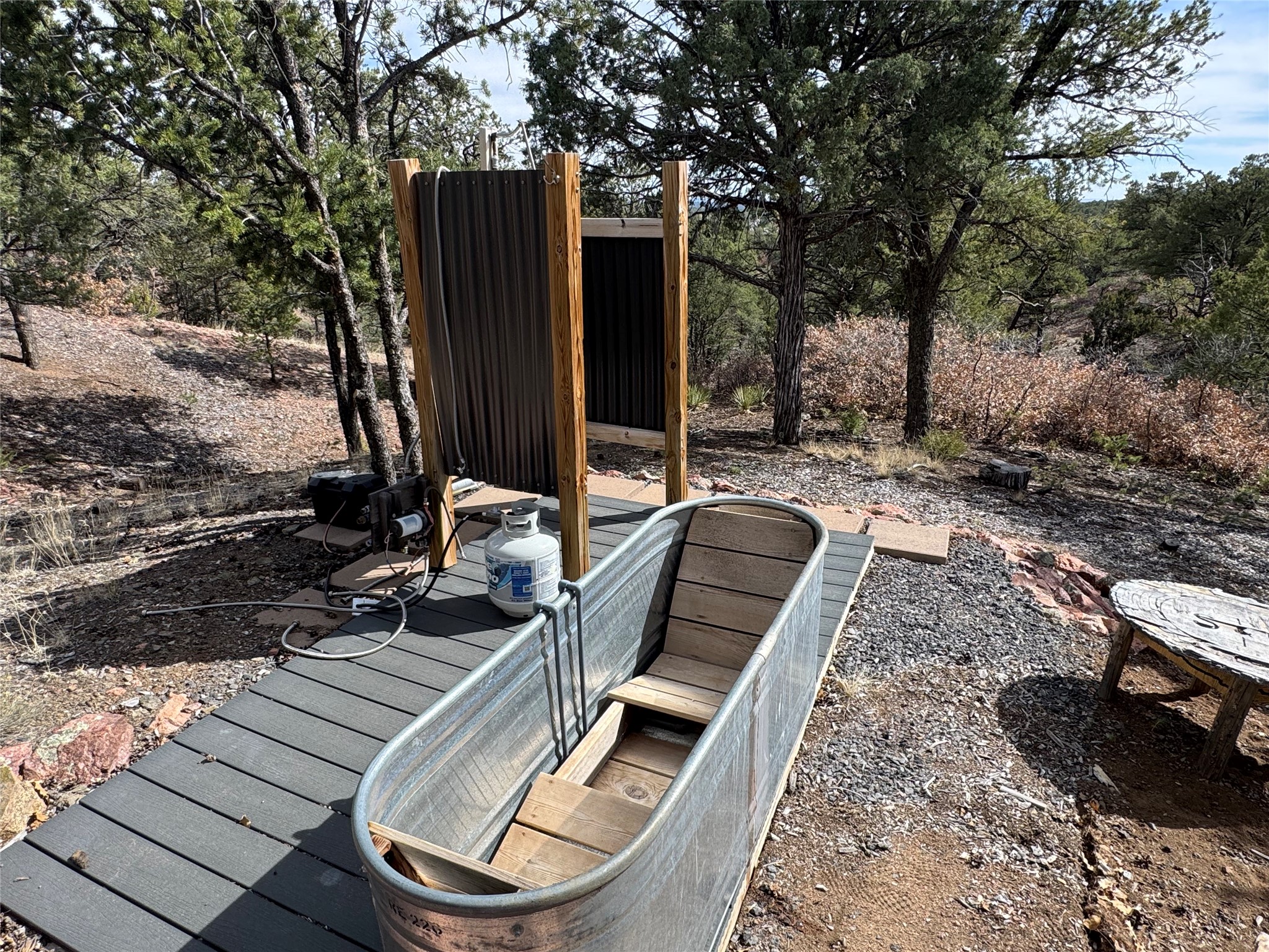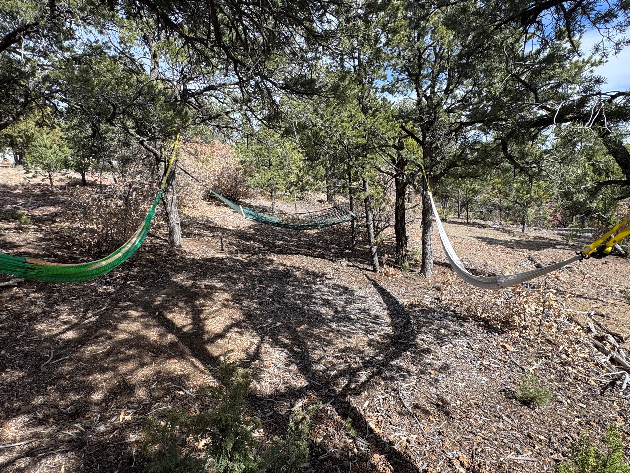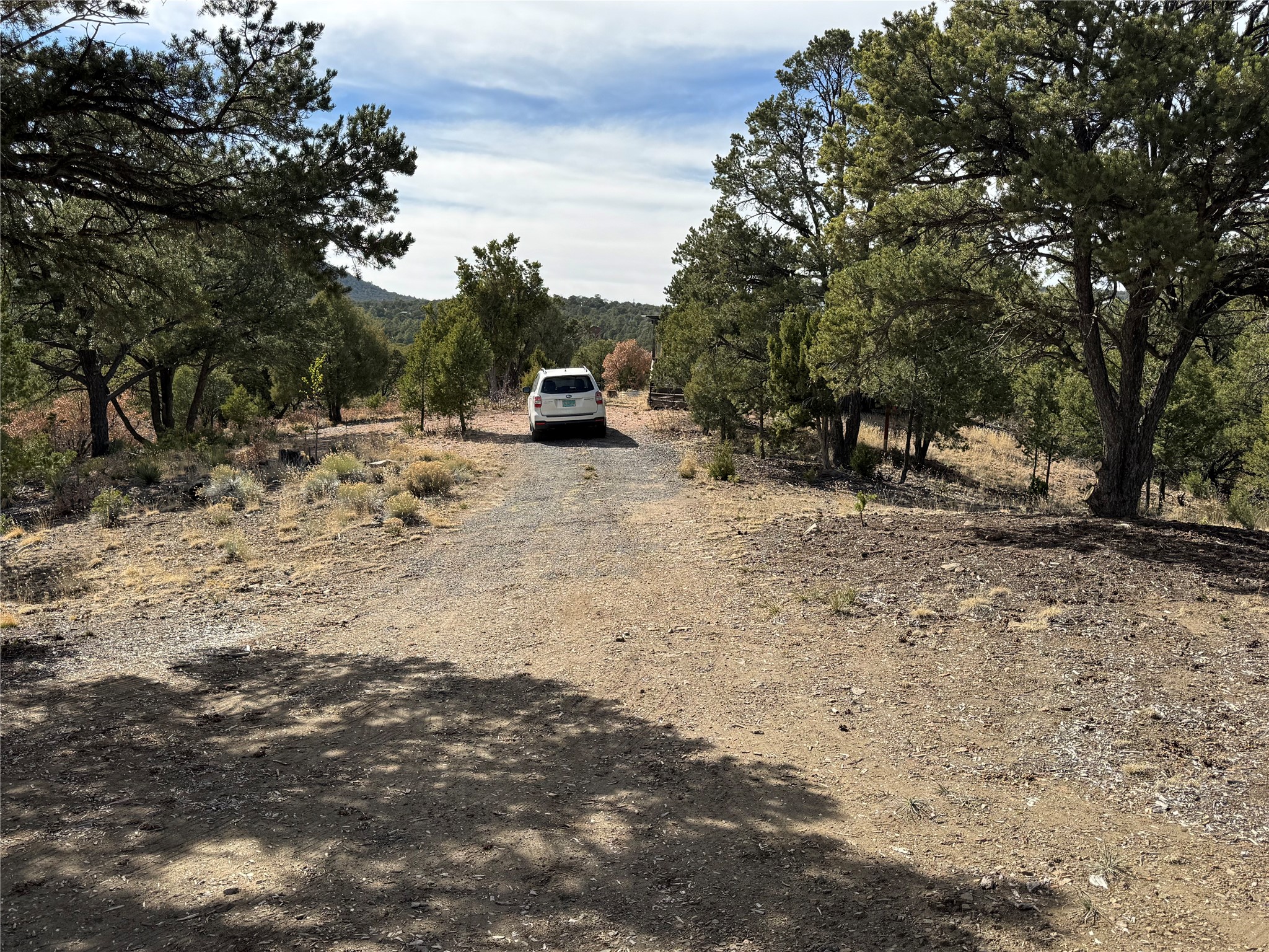 Incredible view lot at a height of land ... private, quiet with fabulous starry night sky. Looking for your own personal retreat from the world and yet only 25 minutes from the plaza ... then look no further than this special 5 acres of land that also has an insulated tiny home with a functional kitchen, shower, living / dining area and a yummy sleeping loft. Live here while you build your dream home on multiple flat building sites. The 5 acres were professionally thinned for wildfire danger in 2019 by the Soil and Water Conservation District. There is a shared well with a well agreement and a road agreement. Electricity is roughed in with easy access to the tiny home. Covenants are in place to protect the beauty of the area. There is a bath / shower deck just below the tiny house with a galvanized soaking tub and shower powered by a solar panel. Extras include a gas powered generator, extra propane tanks, easy to use outhouse and a huge water holding tank. The deep smell of pine, views all around and the depth of privacy feels amazing to experience .... Come on up and take a look!