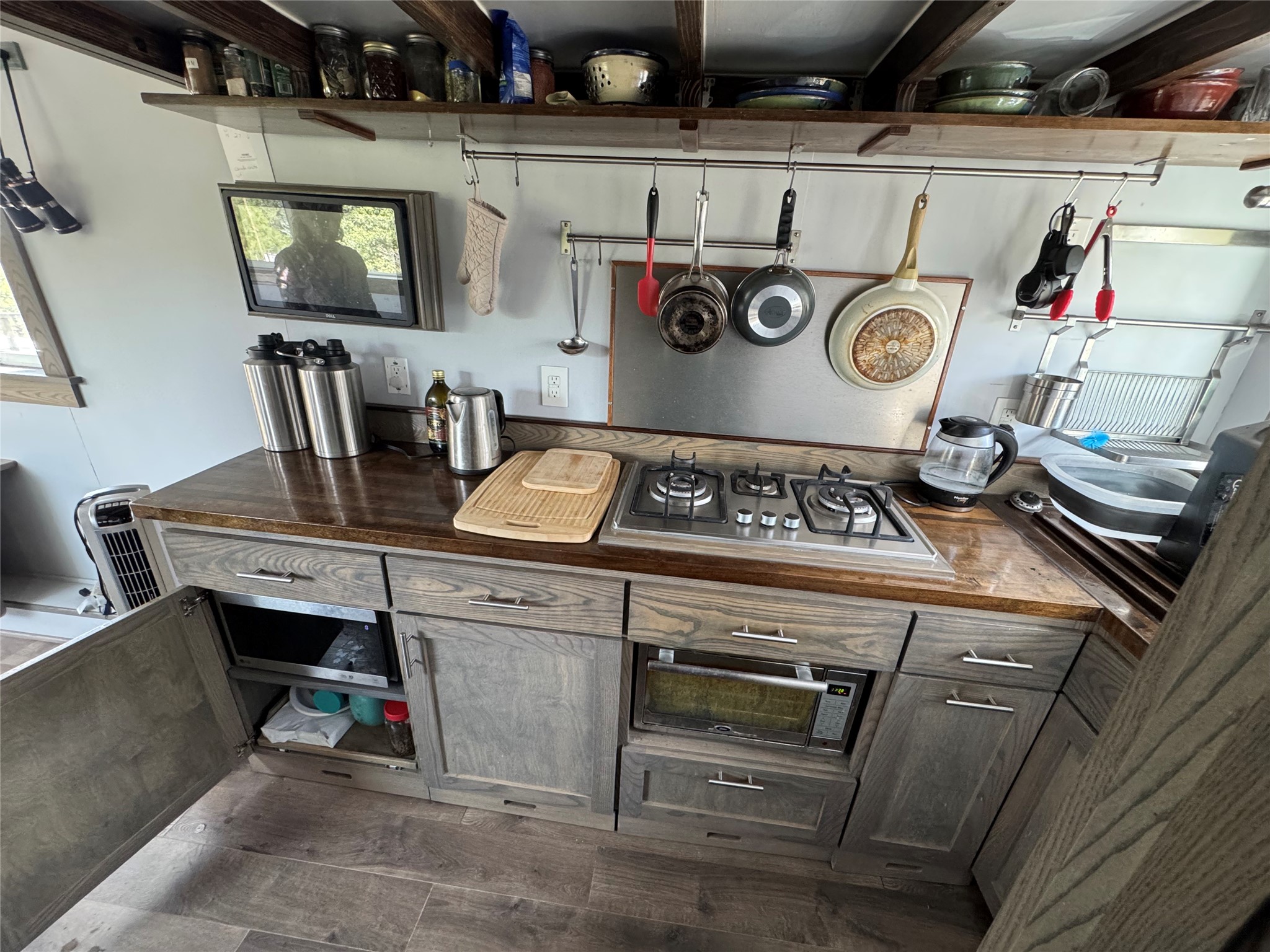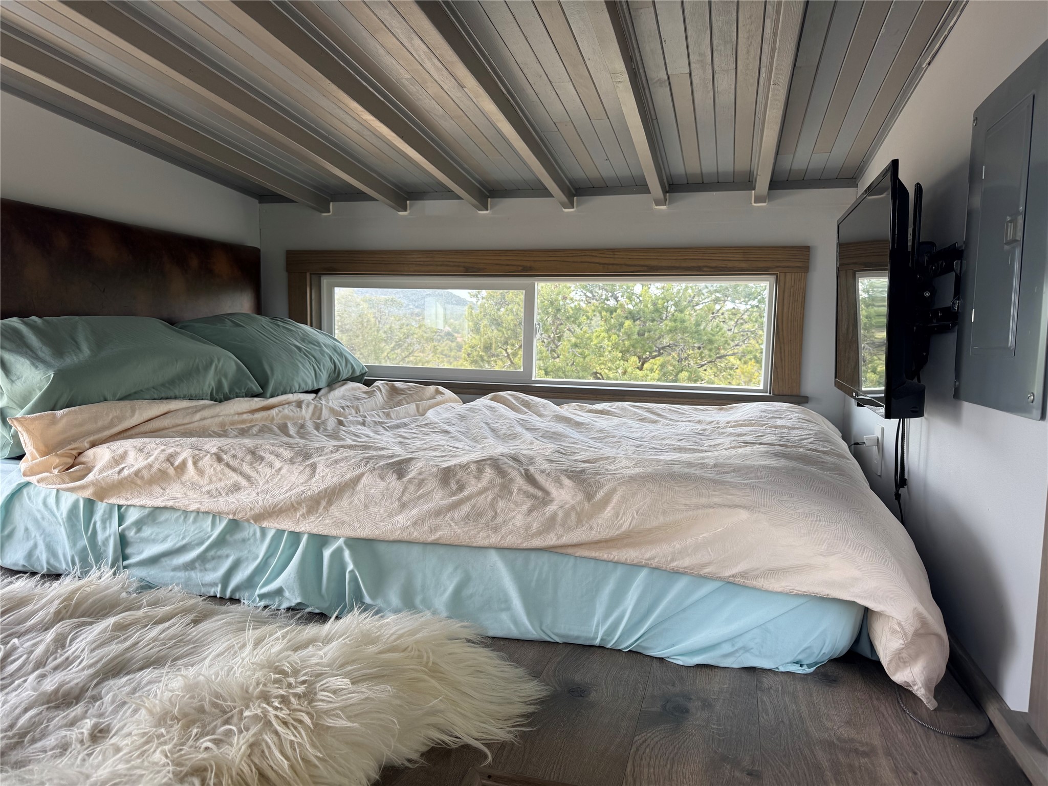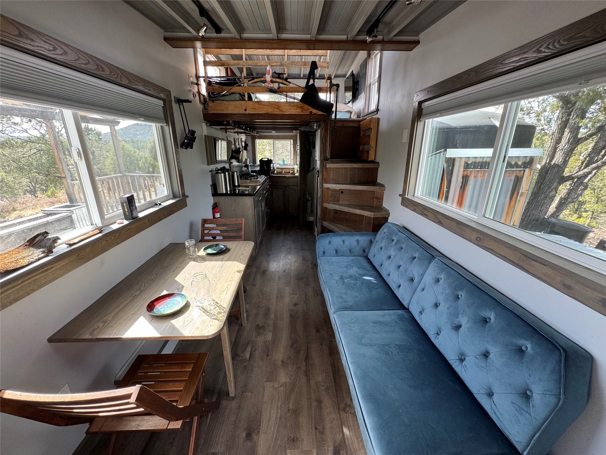 Incredible view lot at a height of land ... private, quiet with fabulous starry night sky. Looking for your own personal retreat from the world and yet only 25 minutes from the plaza ... then look no further than this special 5 acres of land that also has an insulated tiny home with a functional kitchen, shower, living / dining area and a yummy sleeping loft. Live here while you build your dream home on multiple flat building sites. The 5 acres were professionally thinned for wildfire danger in 2019 by the Soil and Water Conservation District. There is a shared well with a well agreement and a road agreement. Electricity is roughed in with easy access to the tiny home. Covenants are in place to protect the beauty of the area. There is a bath / shower deck just below the tiny house with a galvanized soaking tub and shower powered by a solar panel. Extras include a gas powered generator, extra propane tanks, easy to use outhouse and a huge water holding tank. The deep smell of pine, views all around and the depth of privacy feels amazing to experience .... Come on up and take a look!