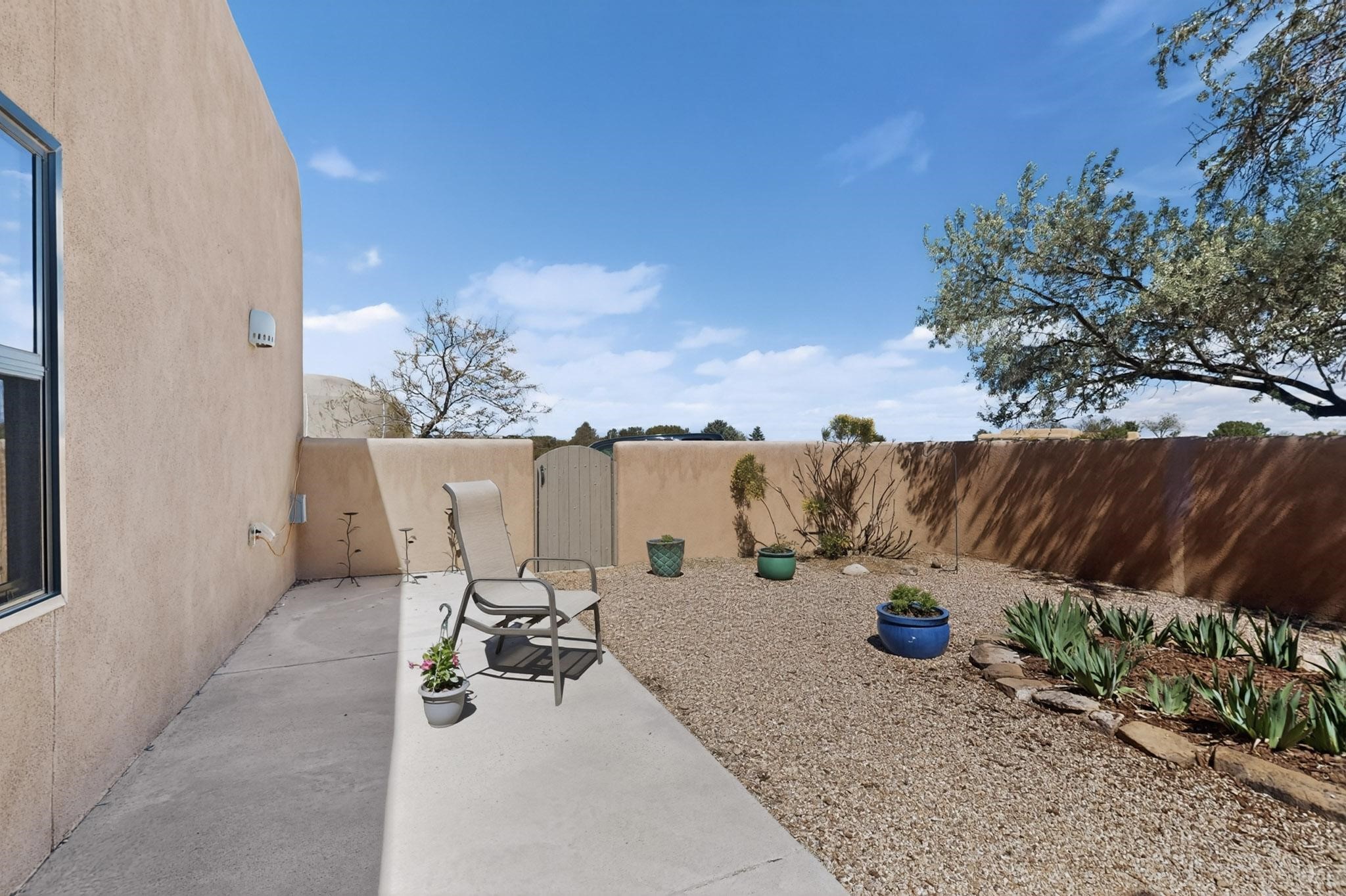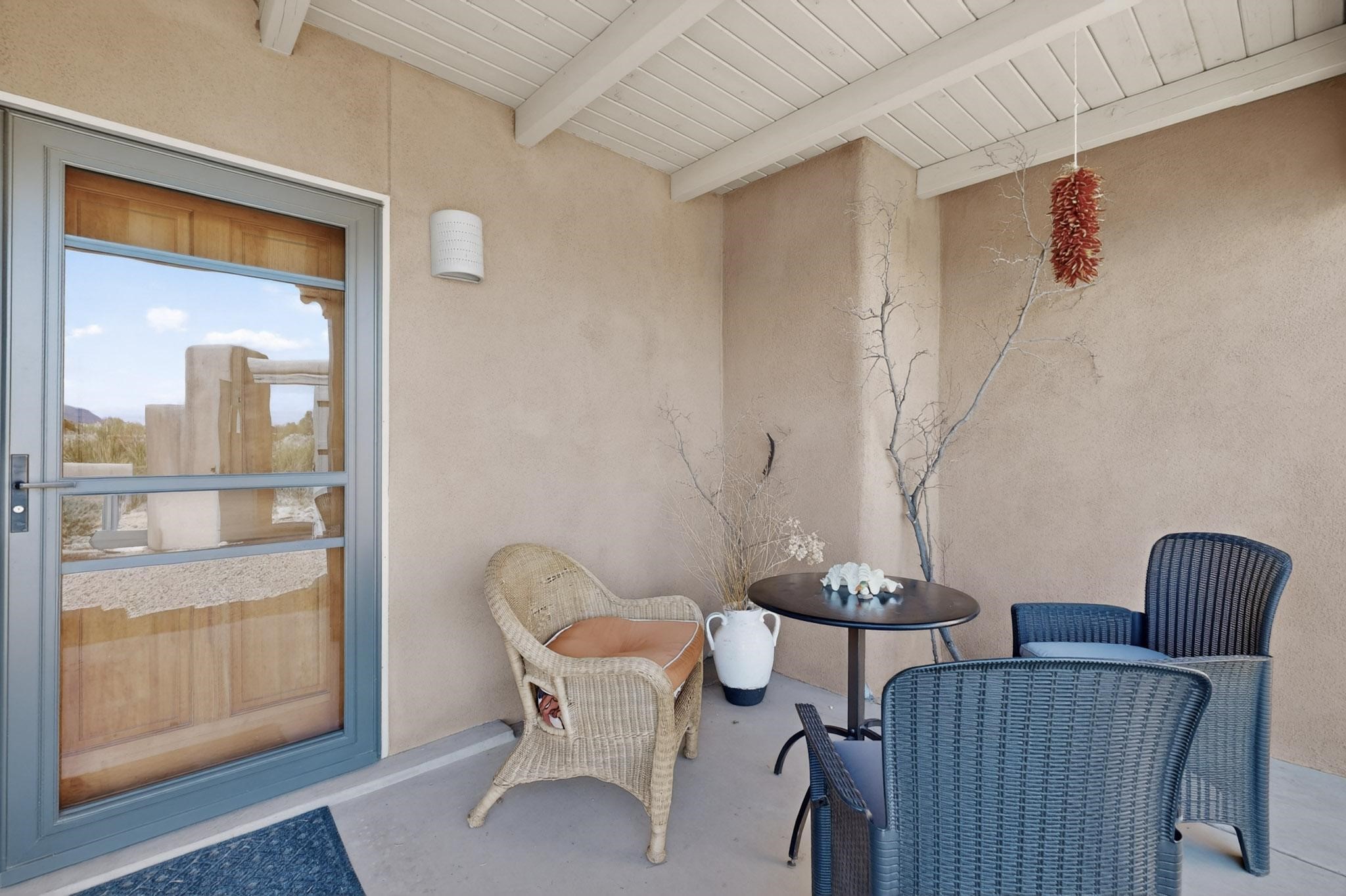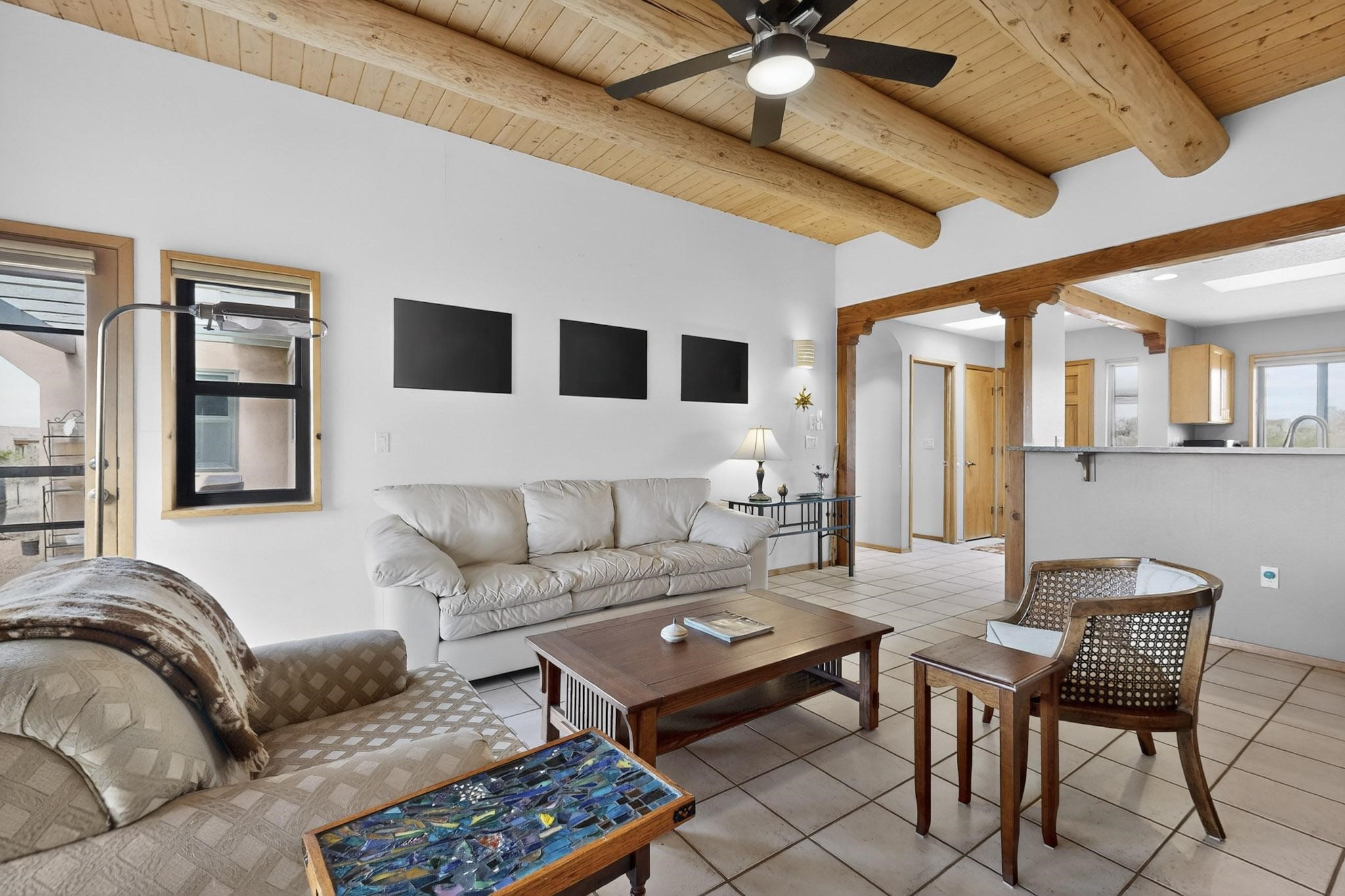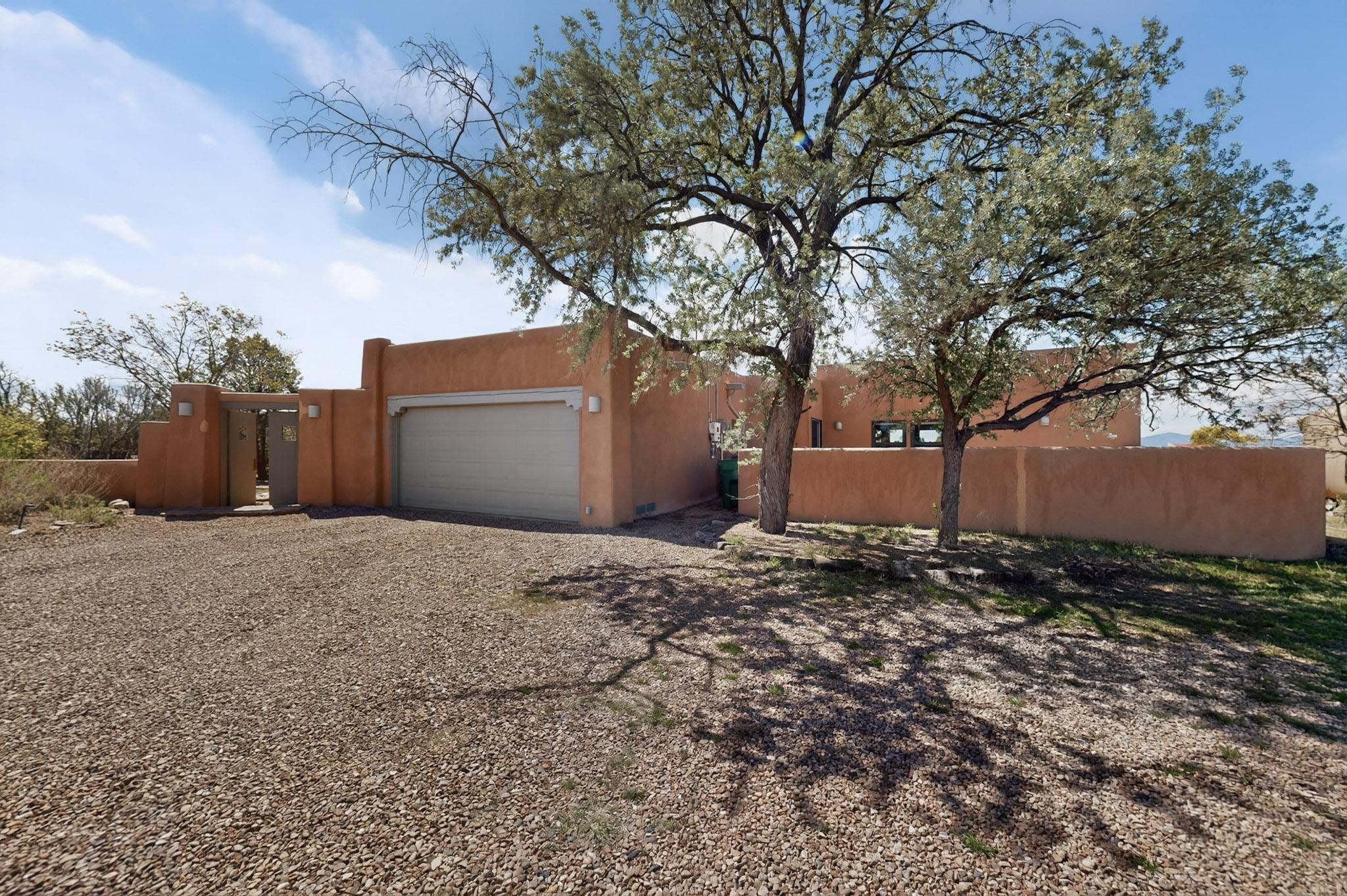 Lovely passive solar, open plan design built by Sierra Homes in 1993 and enlarged by the prior original owner to 2258sf heated living space. The contemporary pueblo character has been maintained throughout with a gas kiva, a wall fireplace and viga beams in the newer suite plus the original wood burning kiva and Santa Fe features in the great room. The current owners have also added the benefit of photovoltaic solar panels, 5 high heat/AC mini splits for summer and winter comfort. The refreshed kitchen features an induction range top and multi-mode oven, adjoins a large formal dining room making it ideal for entertaining as it flows also to a sunset, mountain view portal and patio. There is a 2 car finished garage and extra parking area added. Herrada Rd has been recently paved making easy access to the Eldorado amenities, parks, trails, local shopping and services as well as only minutes into Santa Fe.
