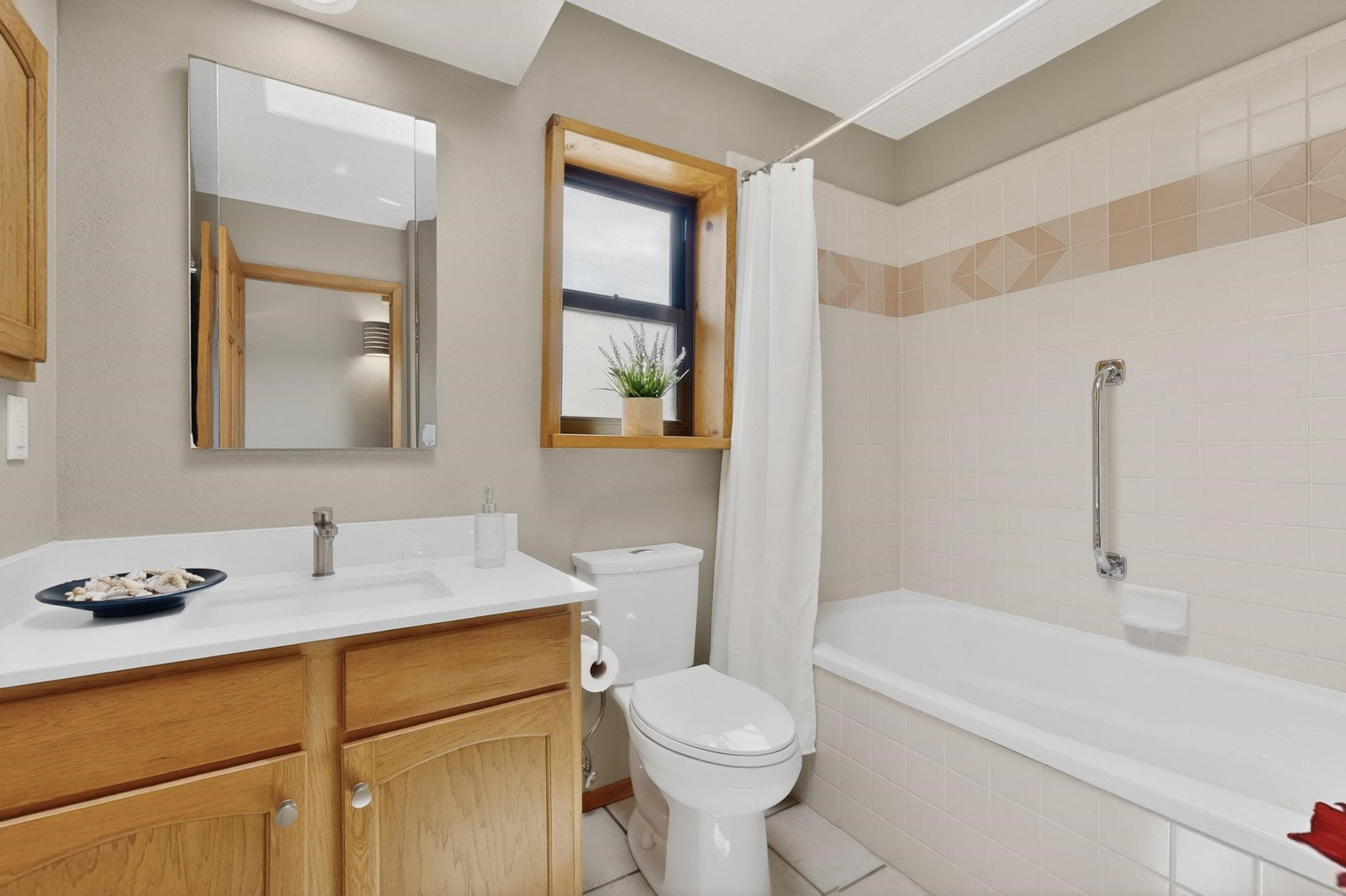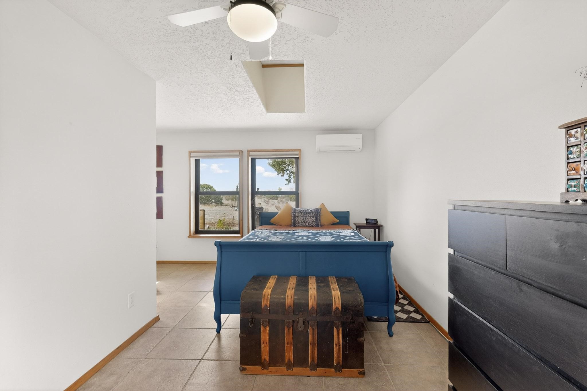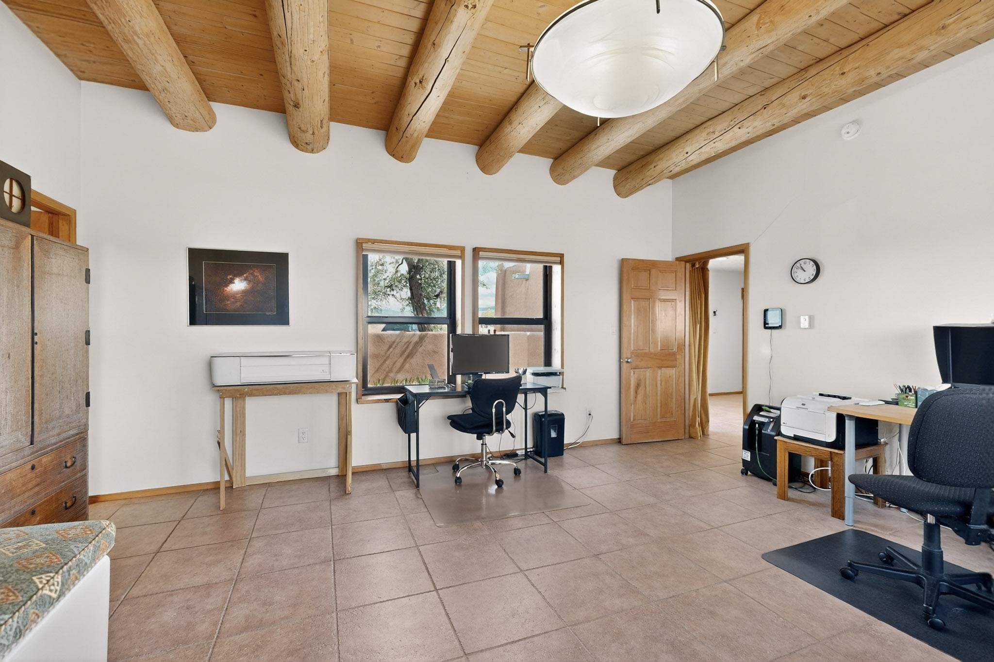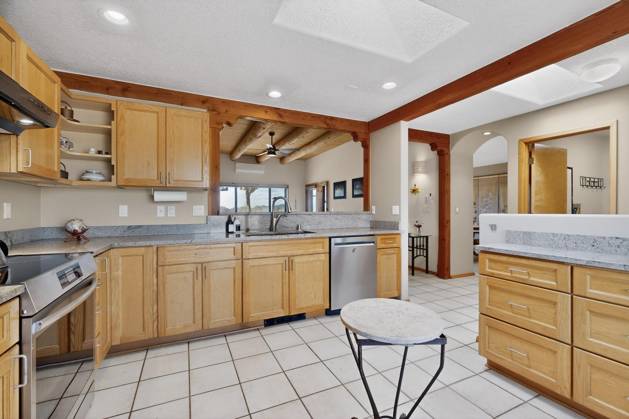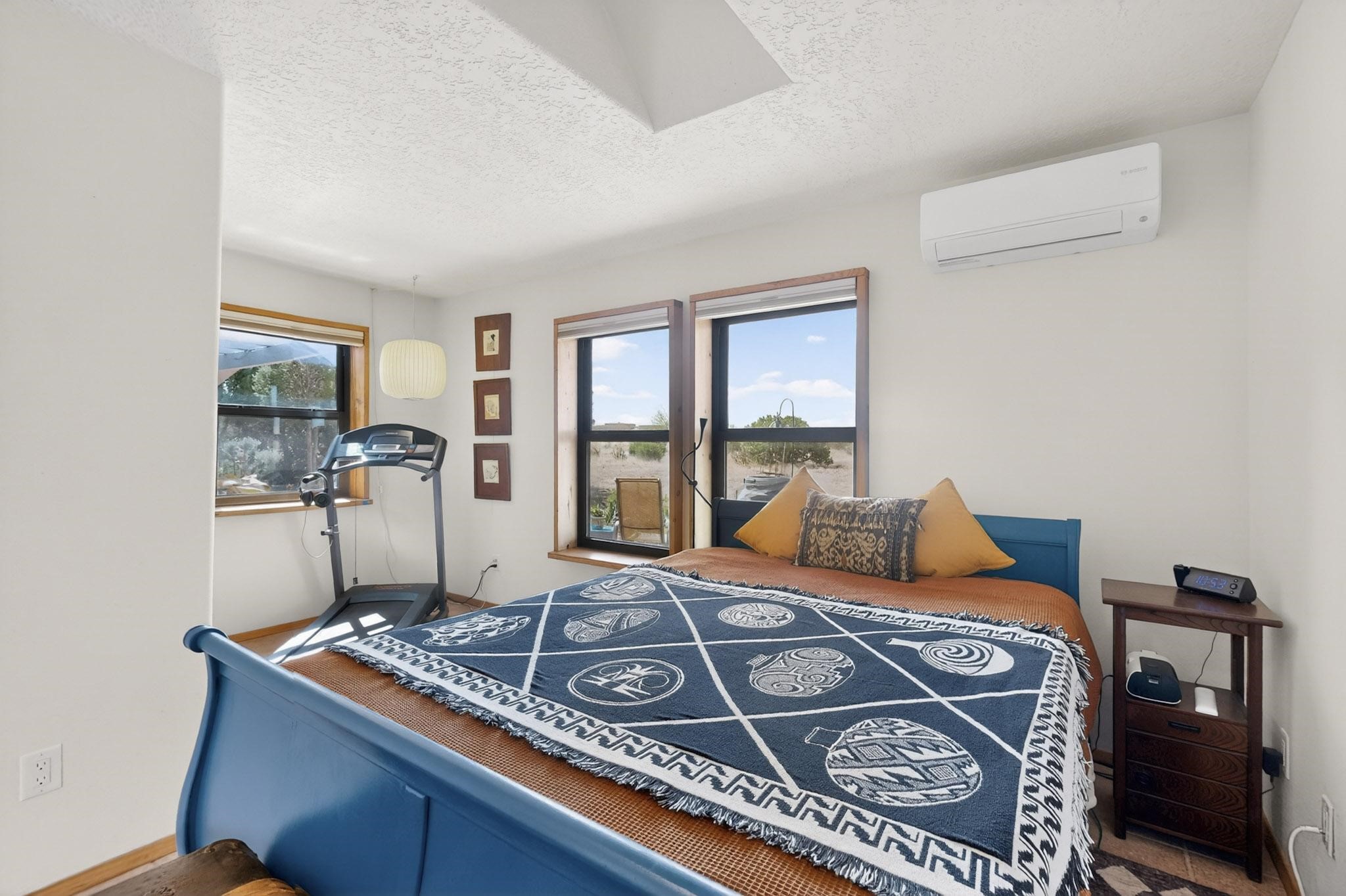 Lovely passive solar, open plan design built by Sierra Homes in 1993 and enlarged by the prior original owner to 2258sf heated living space. The contemporary pueblo character has been maintained throughout with a gas kiva, a wall fireplace and viga beams in the newer suite plus the original wood burning kiva and Santa Fe features in the great room. The current owners have also added the benefit of photovoltaic solar panels, 5 high heat/AC mini splits for summer and winter comfort. The refreshed kitchen features an induction range top and multi-mode oven, adjoins a large formal dining room making it ideal for entertaining as it flows also to a sunset, mountain view portal and patio. There is a 2 car finished garage and extra parking area added. Herrada Rd has been recently paved making easy access to the Eldorado amenities, parks, trails, local shopping and services as well as only minutes into Santa Fe.