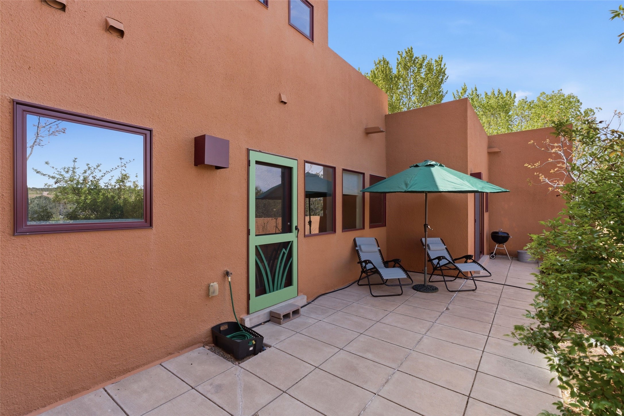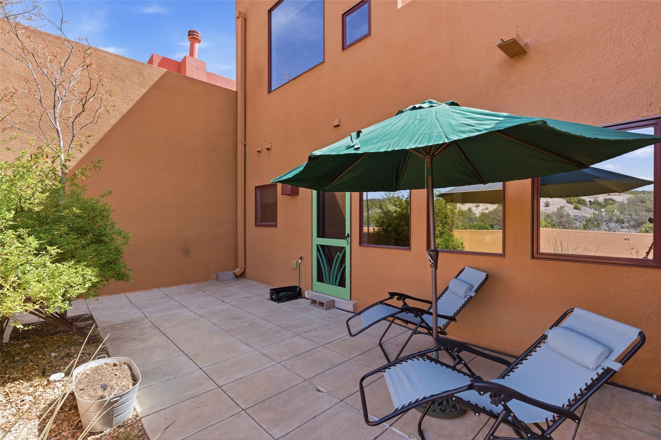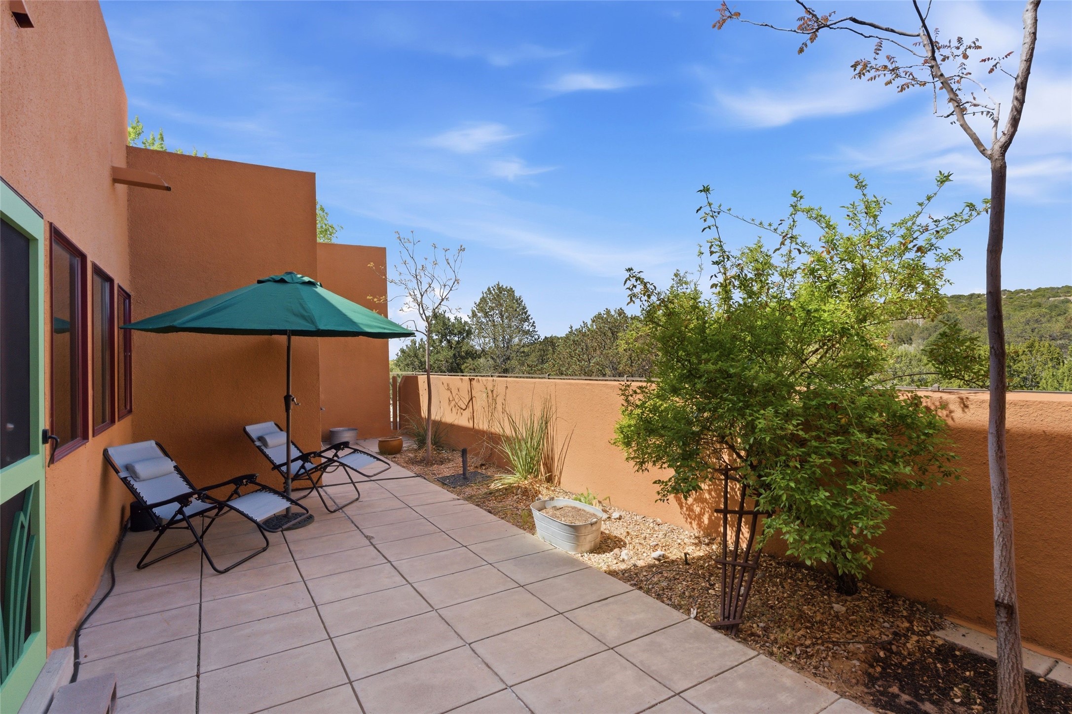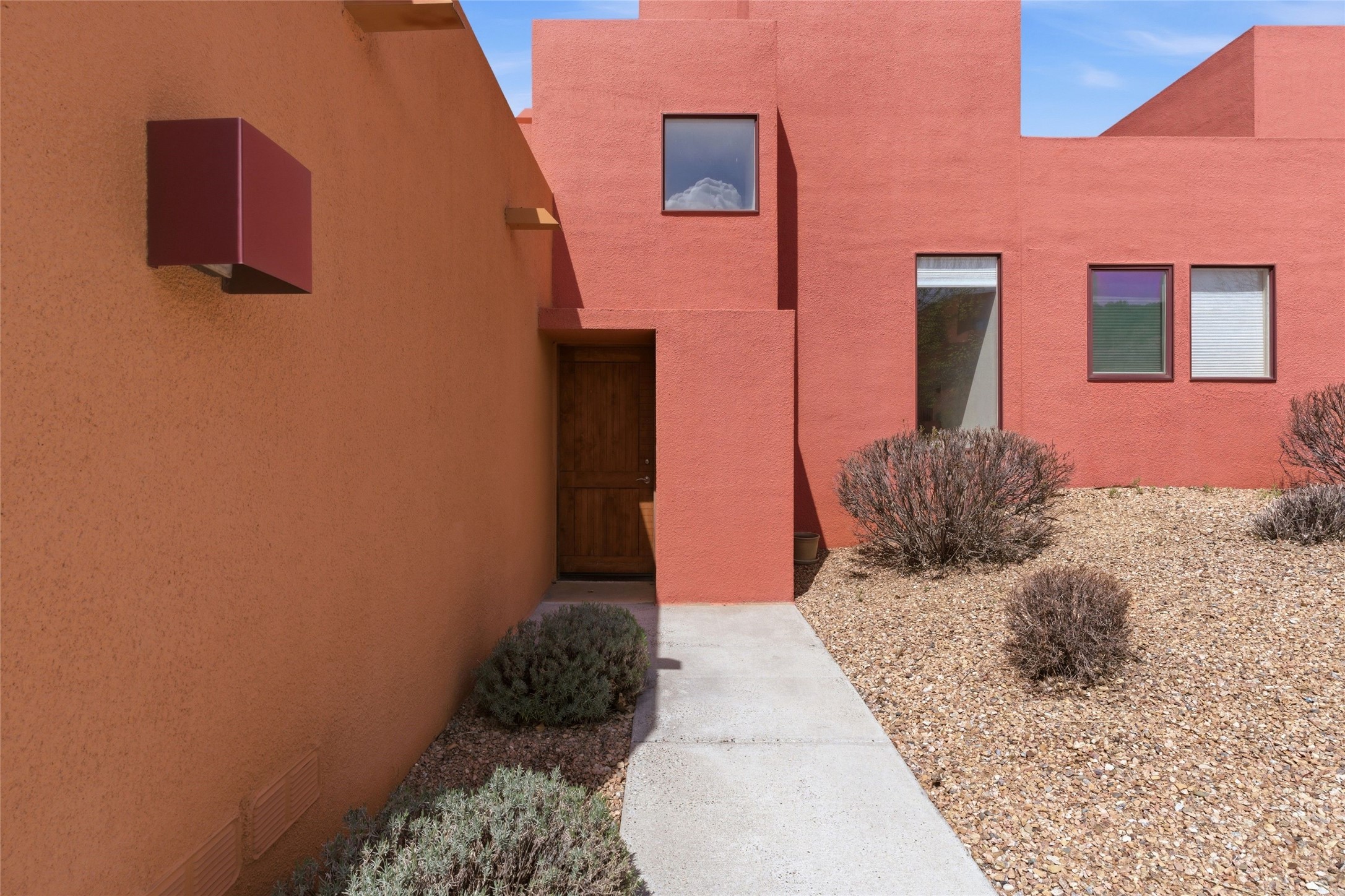 Ricardo Legoretta designed modern comfort in the desirable Northside community of Zocalo. This is atwo bedroom, two and half bath, two story condominium less than ten minutes to downtown Santa Fe, shopping, museums and galleries. Built in 2005, the unit offers two generous master suites; one upstairs with a private balcony, the other downstairs, offering direct access out to the landscaped patio. Downstairs offers open living / entertaining spaces with a two sided fireplace separating the kitchen, living area and dining area. High ceilings over the dining room offer ample skylights tile floors and wood ceilings over the living room are just some of the architectural finishes expected in a Santa Fe home. The open space allows for flexible usage and placement of furniture - depending on your lifestyle! Recent upgrades include a new oven / stove, a raised granite bathroom countertop in the upstairs suite, a utility sink in the garage, and two 14' Golden Rain trees in the back patio. Regarded as one of the most popular floor plans, this "Barranca" unit offers west facing views over the arroyo and into the tree-studded hillside. The finished twocar garage offers direct entry into the home. Zocalo community amenities include two fitness facilities, a clubhouse, pool, spa as well as resources for on-site property management and maintenance.