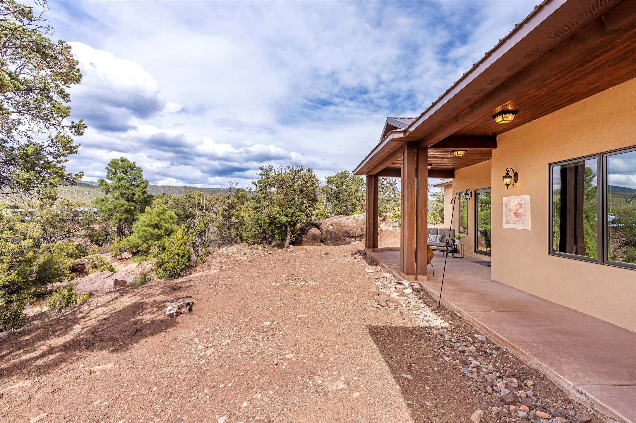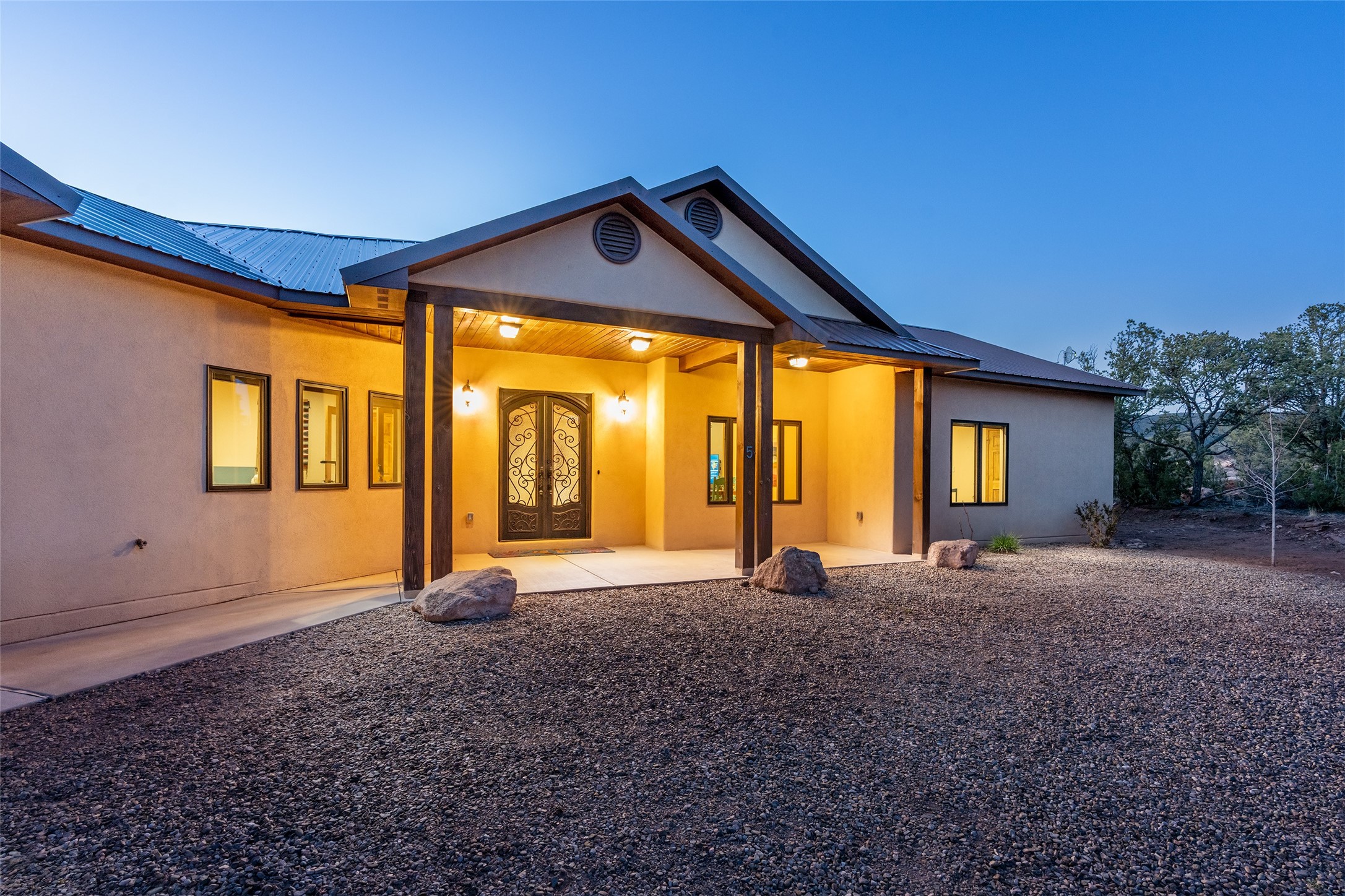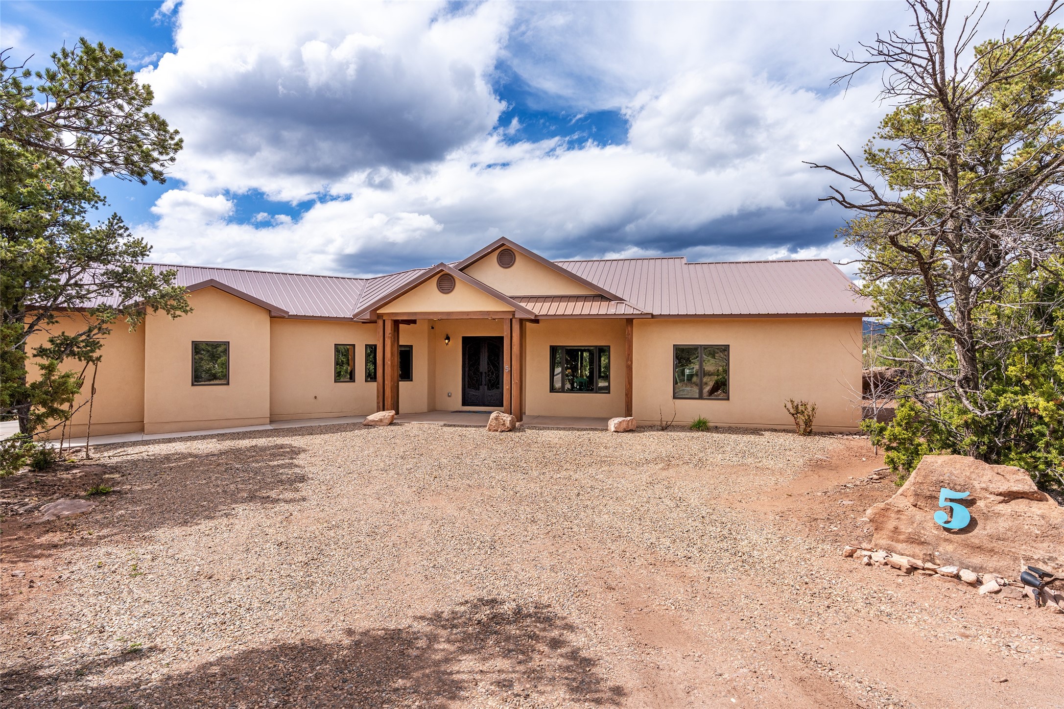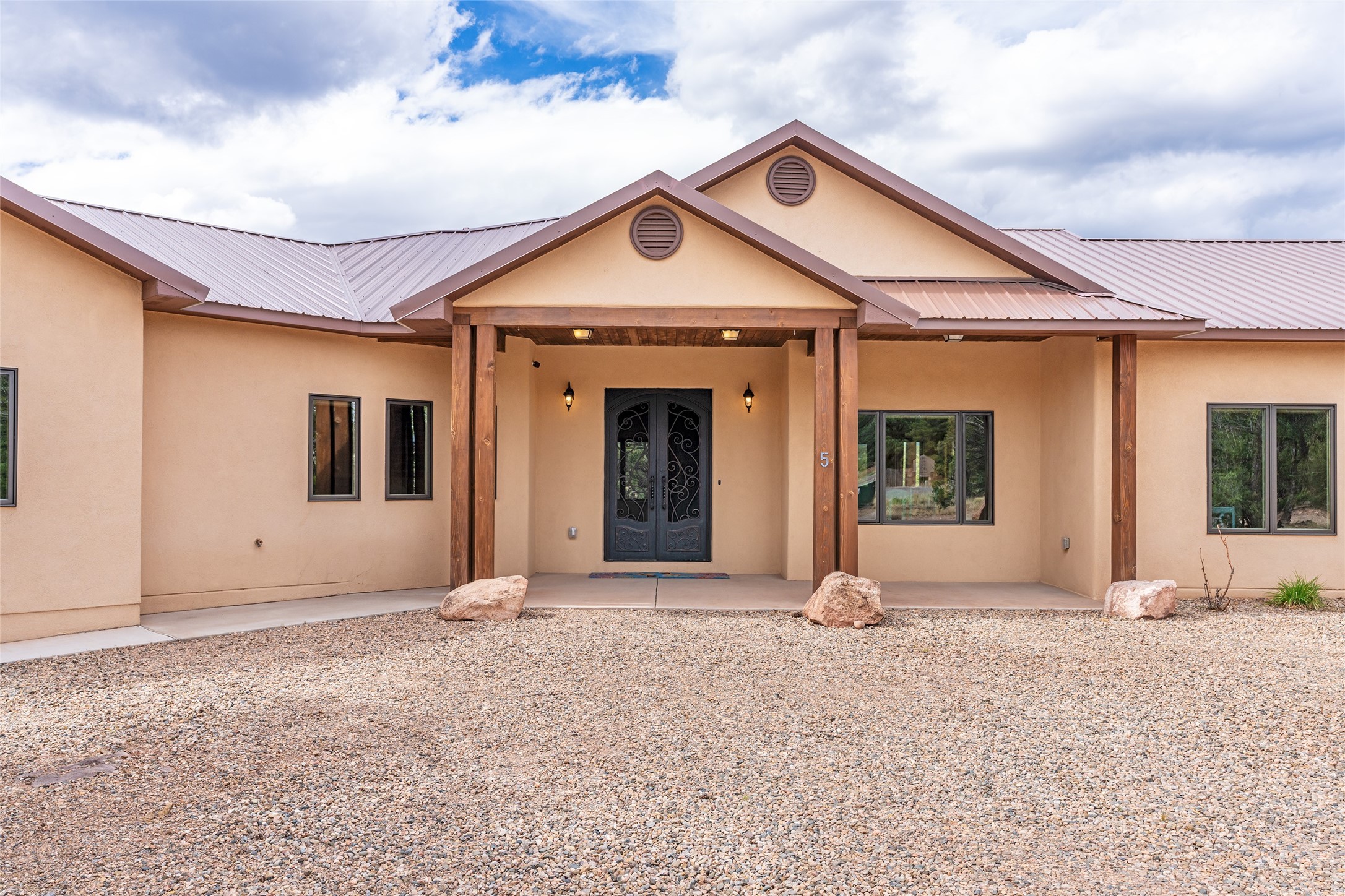 Built in 2021, this beautiful Pecos retreat is the perfect blend of modern comfort and cabin-like living with easy access to the amenities of Santa Fe and the Pecos Wilderness for outdoor enthusiasts. Located directly off of a county-maintained road, this is ideal for year-round living. Designed for both everyday living and entertaining, the open-concept kitchen features soft-close cabinetry, a large pantry and an Elmira Stove Works retro-inspired gas and electric range with convection oven. The spacious living room showcases vaulted ceilings with wood beams and opens to a covered rear portal perfect for taking in the surrounding scenery and enjoying the clear, starry night skies. The split floor plan provides excellent privacy. The generous primary suite includes a luxurious ensuite bath with dual vanities, granite counters, a custom tiled shower, two walk-in closets with built-ins, and separate commode areas. On the opposite side of the home, two well-sized guest bedrooms, one with dual walk-in closets, share a Jack-and-Jill bath with double sinks and granite finishes.Additional highlights include a spacious office with French doors, a finished 2-car garage with overhead storage and direct entry into a large laundry room, Pella windows and doors, forced air heating with central refrigerated A/C, a pitched pro-panel roof, tankless hot water heater, and a whole-house water softener. Serviced by Village of Pecos water and sewer, Mora-San Miguel Electric, and propane gas, this thoughtfully designed property offers comfort, functionality, and stunning views in a peaceful setting.