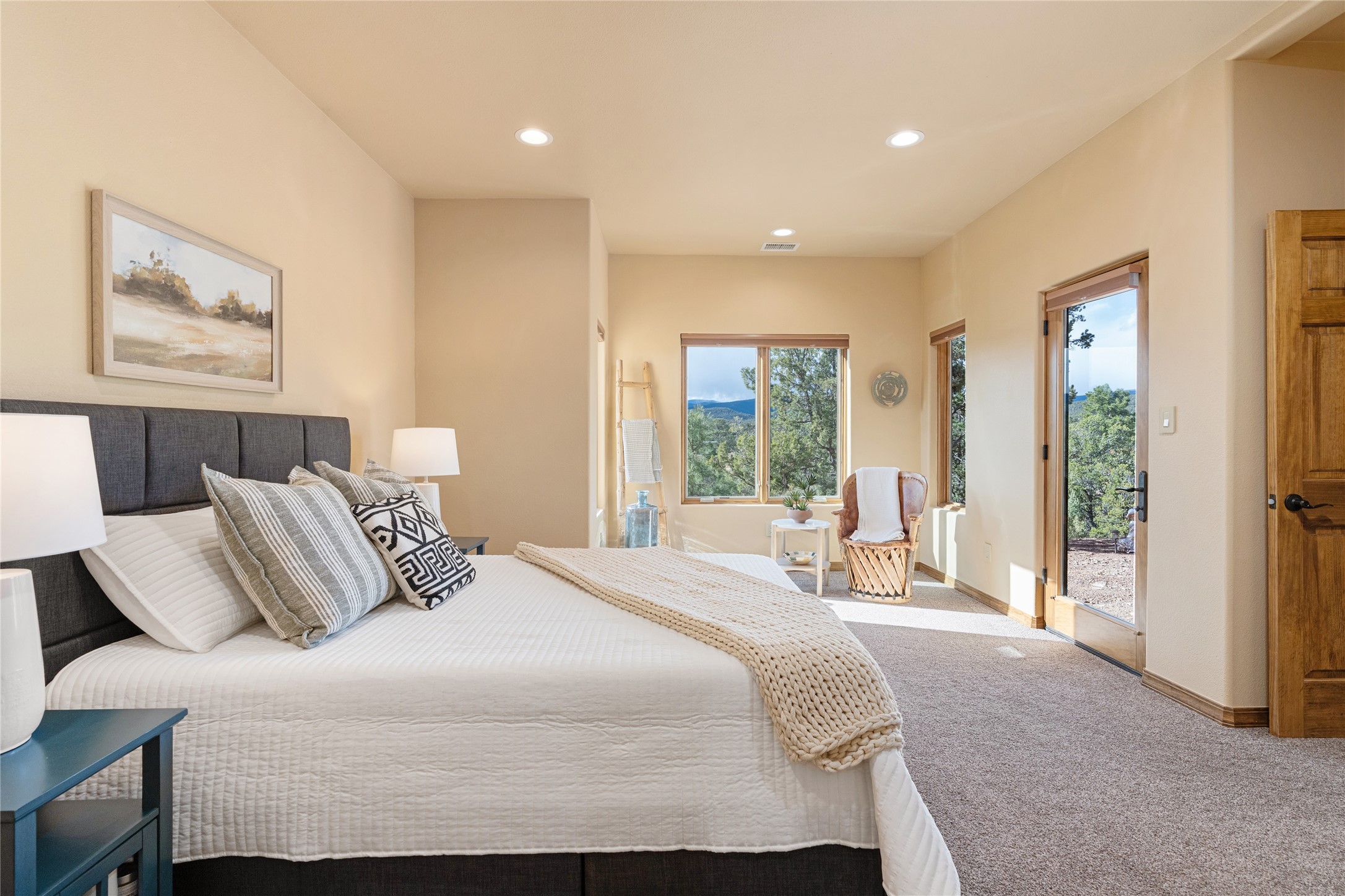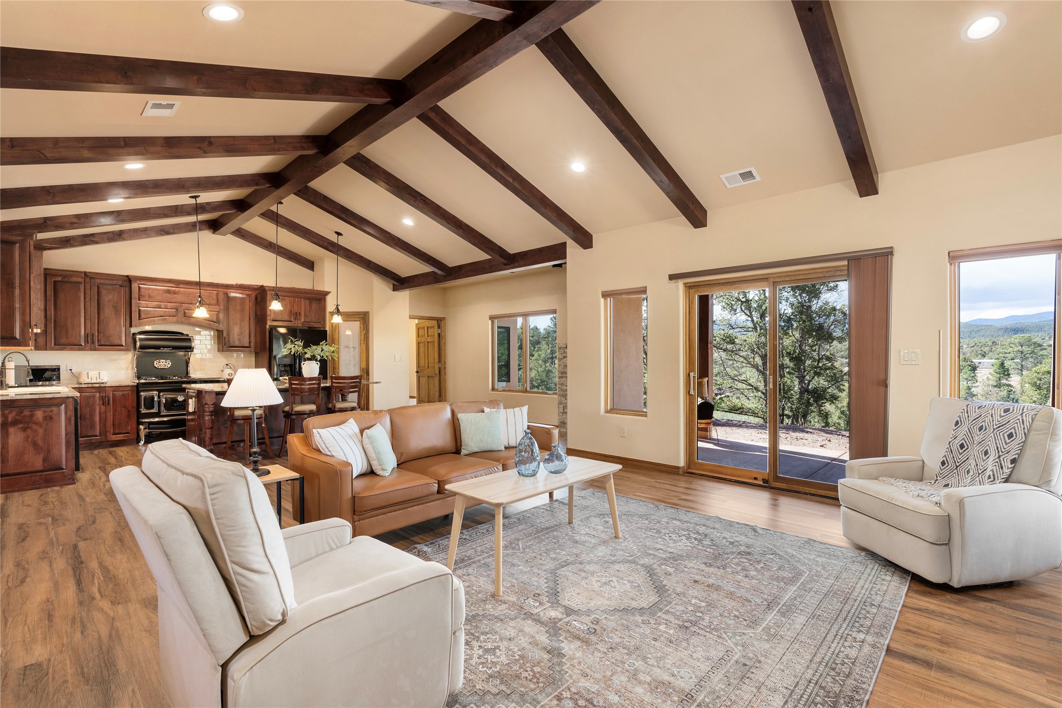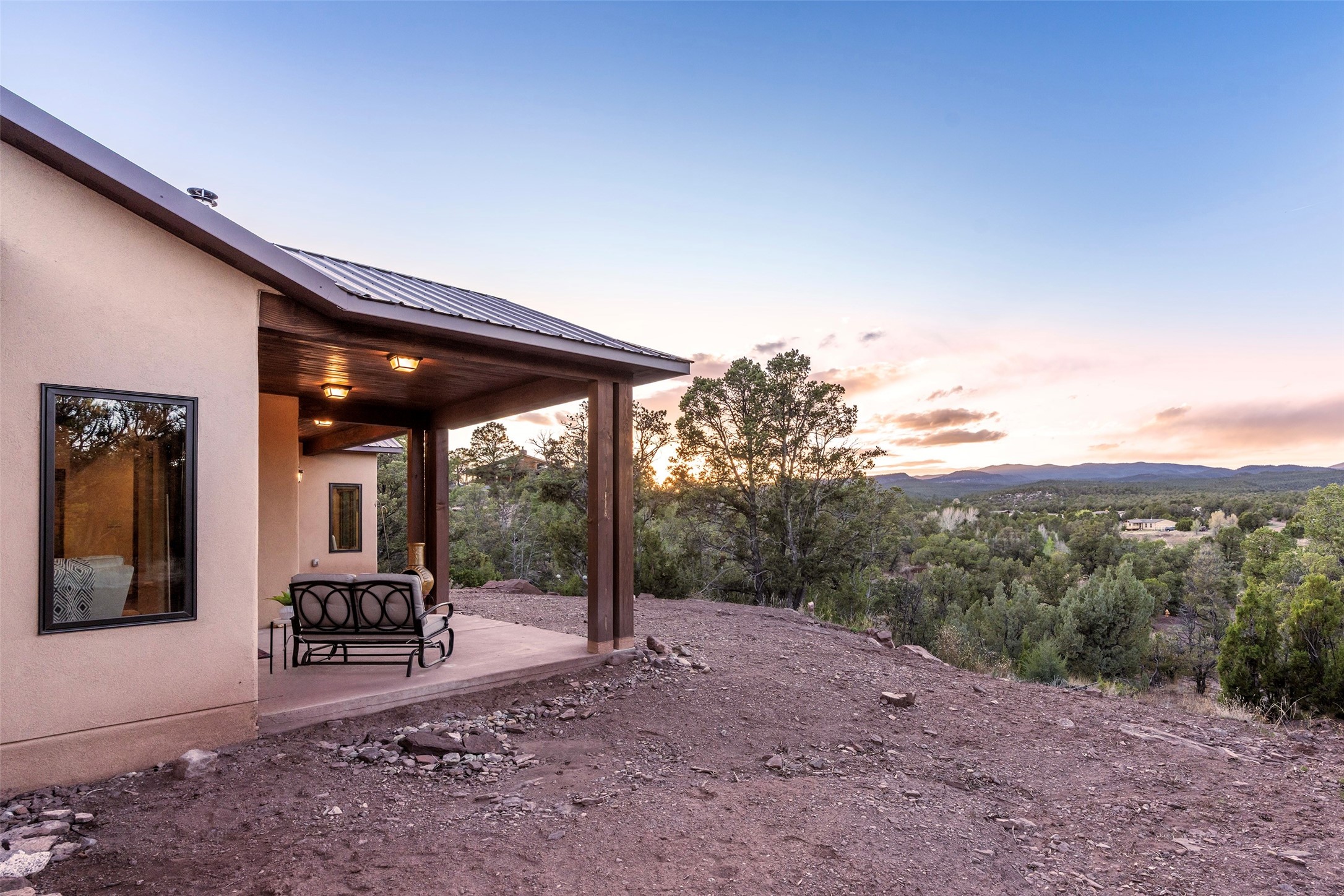 Built in 2021, this beautiful Pecos retreat is the perfect blend of modern comfort and cabin-like living with easy access to the amenities of Santa Fe and the Pecos Wilderness for outdoor enthusiasts. Located directly off of a county-maintained road, this is ideal for year-round living. Designed for both everyday living and entertaining, the open-concept kitchen features soft-close cabinetry, a large pantry and an Elmira Stove Works retro-inspired gas and electric range with convection oven. The spacious living room showcases vaulted ceilings with wood beams and opens to a covered rear portal perfect for taking in the surrounding scenery and enjoying the clear, starry night skies. The split floor plan provides excellent privacy. The generous primary suite includes a luxurious ensuite bath with dual vanities, granite counters, a custom tiled shower, two walk-in closets with built-ins, and separate commode areas. On the opposite side of the home, two well-sized guest bedrooms, one with dual walk-in closets, share a Jack-and-Jill bath with double sinks and granite finishes.Additional highlights include a spacious office with French doors, a finished 2-car garage with overhead storage and direct entry into a large laundry room, Pella windows and doors, forced air heating with central refrigerated A/C, a pitched pro-panel roof, tankless hot water heater, and a whole-house water softener. Serviced by Village of Pecos water and sewer, Mora-San Miguel Electric, and propane gas, this thoughtfully designed property offers comfort, functionality, and stunning views in a peaceful setting.