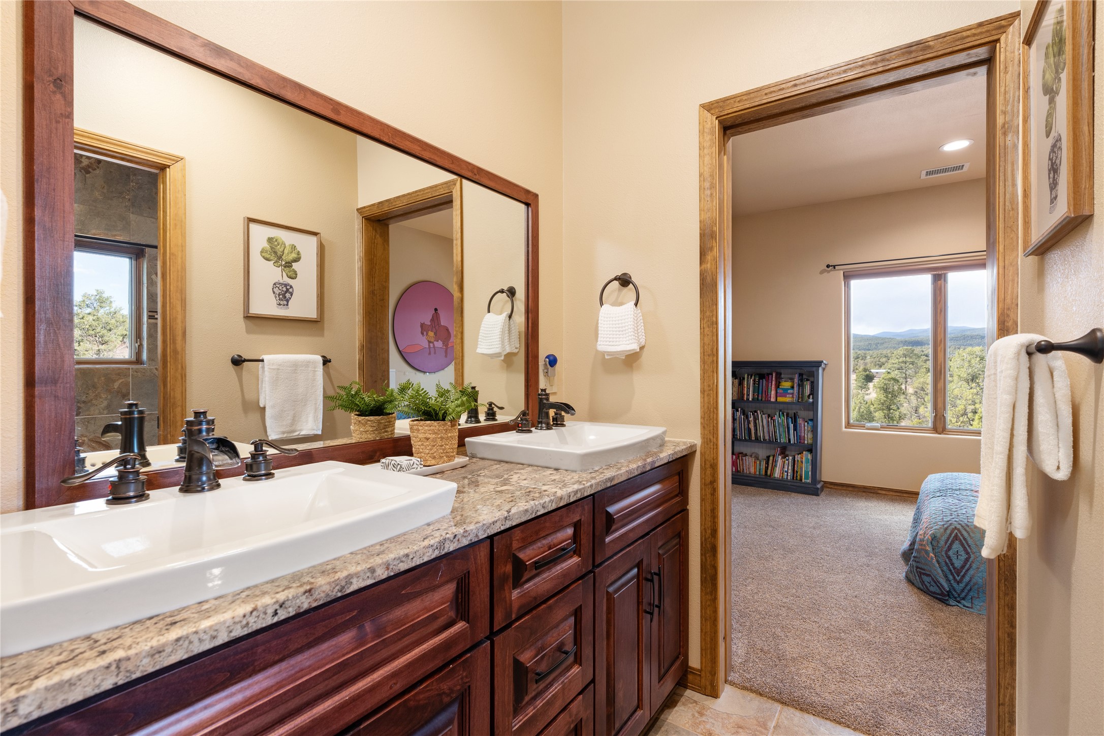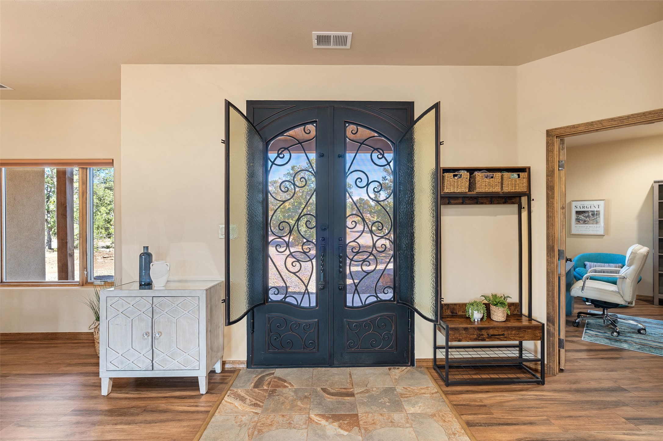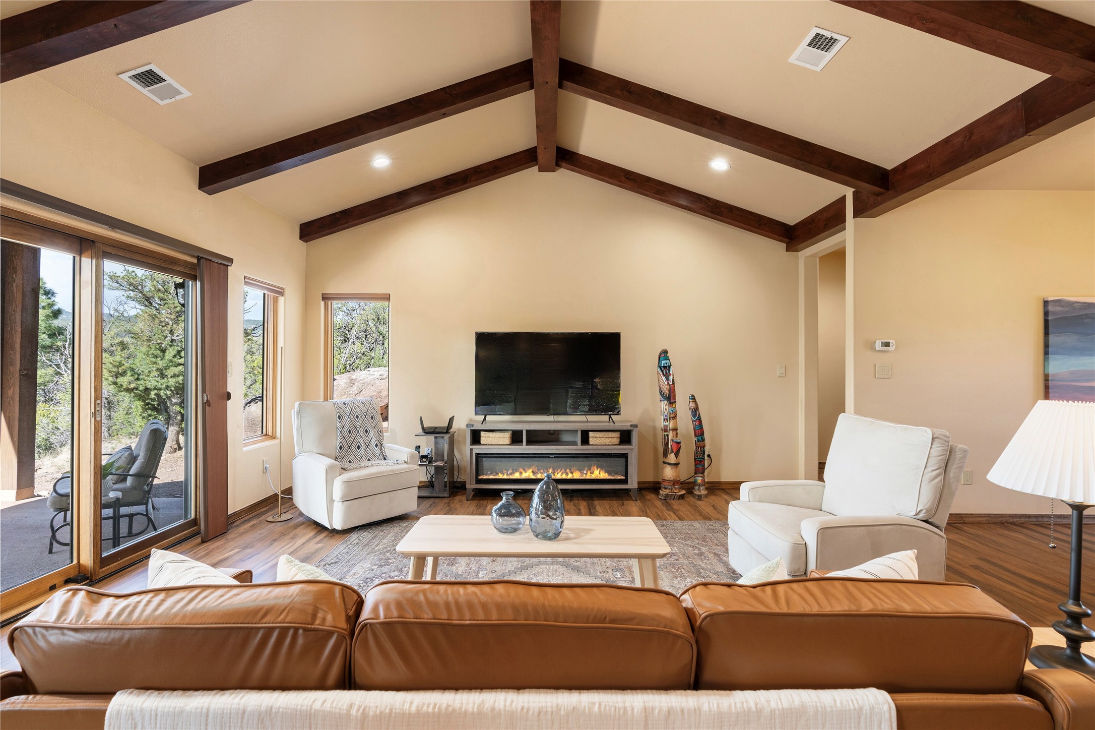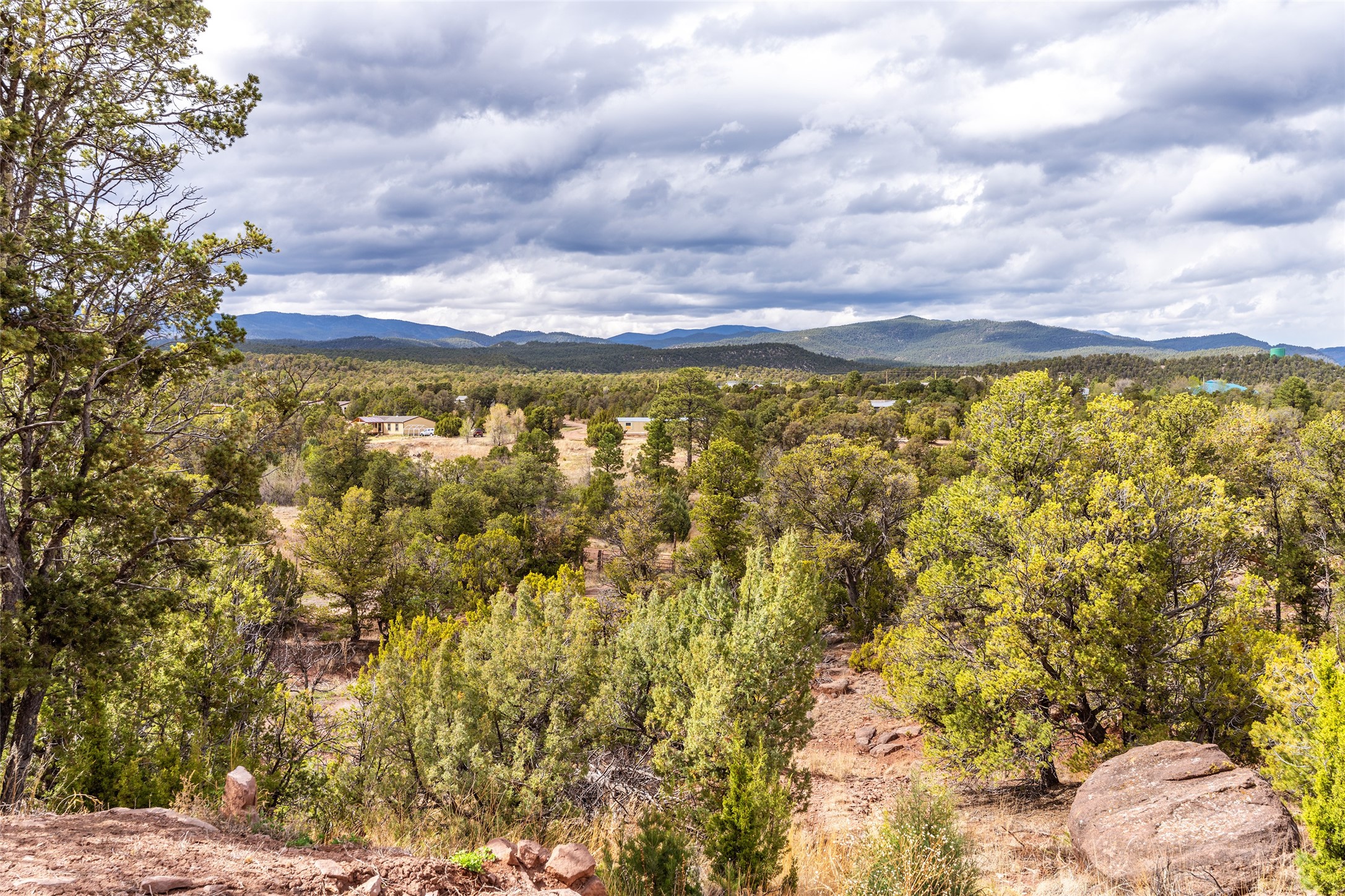 Built in 2021, this beautiful Pecos retreat is the perfect blend of modern comfort and cabin-like living with easy access to the amenities of Santa Fe and the Pecos Wilderness for outdoor enthusiasts. Located directly off of a county-maintained road, this is ideal for year-round living. Designed for both everyday living and entertaining, the open-concept kitchen features soft-close cabinetry, a large pantry and an Elmira Stove Works retro-inspired gas and electric range with convection oven. The spacious living room showcases vaulted ceilings with wood beams and opens to a covered rear portal perfect for taking in the surrounding scenery and enjoying the clear, starry night skies. The split floor plan provides excellent privacy. The generous primary suite includes a luxurious ensuite bath with dual vanities, granite counters, a custom tiled shower, two walk-in closets with built-ins, and separate commode areas. On the opposite side of the home, two well-sized guest bedrooms, one with dual walk-in closets, share a Jack-and-Jill bath with double sinks and granite finishes.Additional highlights include a spacious office with French doors, a finished 2-car garage with overhead storage and direct entry into a large laundry room, Pella windows and doors, forced air heating with central refrigerated A/C, a pitched pro-panel roof, tankless hot water heater, and a whole-house water softener. Serviced by Village of Pecos water and sewer, Mora-San Miguel Electric, and propane gas, this thoughtfully designed property offers comfort, functionality, and stunning views in a peaceful setting.