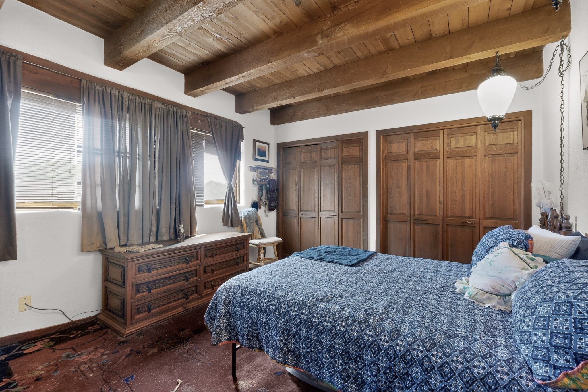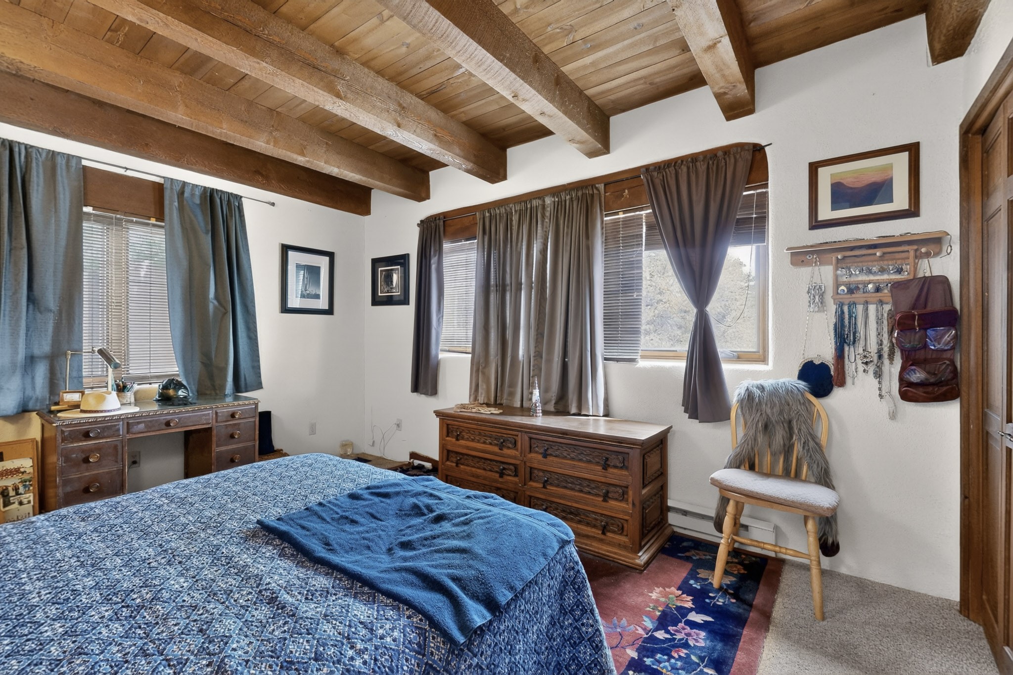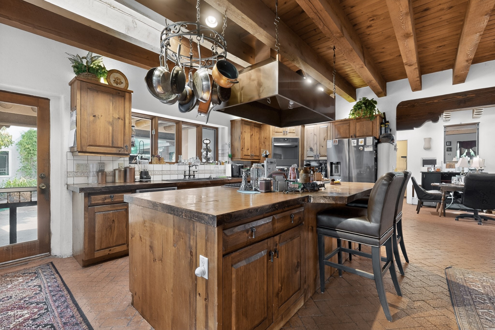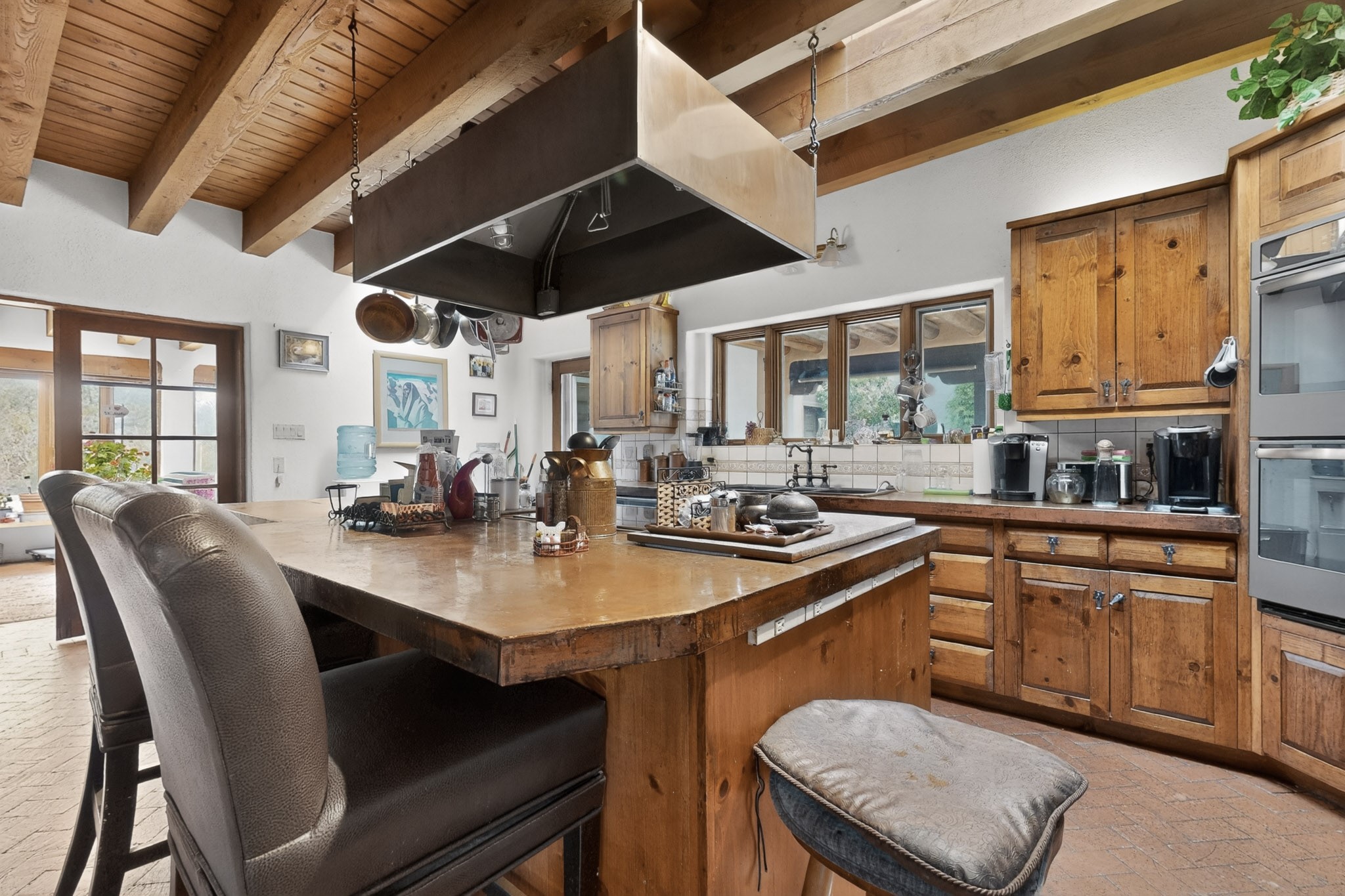 Bring your horses to this pinon and juniper covered Santa Fe County property close to town! The 10 acre parcel in Los Cerros Negros includes a main house, guest quarters, horse facility and is only 8 miles to the Santa Fe Plaza. The Southwest inspired house and guest quarters feature beautifully handcrafted wood throughout. The air conditioned main house has 3 bedrooms, 3 bathrooms and a sun room. The guest quarters has 2 bedrooms, 1 bathroom and an office. Your green thumb will be delighted with the large sun room in the main house where something can be blooming year round. The guest house could be a mother in law quarters or even an income producing property since it has its own entrance. There is abundant storage with many closets, a pantry, storage area off the covered portal and additional storage in the oversized well house.The horse barn situated away from the house includes a tack room, hay storage and 4 large stalls. Despite the country setting you are minutes away from Harry's Road House, Jambo Bobcat Bite, Cafe Fina and the Eldorado Supermarket. Just down the road is historical Santa Fe with its many dining options, art galleries and museums.