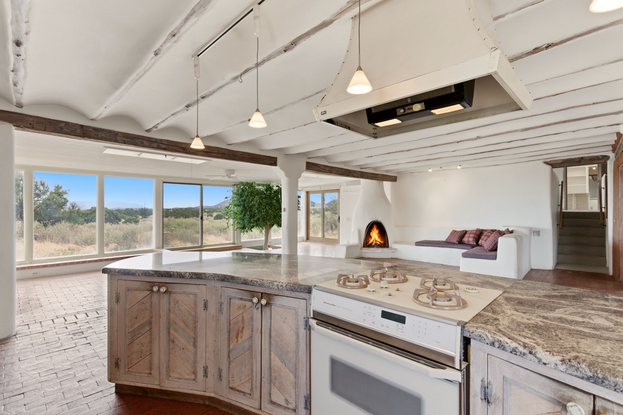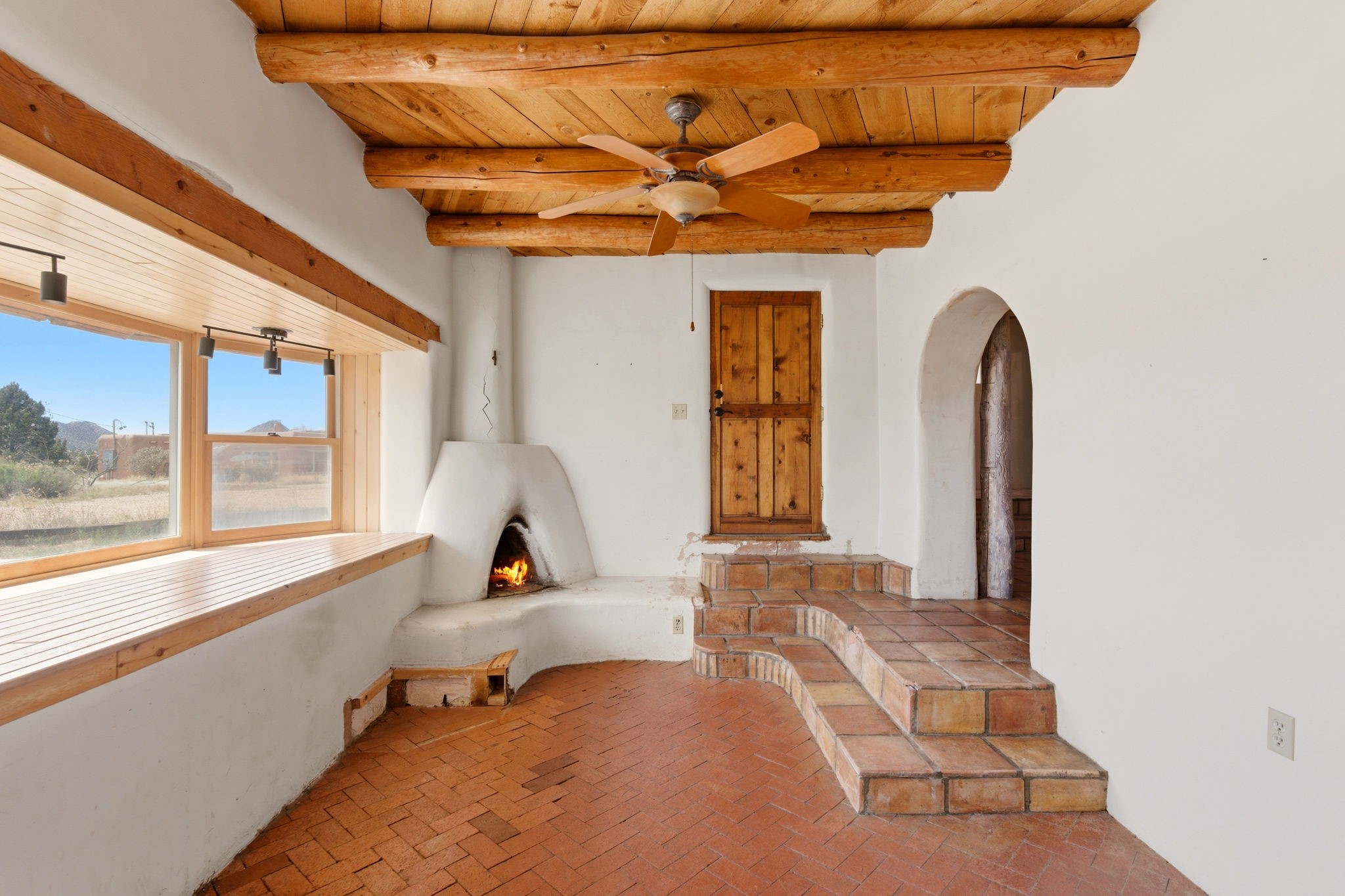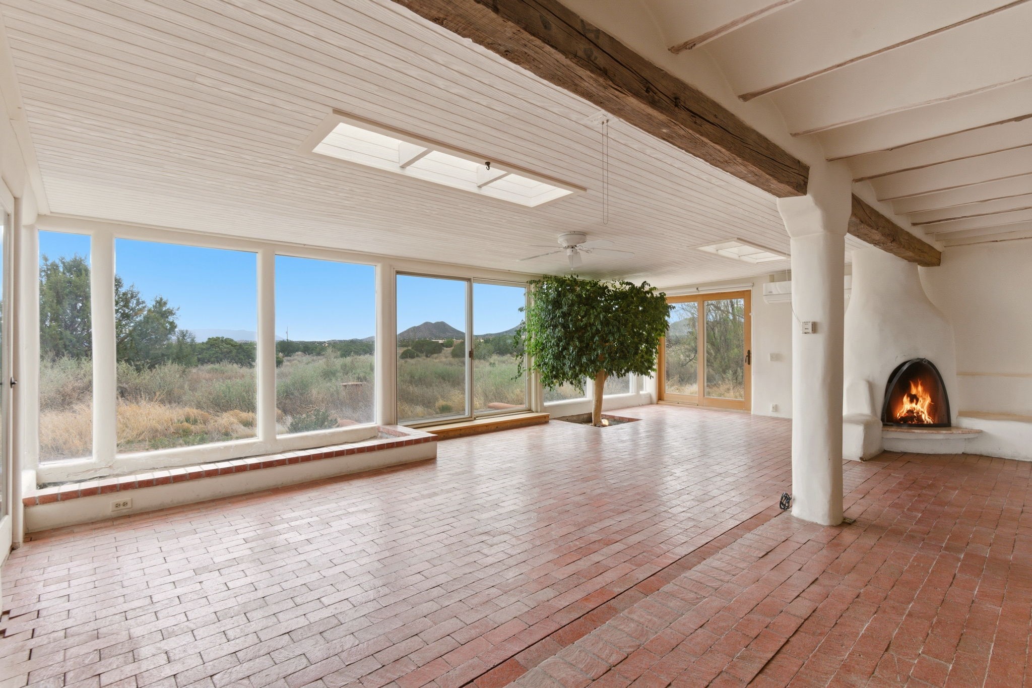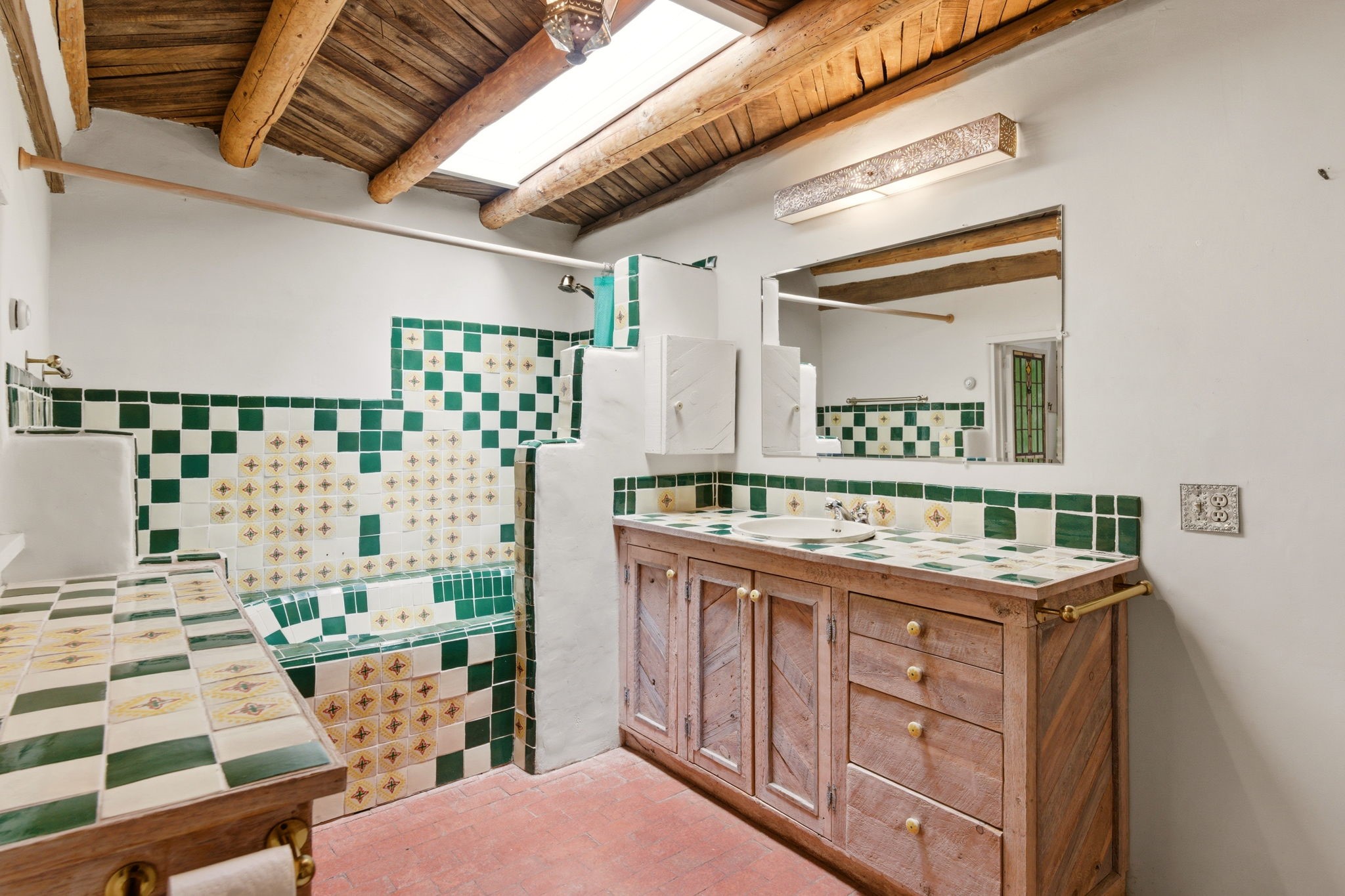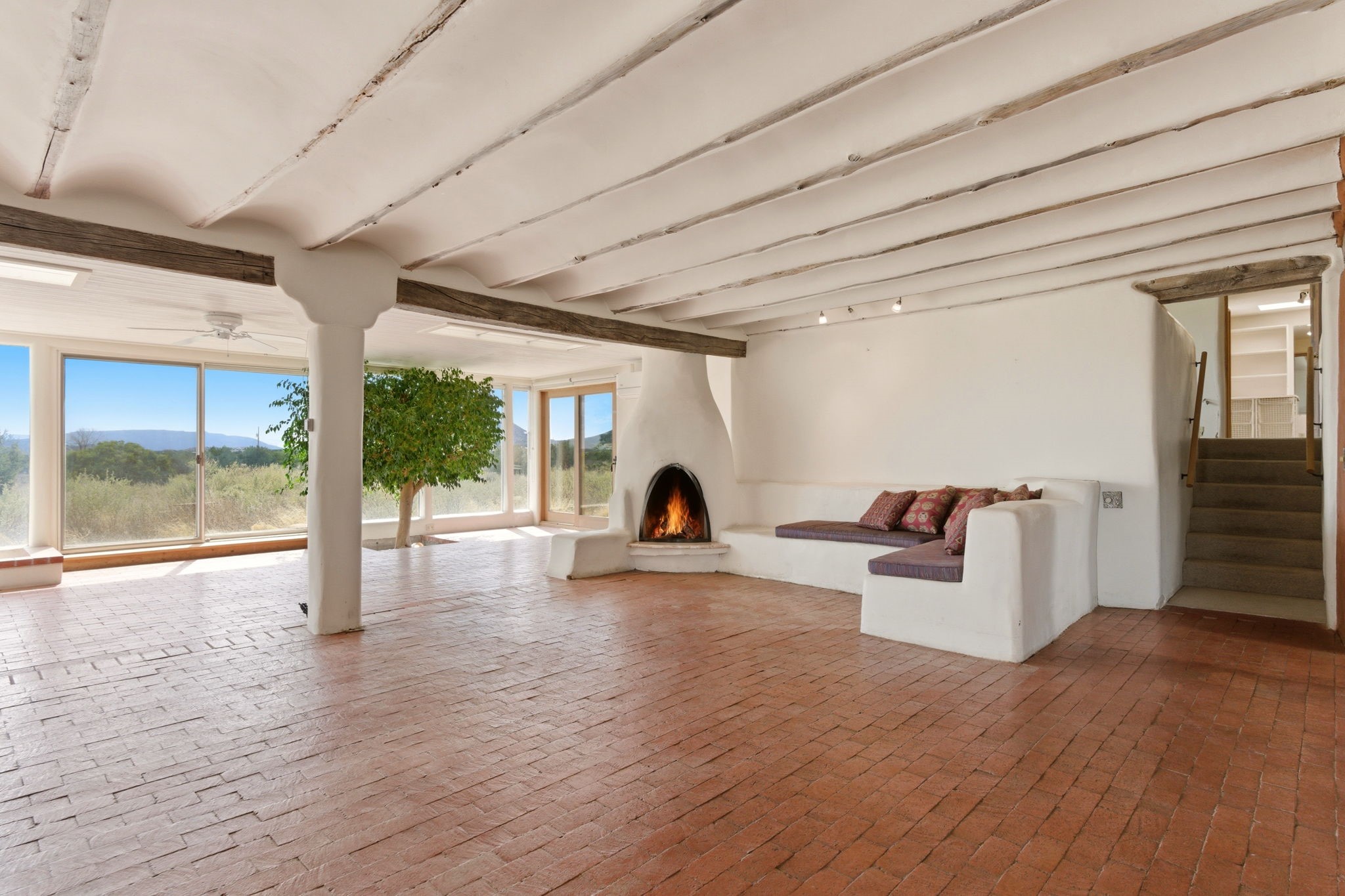 Set on 5 private acres, this unique Santa Fe property offers a main home, guest house, and an incredible garage/workshop--perfect for multi-generational living, rental potential, or a live/work lifestyle. Horses are welcome and there's no HOA giving you space, flexibility, and freedom while still being close to town amenities.The main house is a spacious split-level home filled with classic Santa Fe charm. The main level features an open kitchen, dining, and living area with warm brick floors, coved ceilings, and a wood-burning kiva fireplace. Wall-to-wall windows capture stunning western mountain views, while the kitchen's large island and open plan make entertaining easy. The upper level hosts the primary suite with a generous walk-in closet and a spa-like bath. On the lower level, you'll find a cozy sitting room or office with a gas kiva fireplace and the home's second bedroom. A colorful shared bathroom with large soaking tub adds personality and warmth.The guest house is a character-filled multi-level home with attached carport. The main level includes the kitchen, dining, and sitting areas along with the primary bedroom, featuring a walk-in closet and ensuite bath with large soaking tub. Throughout the home you'll find custom carved wood doors, diamond plaster walls, and a mix of brick and Saltillo tile flooring. Upstairs offers another bedroom, bathroom, and additional living space with expansive mountain views. The upper level flooring is ready for your personal finishing touches.The detached garage/workshop is a dream for hobbyists and professionals alike, offering three garage bays, an additional covered carport, abundant storage, and a dedicated workspace. Equipped with a 60-gallon central pneumatic compressor system and central vacuum system, this space is ready for projects of all kinds.With horse-friendly acreage, wide-open space, and endless possibilities, this special property captures the spirit of Santa Fe living. Being sold AS-IS.