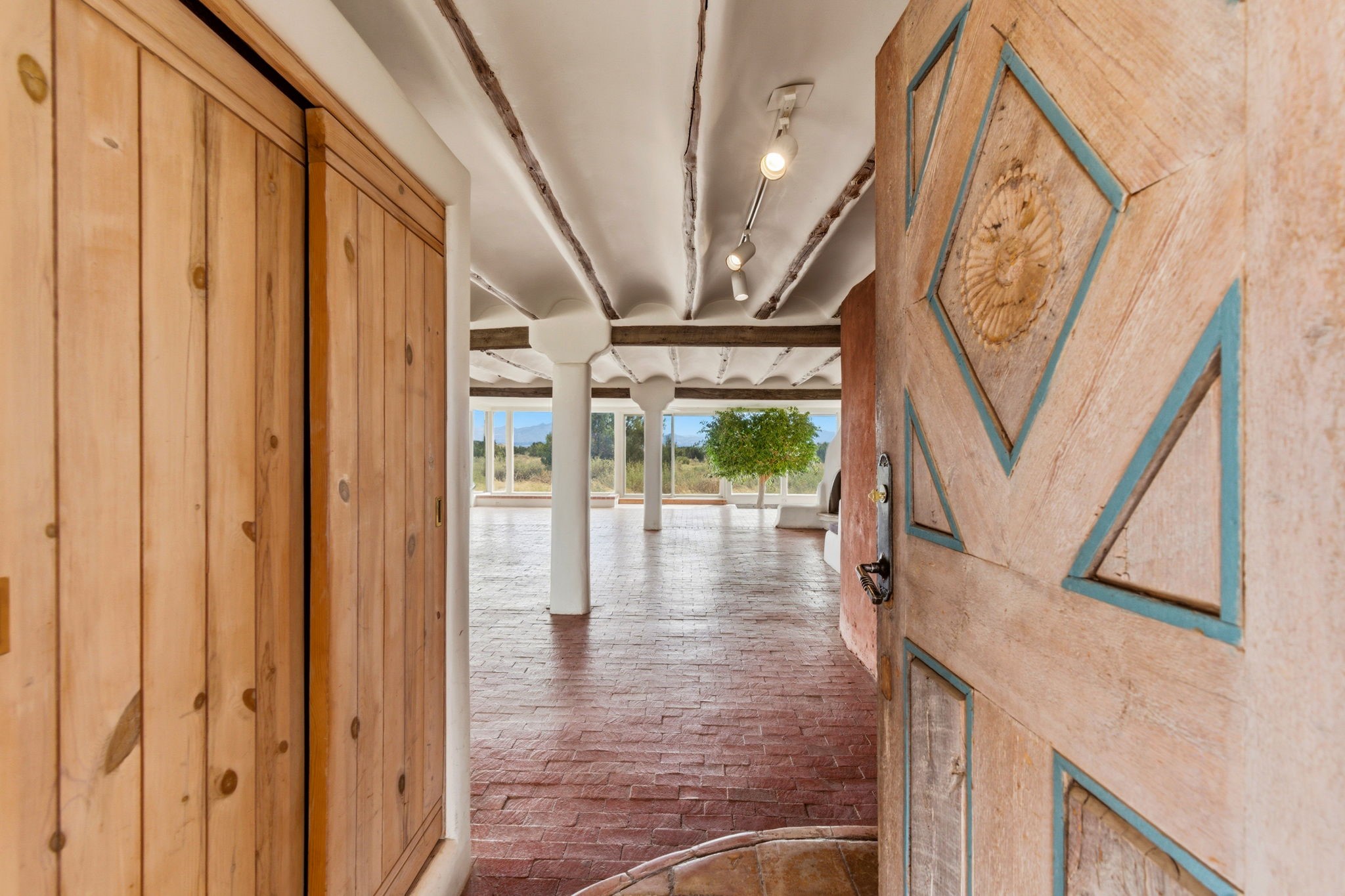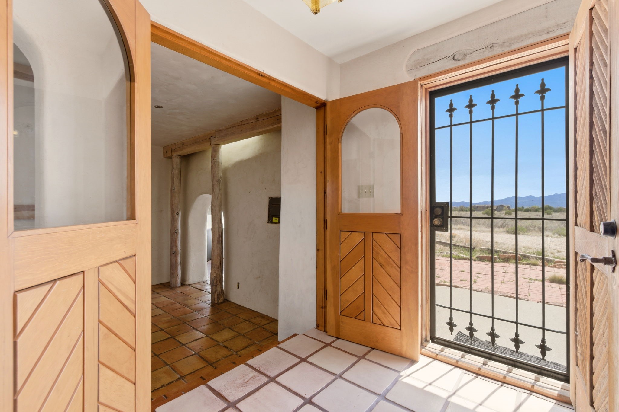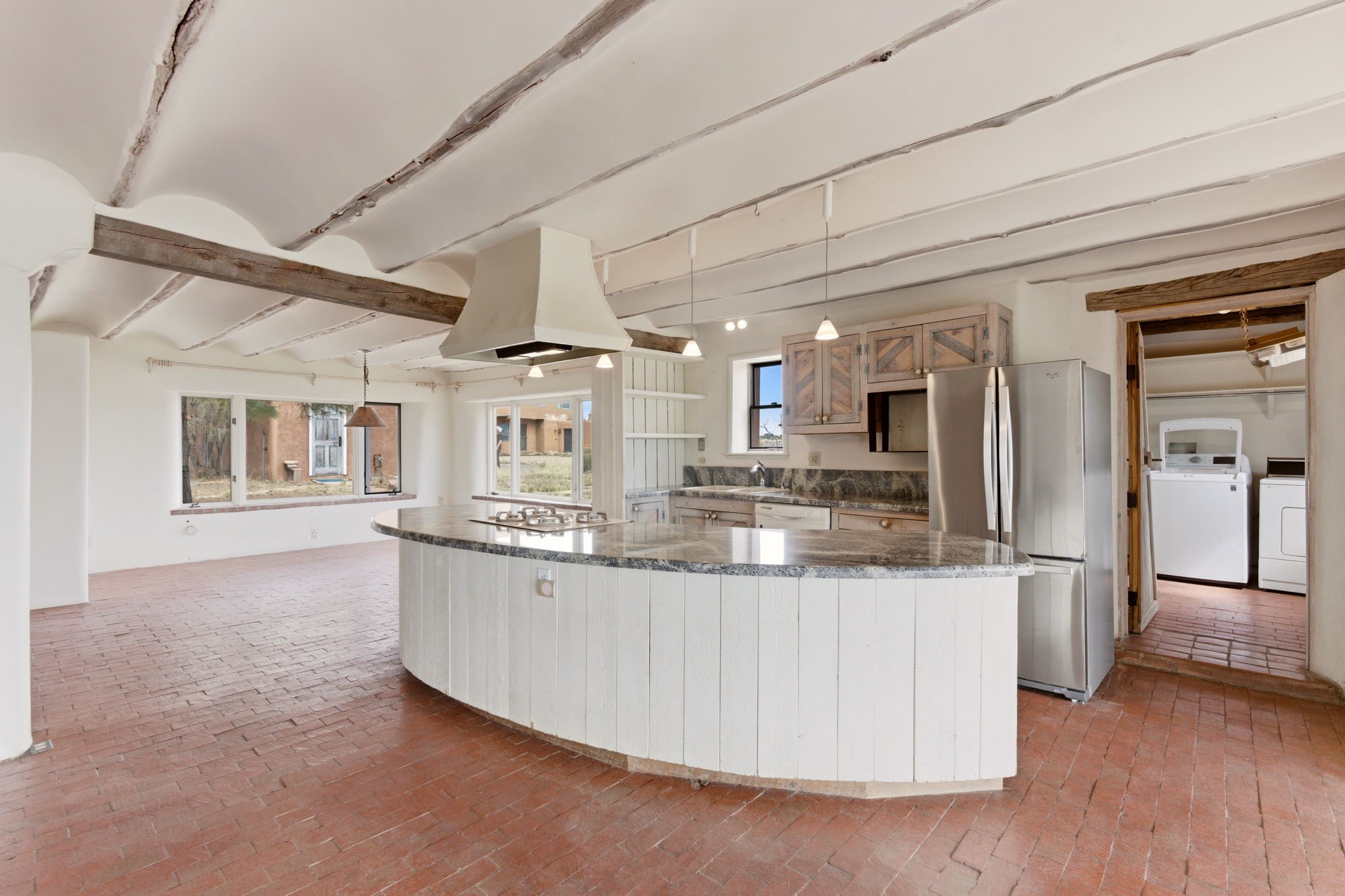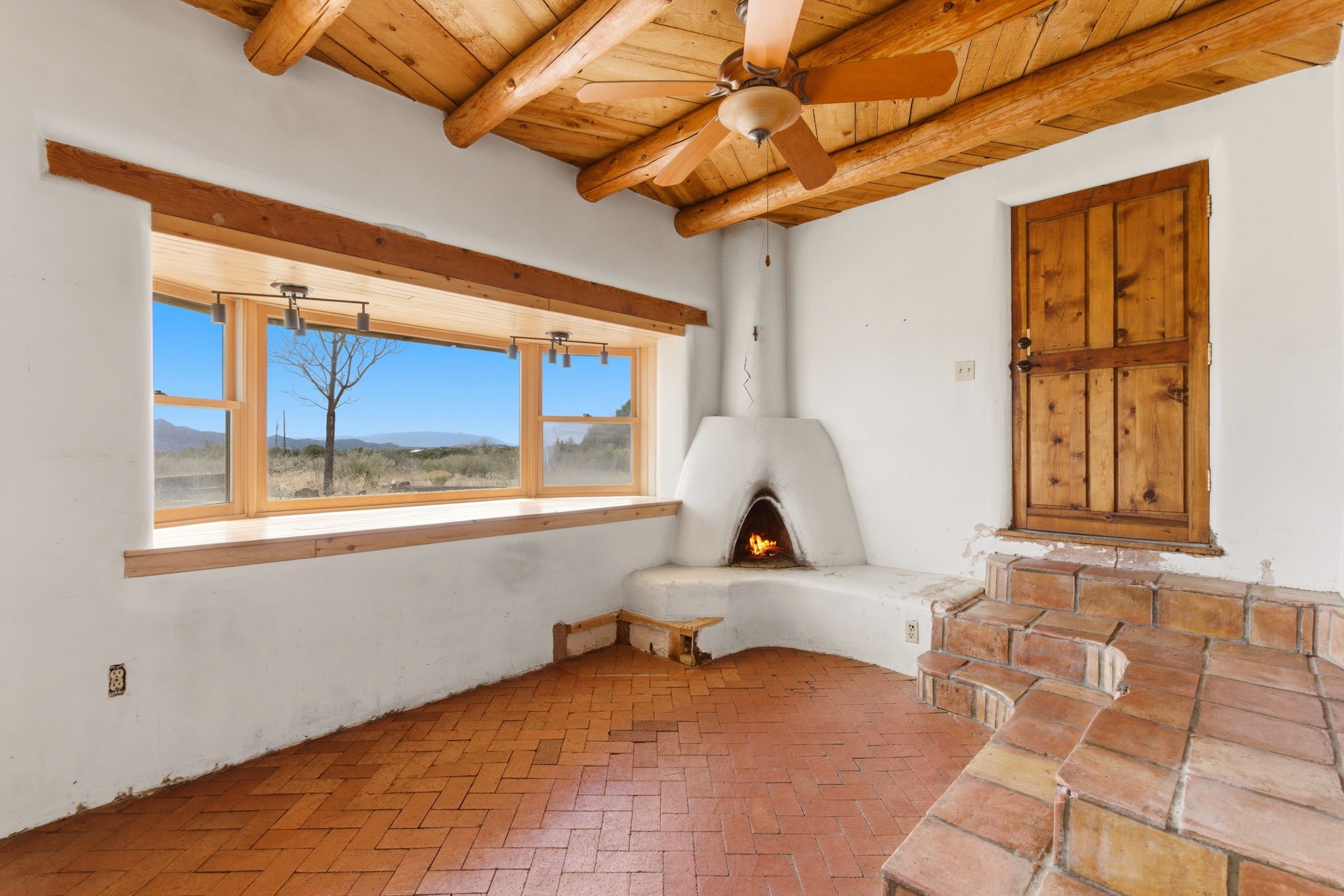 Set on 5 private acres, this unique Santa Fe property offers a main home, guest house, and an incredible garage/workshop--perfect for multi-generational living, rental potential, or a live/work lifestyle. Horses are welcome and there's no HOA giving you space, flexibility, and freedom while still being close to town amenities.The main house is a spacious split-level home filled with classic Santa Fe charm. The main level features an open kitchen, dining, and living area with warm brick floors, coved ceilings, and a wood-burning kiva fireplace. Wall-to-wall windows capture stunning western mountain views, while the kitchen's large island and open plan make entertaining easy. The upper level hosts the primary suite with a generous walk-in closet and a spa-like bath. On the lower level, you'll find a cozy sitting room or office with a gas kiva fireplace and the home's second bedroom. A colorful shared bathroom with large soaking tub adds personality and warmth.The guest house is a character-filled multi-level home with attached carport. The main level includes the kitchen, dining, and sitting areas along with the primary bedroom, featuring a walk-in closet and ensuite bath with large soaking tub. Throughout the home you'll find custom carved wood doors, diamond plaster walls, and a mix of brick and Saltillo tile flooring. Upstairs offers another bedroom, bathroom, and additional living space with expansive mountain views. The upper level flooring is ready for your personal finishing touches.The detached garage/workshop is a dream for hobbyists and professionals alike, offering three garage bays, an additional covered carport, abundant storage, and a dedicated workspace. Equipped with a 60-gallon central pneumatic compressor system and central vacuum system, this space is ready for projects of all kinds.With horse-friendly acreage, wide-open space, and endless possibilities, this special property captures the spirit of Santa Fe living. Being sold AS-IS.