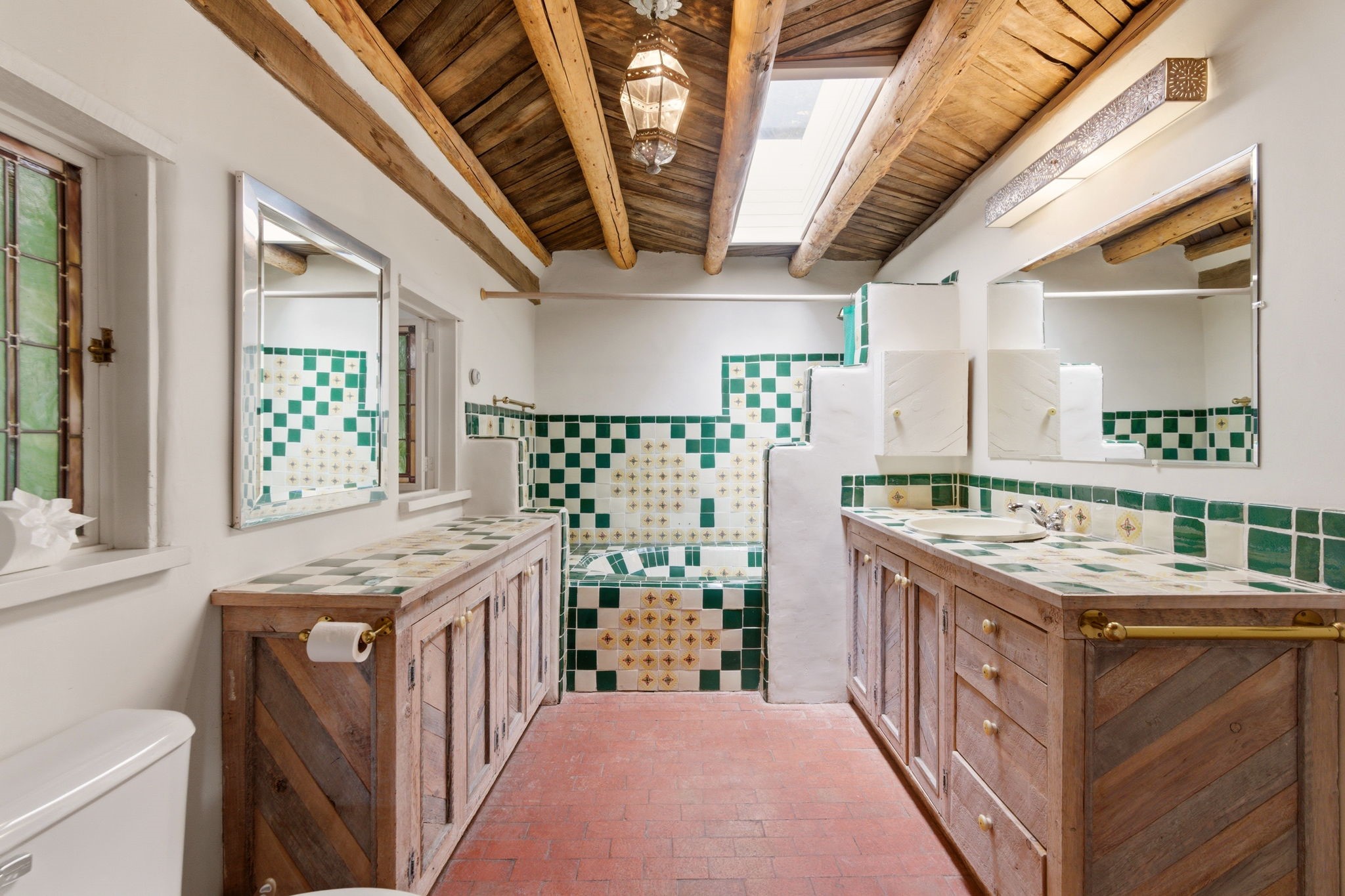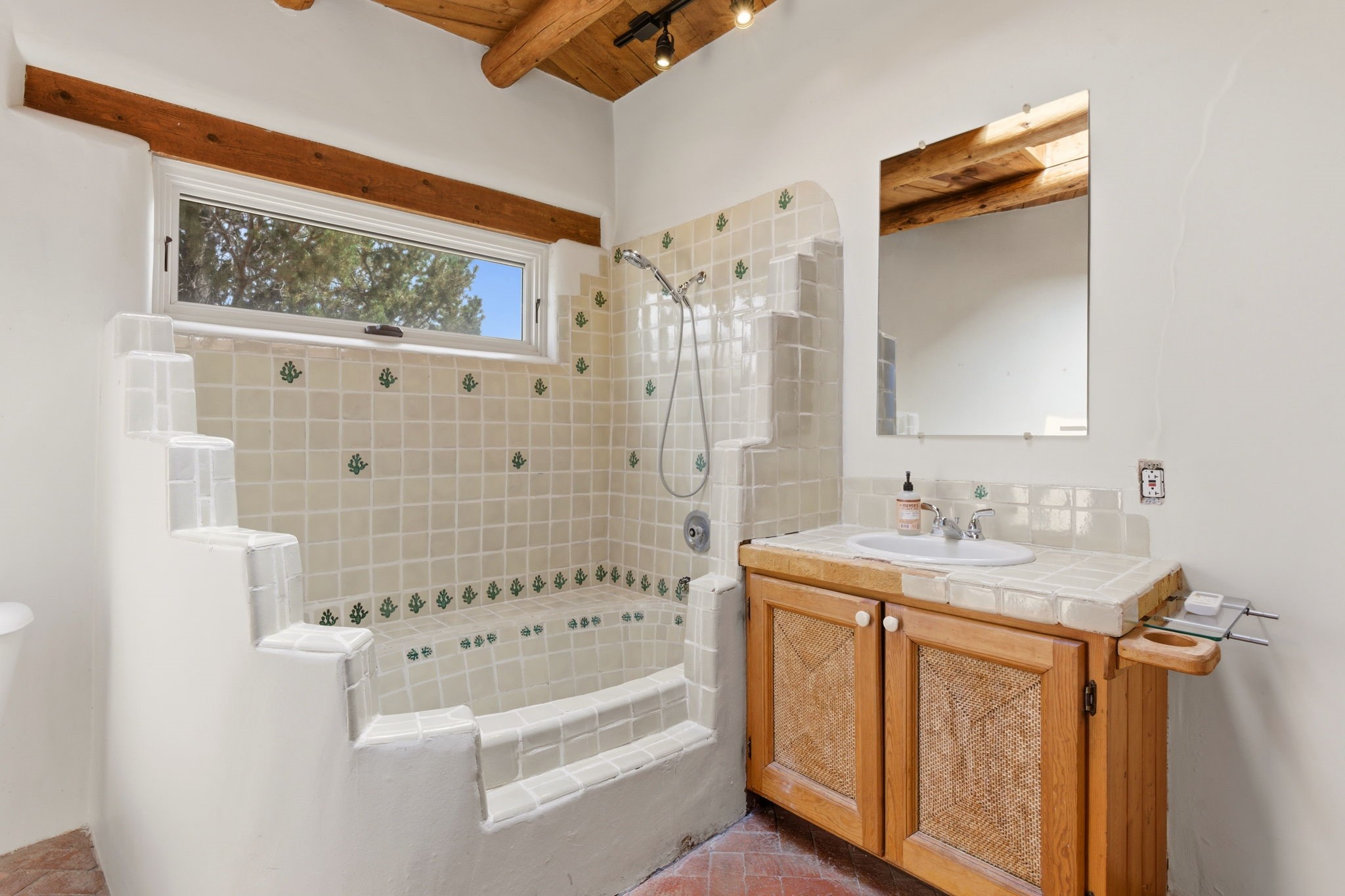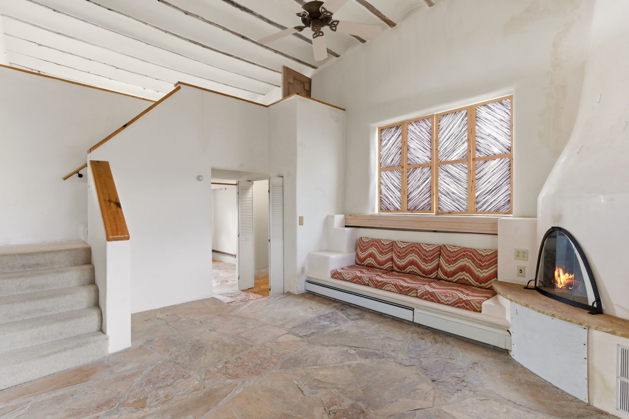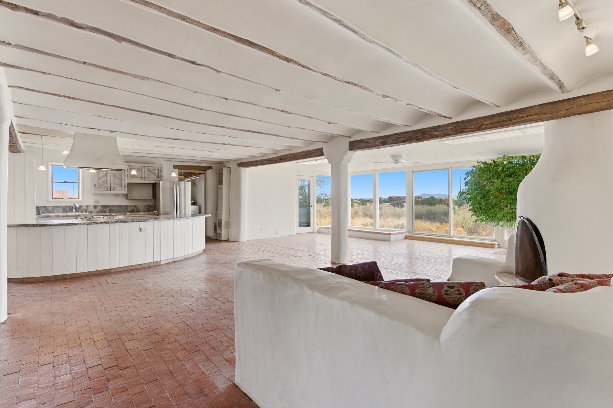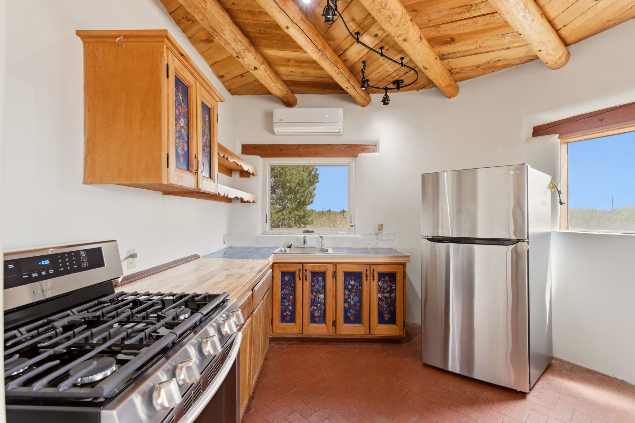 Set on 5 private acres, this unique Santa Fe property offers a main home, guest house, and an incredible garage/workshop--perfect for multi-generational living, rental potential, or a live/work lifestyle. Horses are welcome and there's no HOA giving you space, flexibility, and freedom while still being close to town amenities.The main house is a spacious split-level home filled with classic Santa Fe charm. The main level features an open kitchen, dining, and living area with warm brick floors, coved ceilings, and a wood-burning kiva fireplace. Wall-to-wall windows capture stunning western mountain views, while the kitchen's large island and open plan make entertaining easy. The upper level hosts the primary suite with a generous walk-in closet and a spa-like bath. On the lower level, you'll find a cozy sitting room or office with a gas kiva fireplace and the home's second bedroom. A colorful shared bathroom with large soaking tub adds personality and warmth.The guest house is a character-filled multi-level home with attached carport. The main level includes the kitchen, dining, and sitting areas along with the primary bedroom, featuring a walk-in closet and ensuite bath with large soaking tub. Throughout the home you'll find custom carved wood doors, diamond plaster walls, and a mix of brick and Saltillo tile flooring. Upstairs offers another bedroom, bathroom, and additional living space with expansive mountain views. The upper level flooring is ready for your personal finishing touches.The detached garage/workshop is a dream for hobbyists and professionals alike, offering three garage bays, an additional covered carport, abundant storage, and a dedicated workspace. Equipped with a 60-gallon central pneumatic compressor system and central vacuum system, this space is ready for projects of all kinds.With horse-friendly acreage, wide-open space, and endless possibilities, this special property captures the spirit of Santa Fe living. Being sold AS-IS.