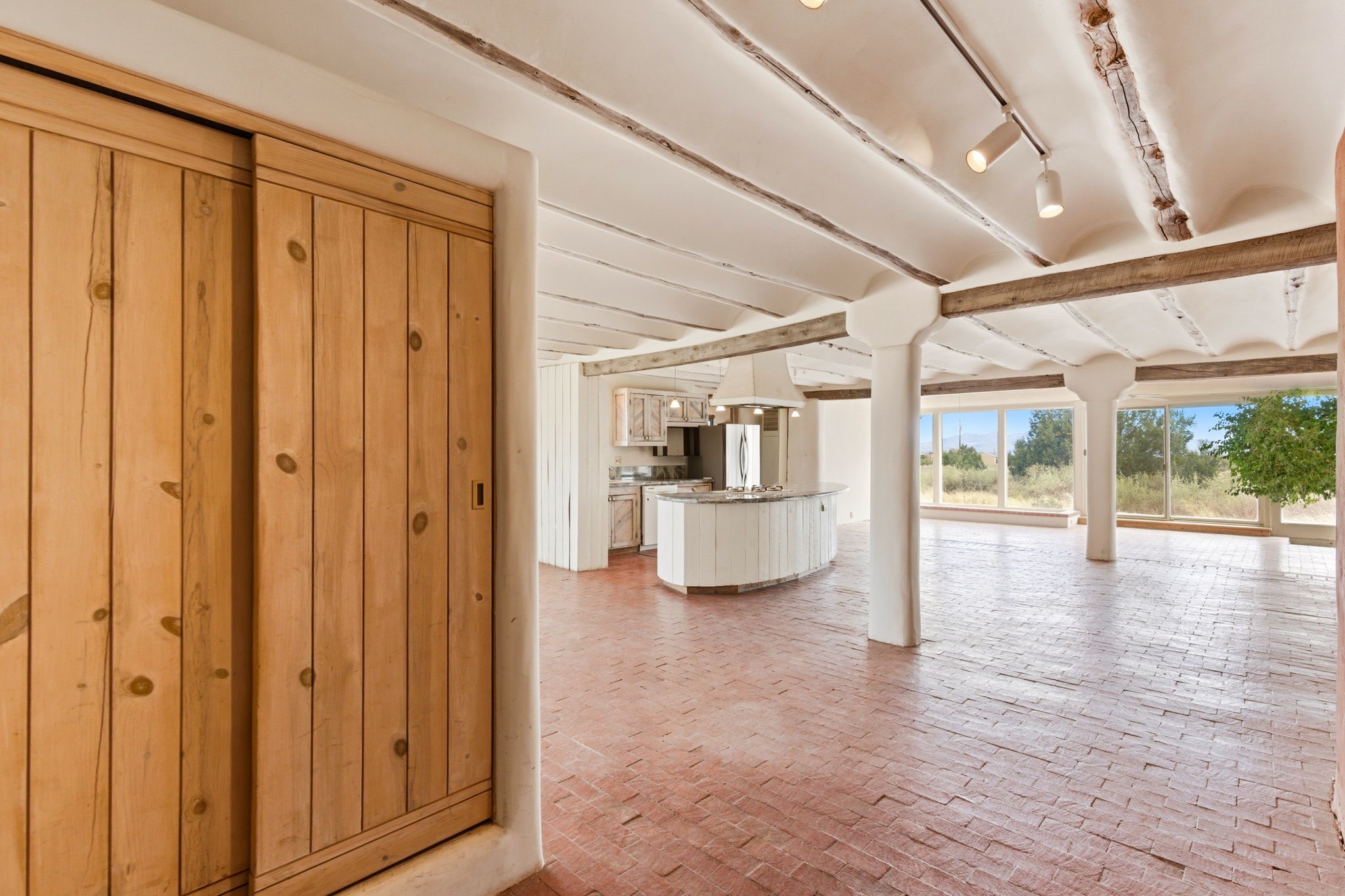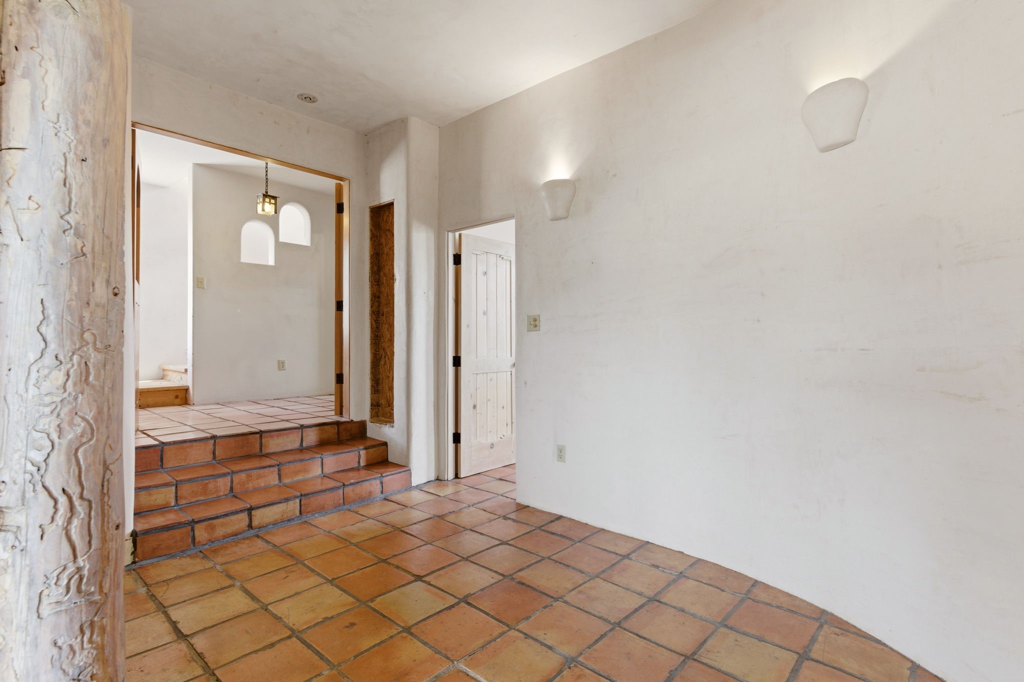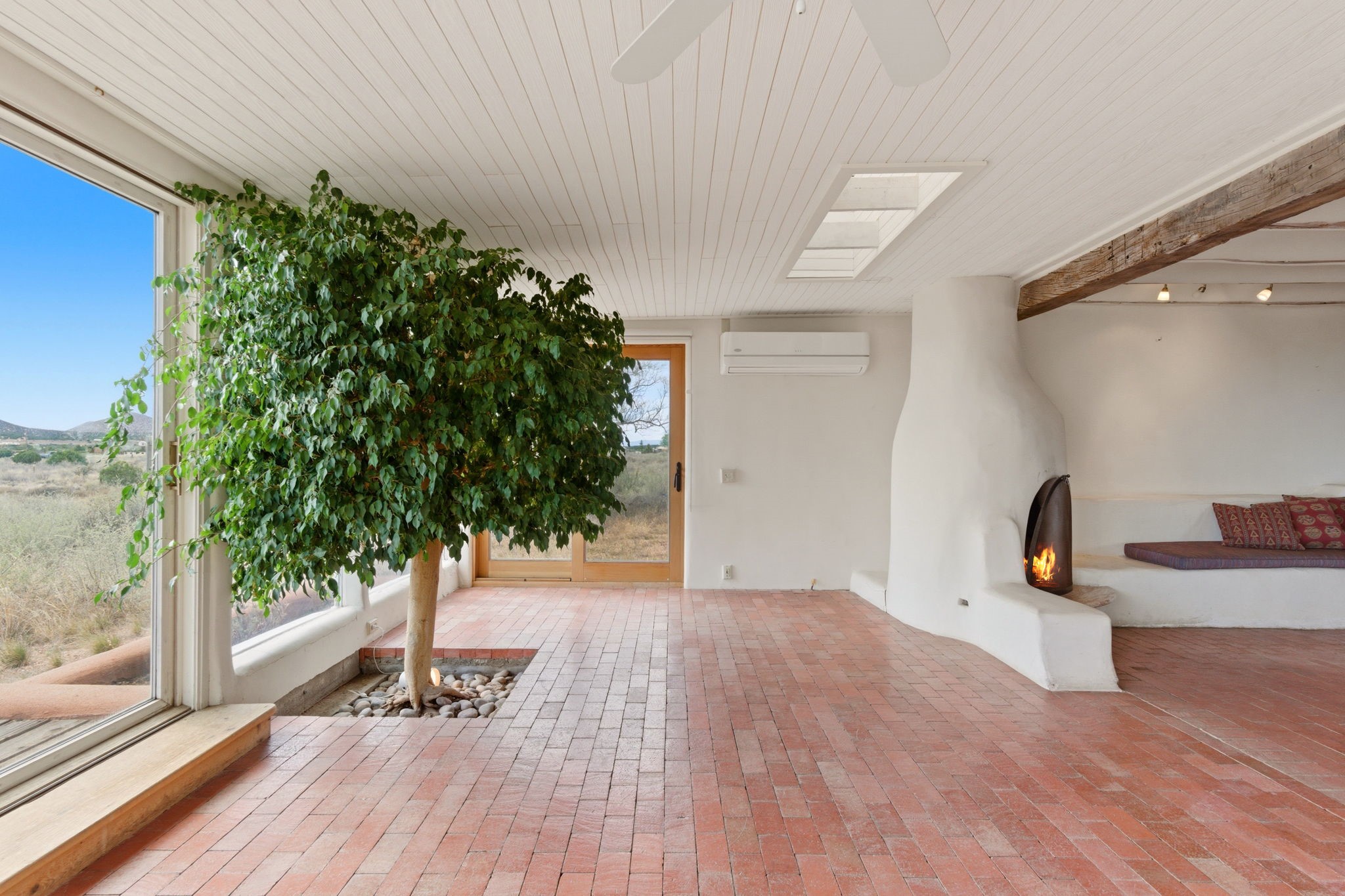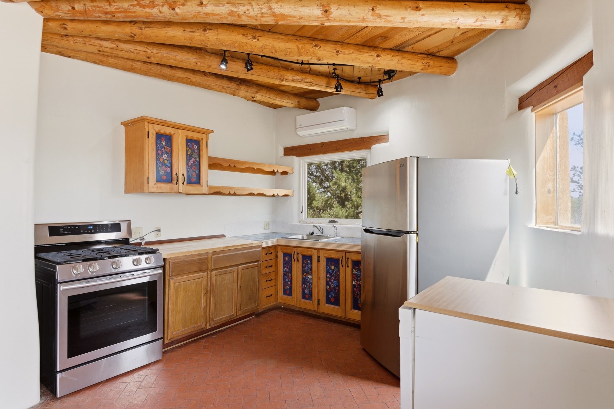 Set on 5 private acres, this unique Santa Fe property offers a main home, guest house, and an incredible garage/workshop--perfect for multi-generational living, rental potential, or a live/work lifestyle. Horses are welcome and there's no HOA giving you space, flexibility, and freedom while still being close to town amenities.The main house is a spacious split-level home filled with classic Santa Fe charm. The main level features an open kitchen, dining, and living area with warm brick floors, coved ceilings, and a wood-burning kiva fireplace. Wall-to-wall windows capture stunning western mountain views, while the kitchen's large island and open plan make entertaining easy. The upper level hosts the primary suite with a generous walk-in closet and a spa-like bath. On the lower level, you'll find a cozy sitting room or office with a gas kiva fireplace and the home's second bedroom. A colorful shared bathroom with large soaking tub adds personality and warmth.The guest house is a character-filled multi-level home with attached carport. The main level includes the kitchen, dining, and sitting areas along with the primary bedroom, featuring a walk-in closet and ensuite bath with large soaking tub. Throughout the home you'll find custom carved wood doors, diamond plaster walls, and a mix of brick and Saltillo tile flooring. Upstairs offers another bedroom, bathroom, and additional living space with expansive mountain views. The upper level flooring is ready for your personal finishing touches.The detached garage/workshop is a dream for hobbyists and professionals alike, offering three garage bays, an additional covered carport, abundant storage, and a dedicated workspace. Equipped with a 60-gallon central pneumatic compressor system and central vacuum system, this space is ready for projects of all kinds.With horse-friendly acreage, wide-open space, and endless possibilities, this special property captures the spirit of Santa Fe living. Being sold AS-IS.