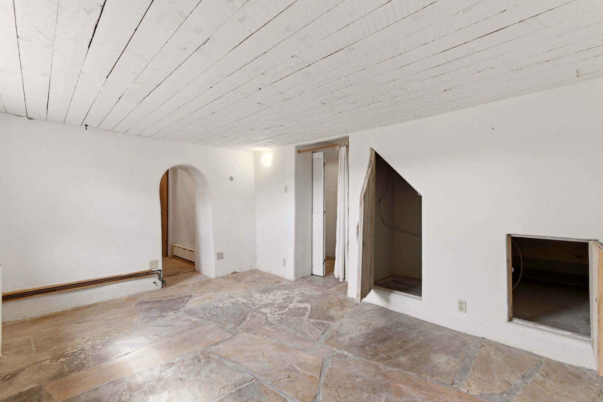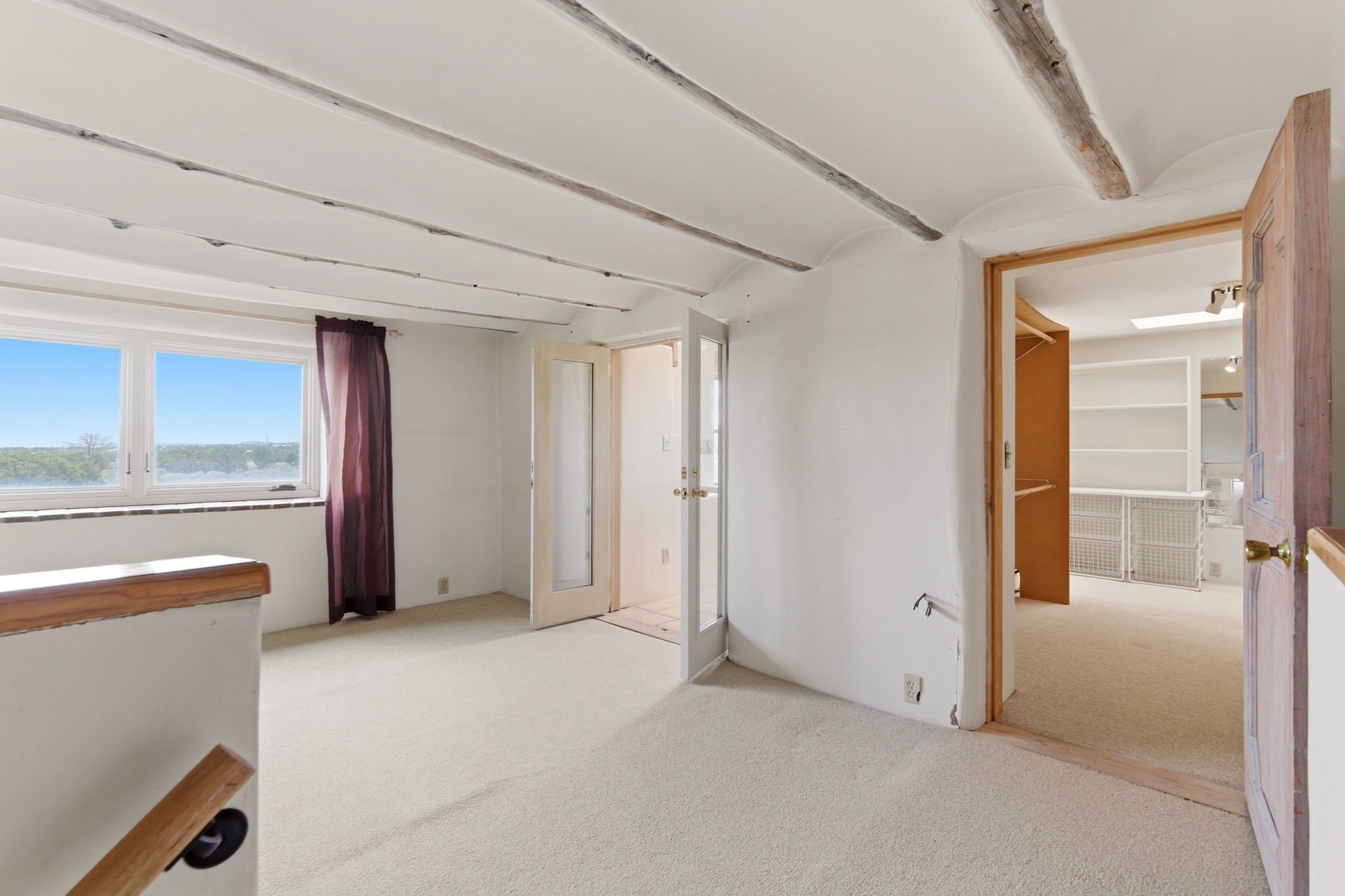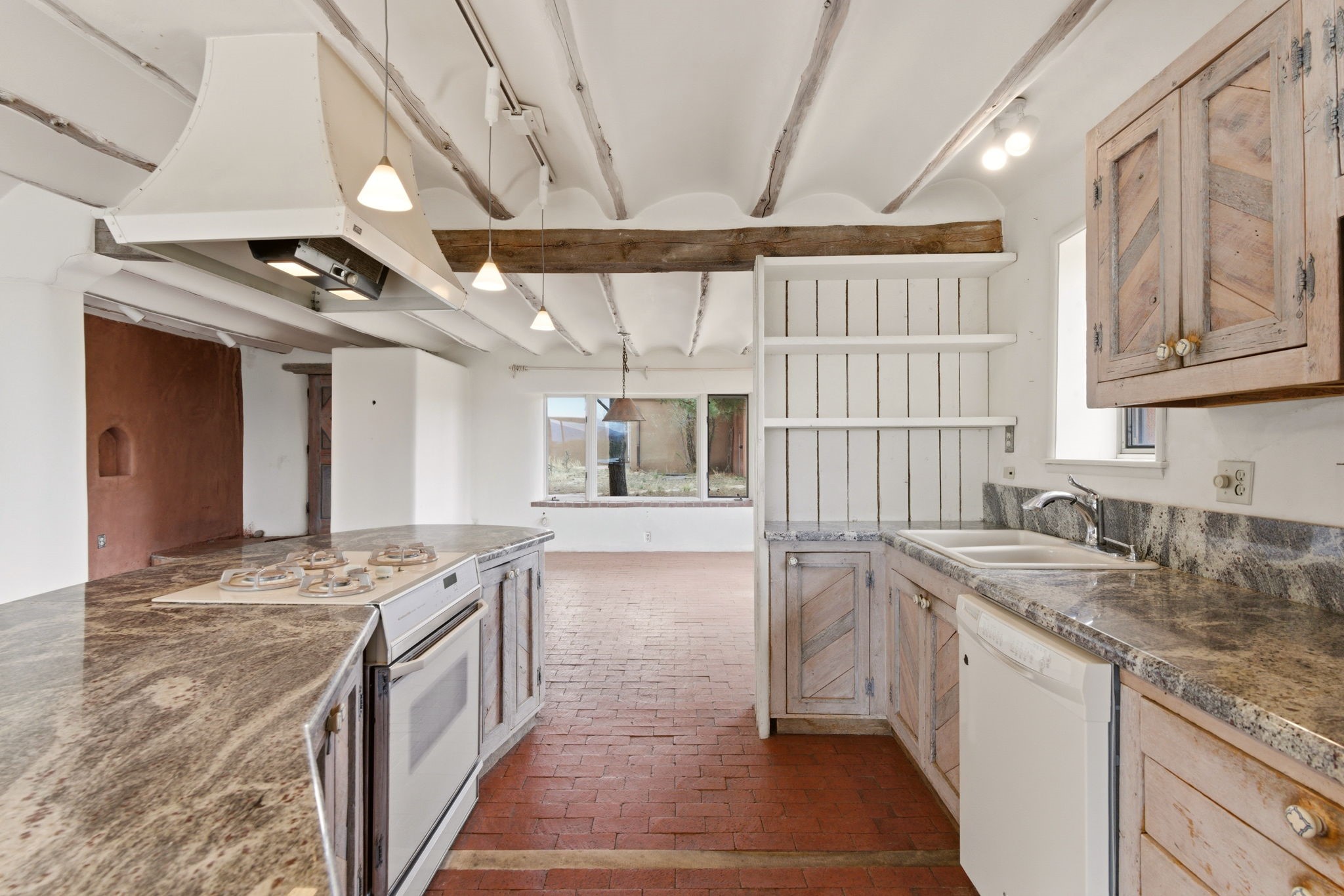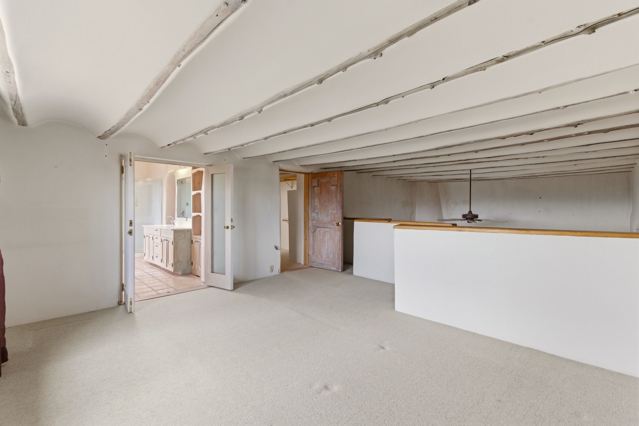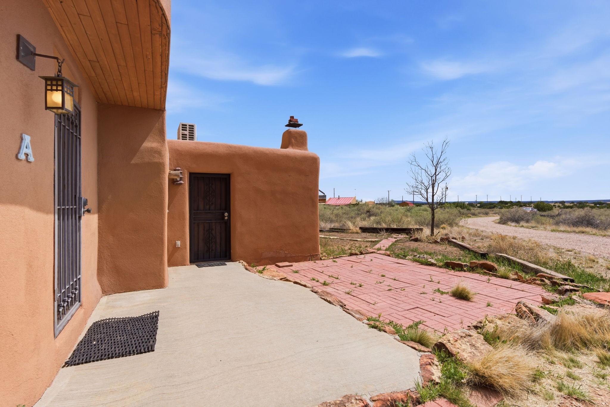 Set on 5 private acres, this unique Santa Fe property offers a main home, guest house, and an incredible garage/workshop--perfect for multi-generational living, rental potential, or a live/work lifestyle. Horses are welcome and there's no HOA giving you space, flexibility, and freedom while still being close to town amenities.The main house is a spacious split-level home filled with classic Santa Fe charm. The main level features an open kitchen, dining, and living area with warm brick floors, coved ceilings, and a wood-burning kiva fireplace. Wall-to-wall windows capture stunning western mountain views, while the kitchen's large island and open plan make entertaining easy. The upper level hosts the primary suite with a generous walk-in closet and a spa-like bath. On the lower level, you'll find a cozy sitting room or office with a gas kiva fireplace and the home's second bedroom. A colorful shared bathroom with large soaking tub adds personality and warmth.The guest house is a character-filled multi-level home with attached carport. The main level includes the kitchen, dining, and sitting areas along with the primary bedroom, featuring a walk-in closet and ensuite bath with large soaking tub. Throughout the home you'll find custom carved wood doors, diamond plaster walls, and a mix of brick and Saltillo tile flooring. Upstairs offers another bedroom, bathroom, and additional living space with expansive mountain views. The upper level flooring is ready for your personal finishing touches.The detached garage/workshop is a dream for hobbyists and professionals alike, offering three garage bays, an additional covered carport, abundant storage, and a dedicated workspace. Equipped with a 60-gallon central pneumatic compressor system and central vacuum system, this space is ready for projects of all kinds.With horse-friendly acreage, wide-open space, and endless possibilities, this special property captures the spirit of Santa Fe living. Being sold AS-IS.