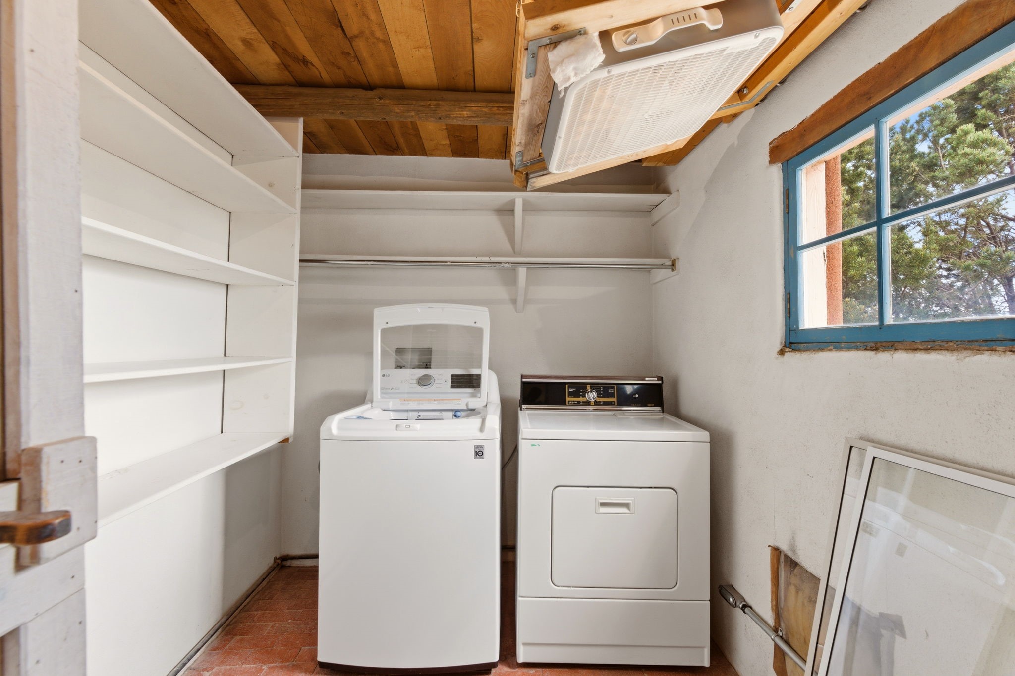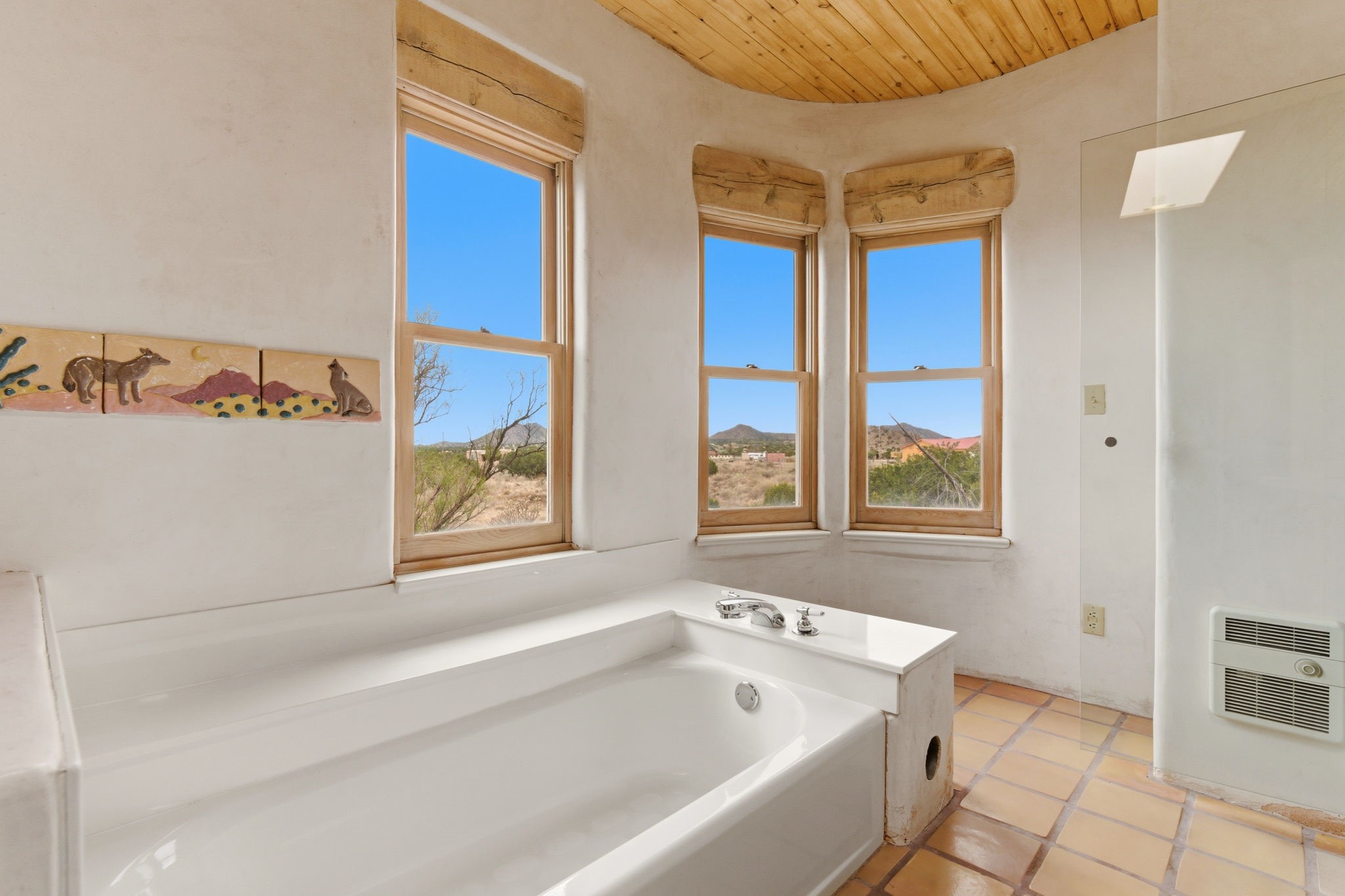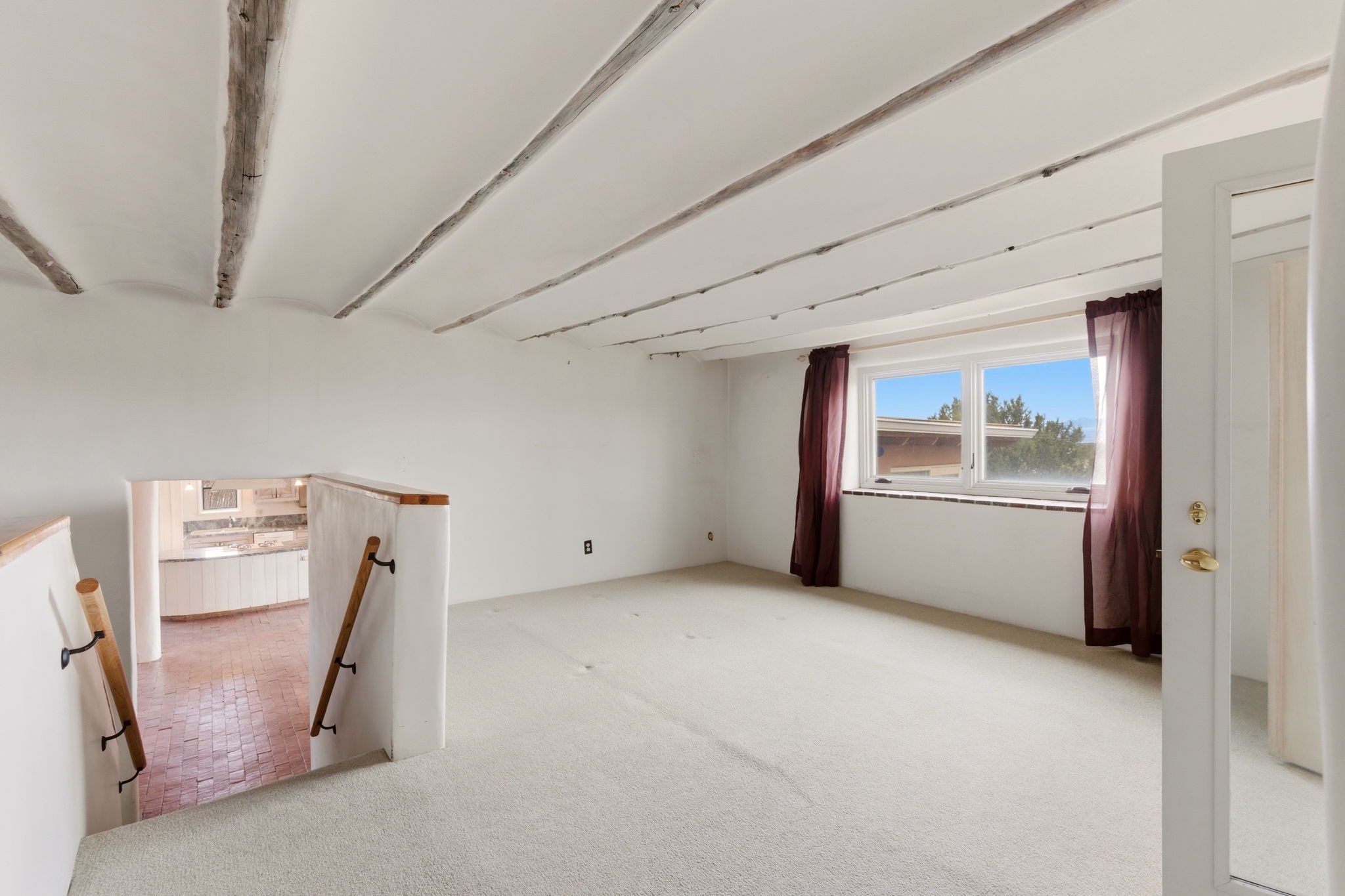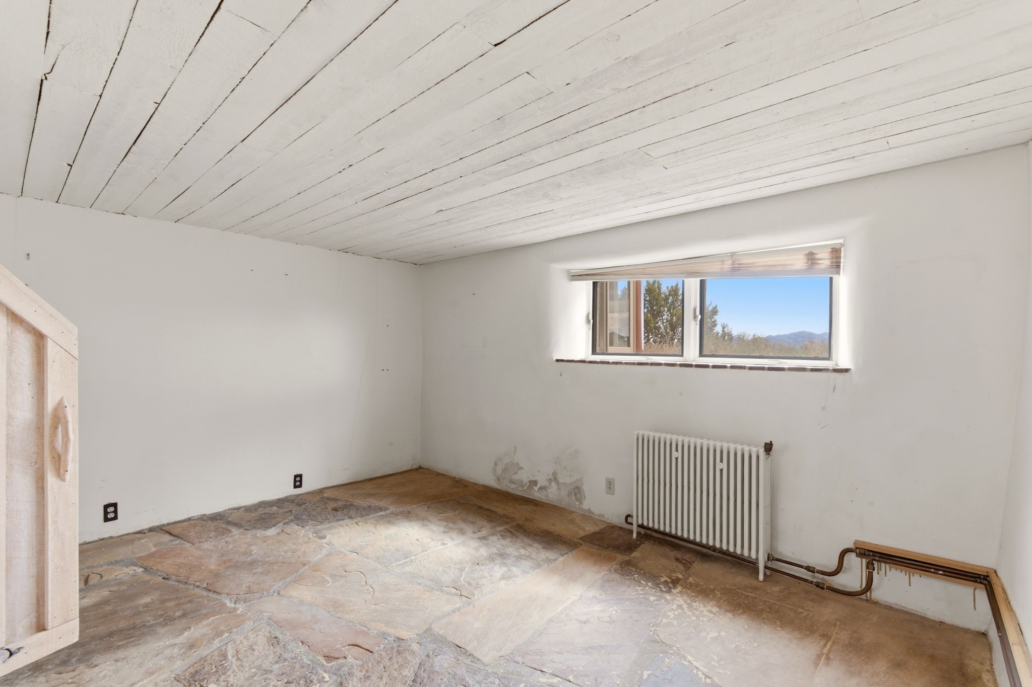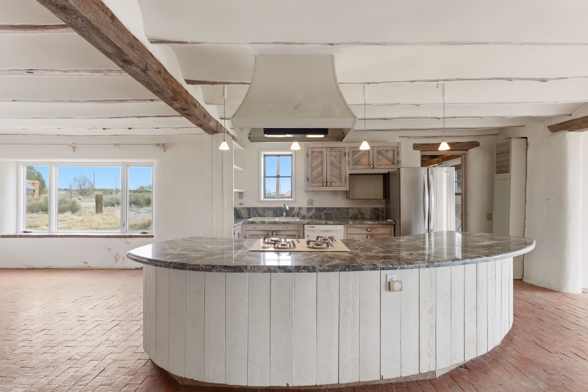 Set on 5 private acres, this unique Santa Fe property offers a main home, guest house, and an incredible garage/workshop--perfect for multi-generational living, rental potential, or a live/work lifestyle. Horses are welcome and there's no HOA giving you space, flexibility, and freedom while still being close to town amenities.The main house is a spacious split-level home filled with classic Santa Fe charm. The main level features an open kitchen, dining, and living area with warm brick floors, coved ceilings, and a wood-burning kiva fireplace. Wall-to-wall windows capture stunning western mountain views, while the kitchen's large island and open plan make entertaining easy. The upper level hosts the primary suite with a generous walk-in closet and a spa-like bath. On the lower level, you'll find a cozy sitting room or office with a gas kiva fireplace and the home's second bedroom. A colorful shared bathroom with large soaking tub adds personality and warmth.The guest house is a character-filled multi-level home with attached carport. The main level includes the kitchen, dining, and sitting areas along with the primary bedroom, featuring a walk-in closet and ensuite bath with large soaking tub. Throughout the home you'll find custom carved wood doors, diamond plaster walls, and a mix of brick and Saltillo tile flooring. Upstairs offers another bedroom, bathroom, and additional living space with expansive mountain views. The upper level flooring is ready for your personal finishing touches.The detached garage/workshop is a dream for hobbyists and professionals alike, offering three garage bays, an additional covered carport, abundant storage, and a dedicated workspace. Equipped with a 60-gallon central pneumatic compressor system and central vacuum system, this space is ready for projects of all kinds.With horse-friendly acreage, wide-open space, and endless possibilities, this special property captures the spirit of Santa Fe living. Being sold AS-IS.