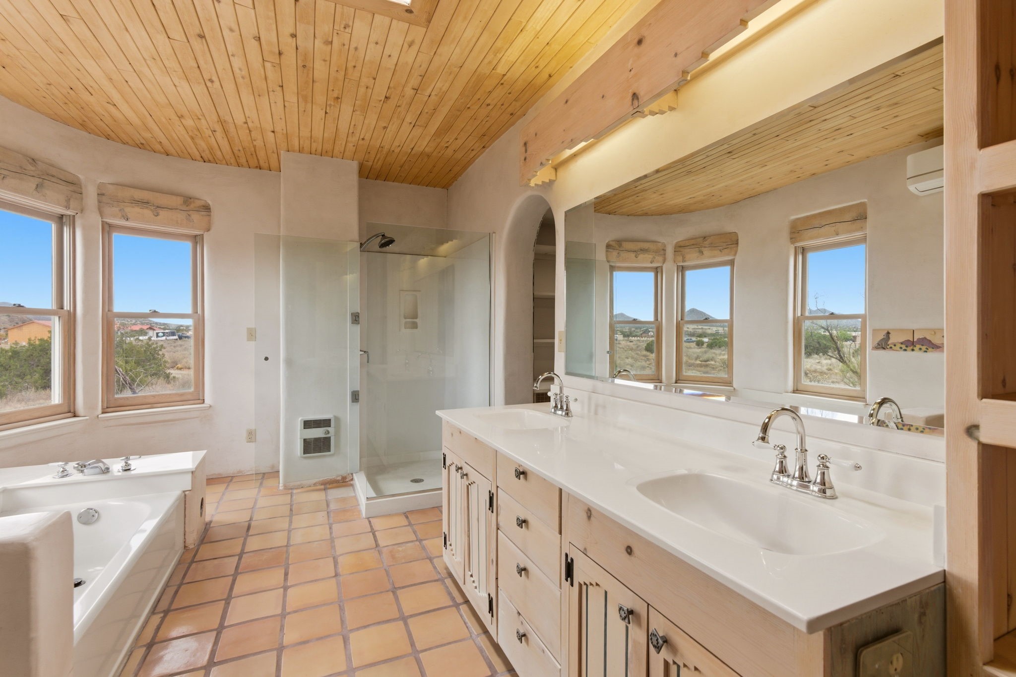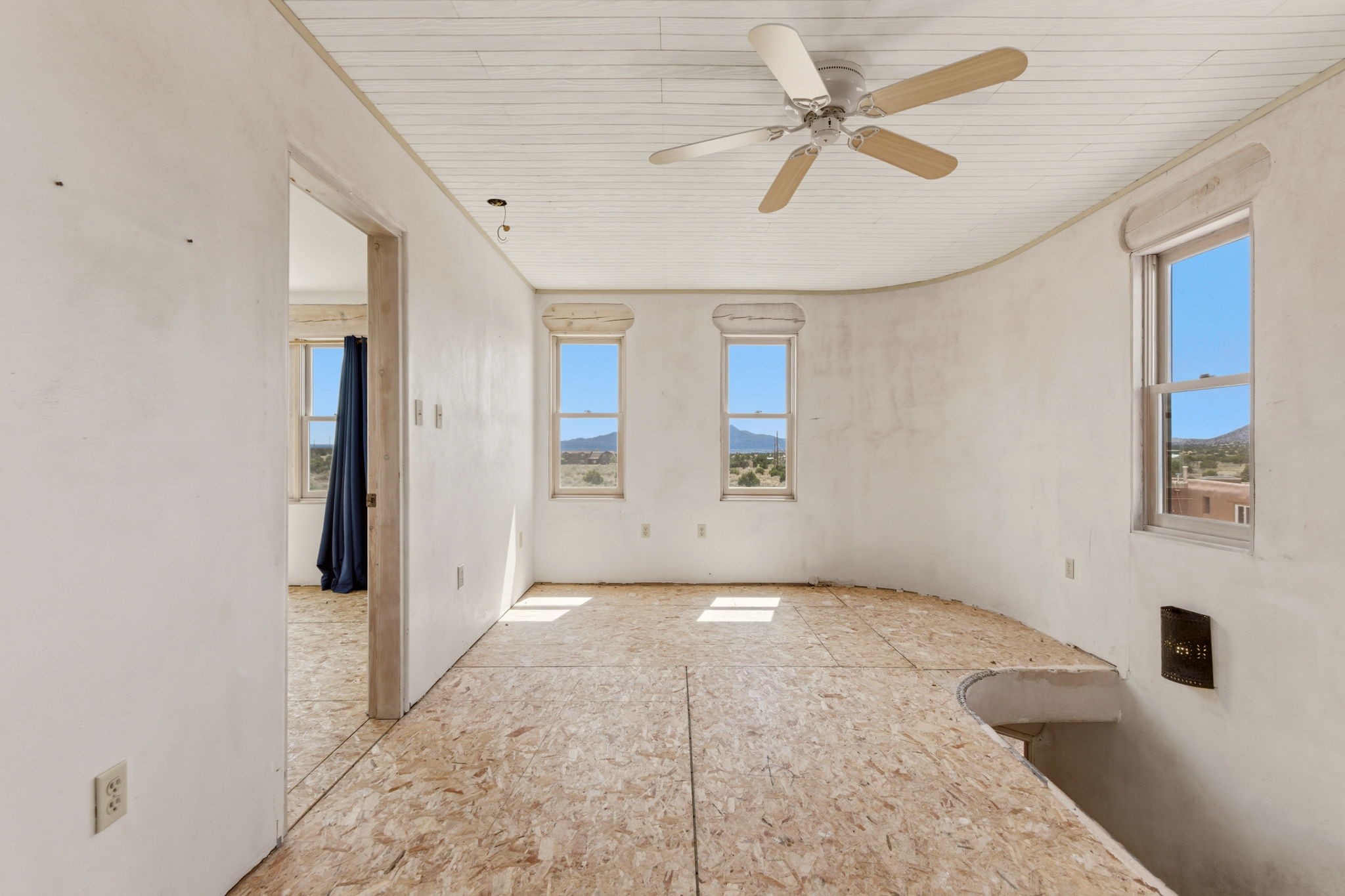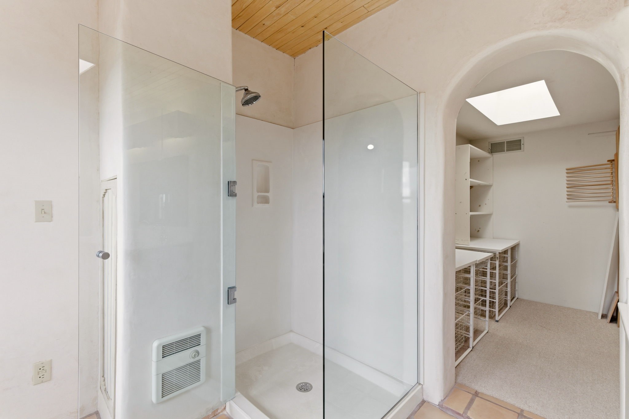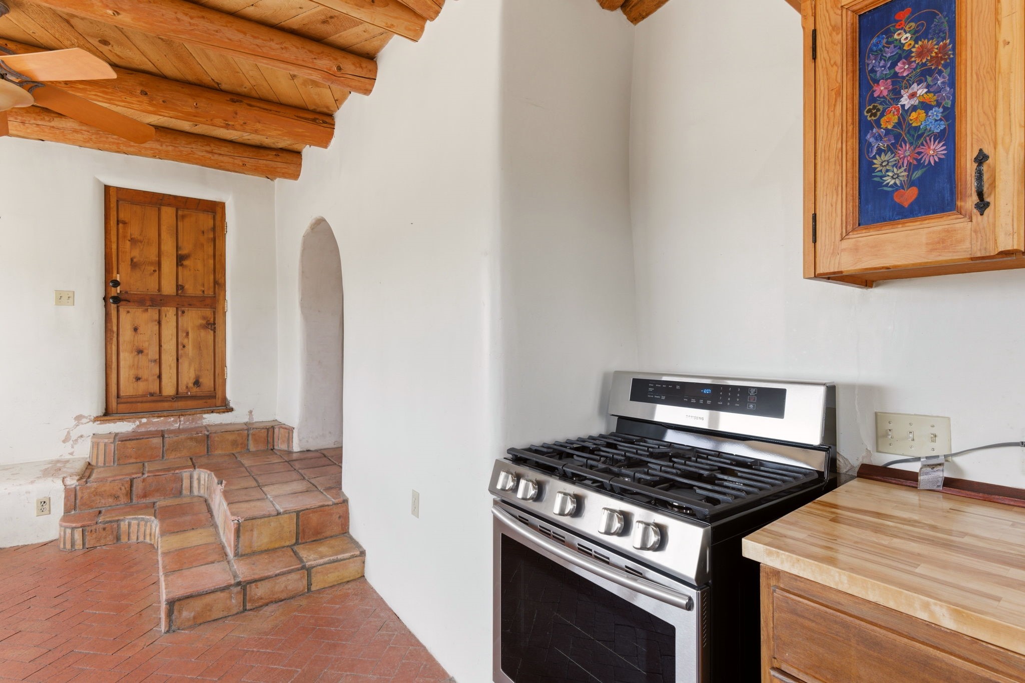 Set on 5 private acres, this unique Santa Fe property offers a main home, guest house, and an incredible garage/workshop--perfect for multi-generational living, rental potential, or a live/work lifestyle. Horses are welcome and there's no HOA giving you space, flexibility, and freedom while still being close to town amenities.The main house is a spacious split-level home filled with classic Santa Fe charm. The main level features an open kitchen, dining, and living area with warm brick floors, coved ceilings, and a wood-burning kiva fireplace. Wall-to-wall windows capture stunning western mountain views, while the kitchen's large island and open plan make entertaining easy. The upper level hosts the primary suite with a generous walk-in closet and a spa-like bath. On the lower level, you'll find a cozy sitting room or office with a gas kiva fireplace and the home's second bedroom. A colorful shared bathroom with large soaking tub adds personality and warmth.The guest house is a character-filled multi-level home with attached carport. The main level includes the kitchen, dining, and sitting areas along with the primary bedroom, featuring a walk-in closet and ensuite bath with large soaking tub. Throughout the home you'll find custom carved wood doors, diamond plaster walls, and a mix of brick and Saltillo tile flooring. Upstairs offers another bedroom, bathroom, and additional living space with expansive mountain views. The upper level flooring is ready for your personal finishing touches.The detached garage/workshop is a dream for hobbyists and professionals alike, offering three garage bays, an additional covered carport, abundant storage, and a dedicated workspace. Equipped with a 60-gallon central pneumatic compressor system and central vacuum system, this space is ready for projects of all kinds.With horse-friendly acreage, wide-open space, and endless possibilities, this special property captures the spirit of Santa Fe living. Being sold AS-IS.