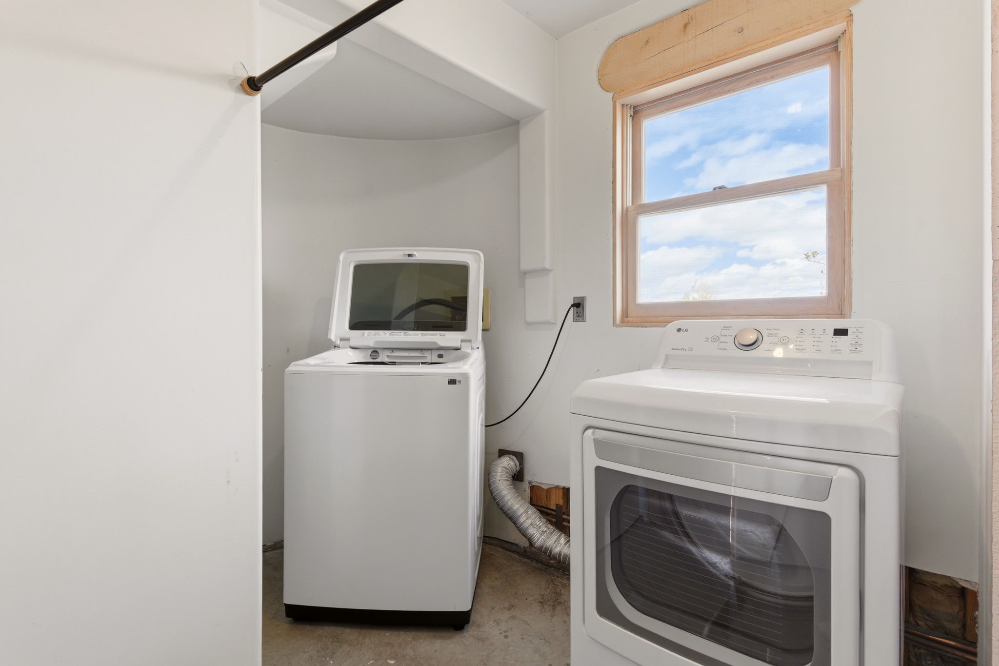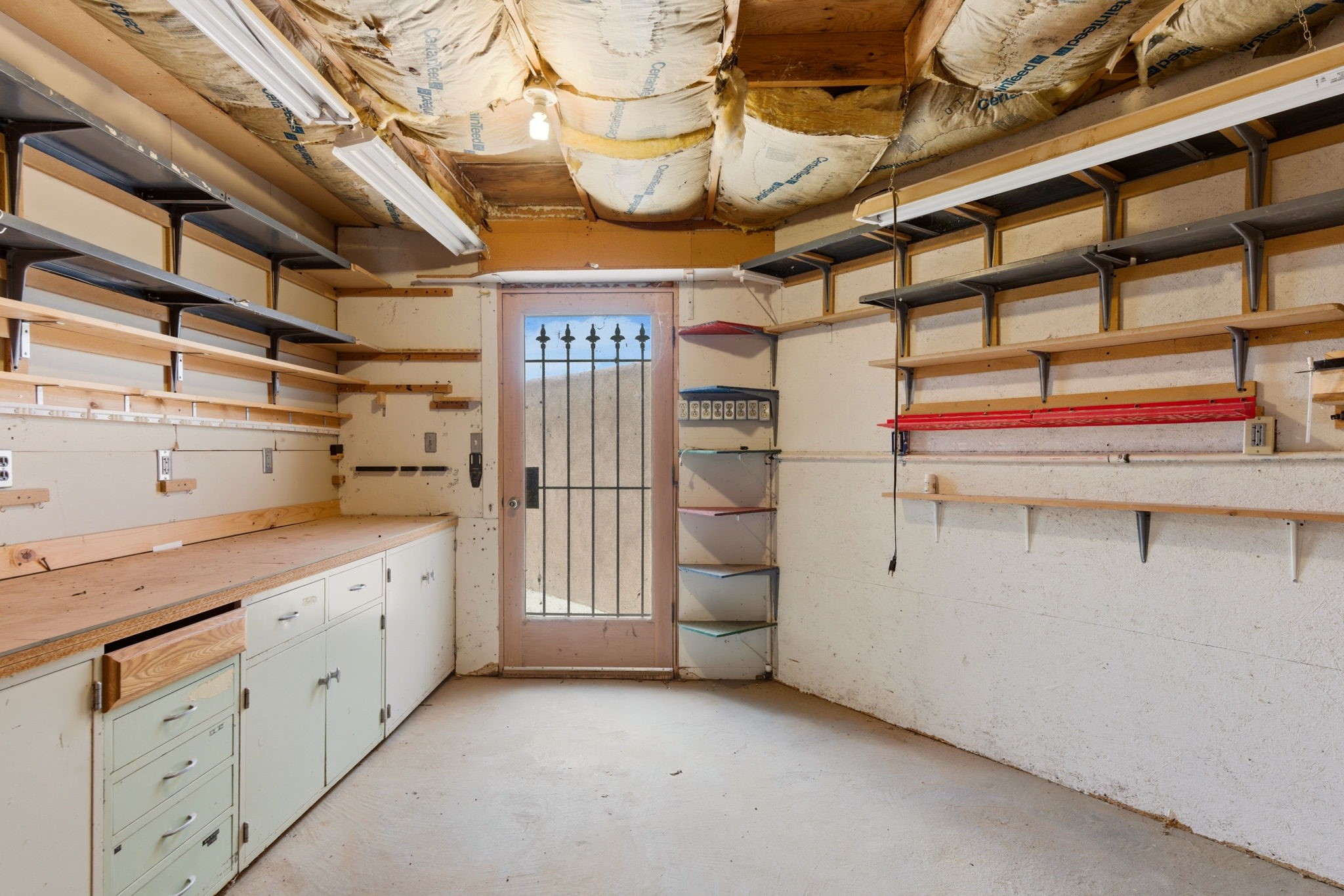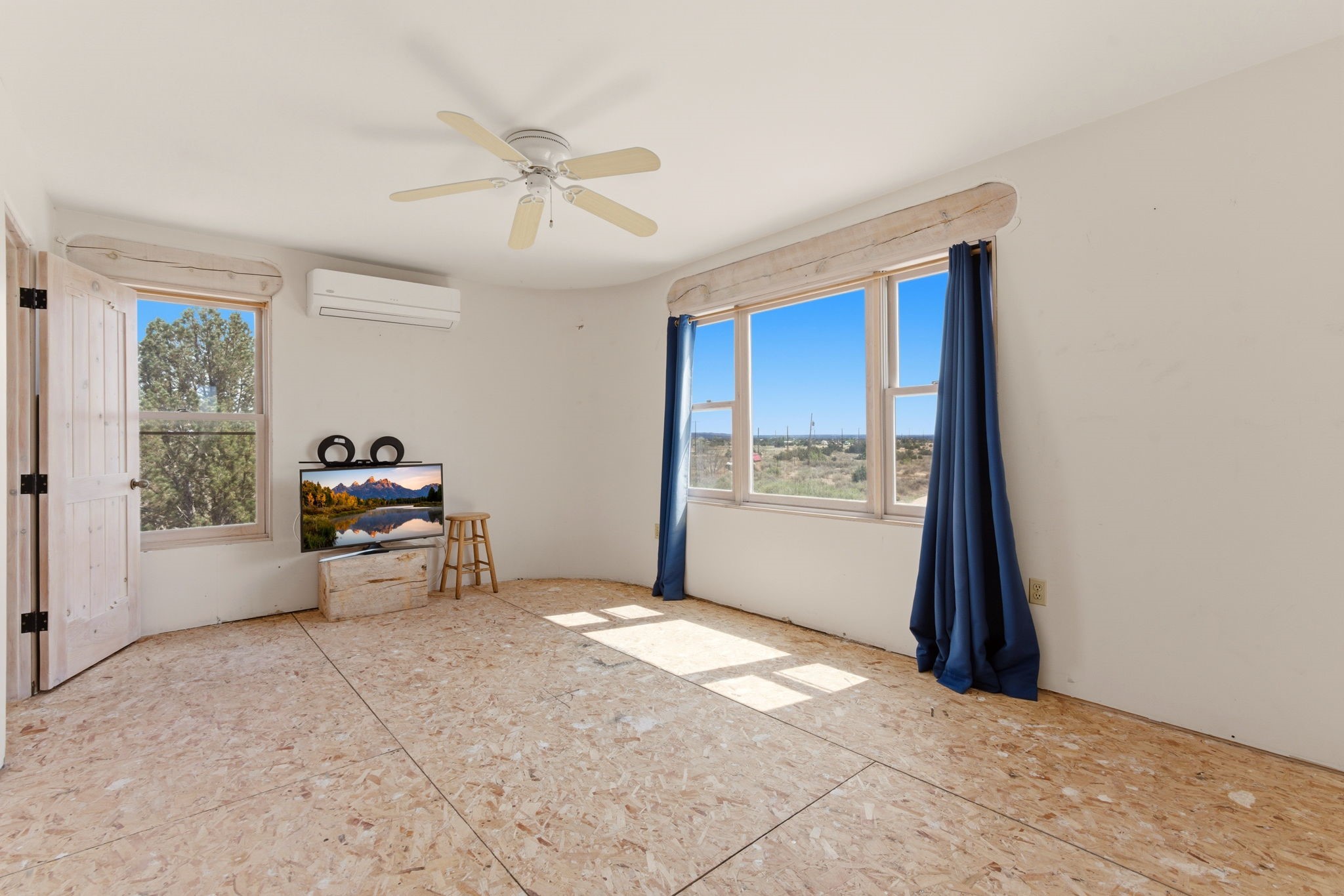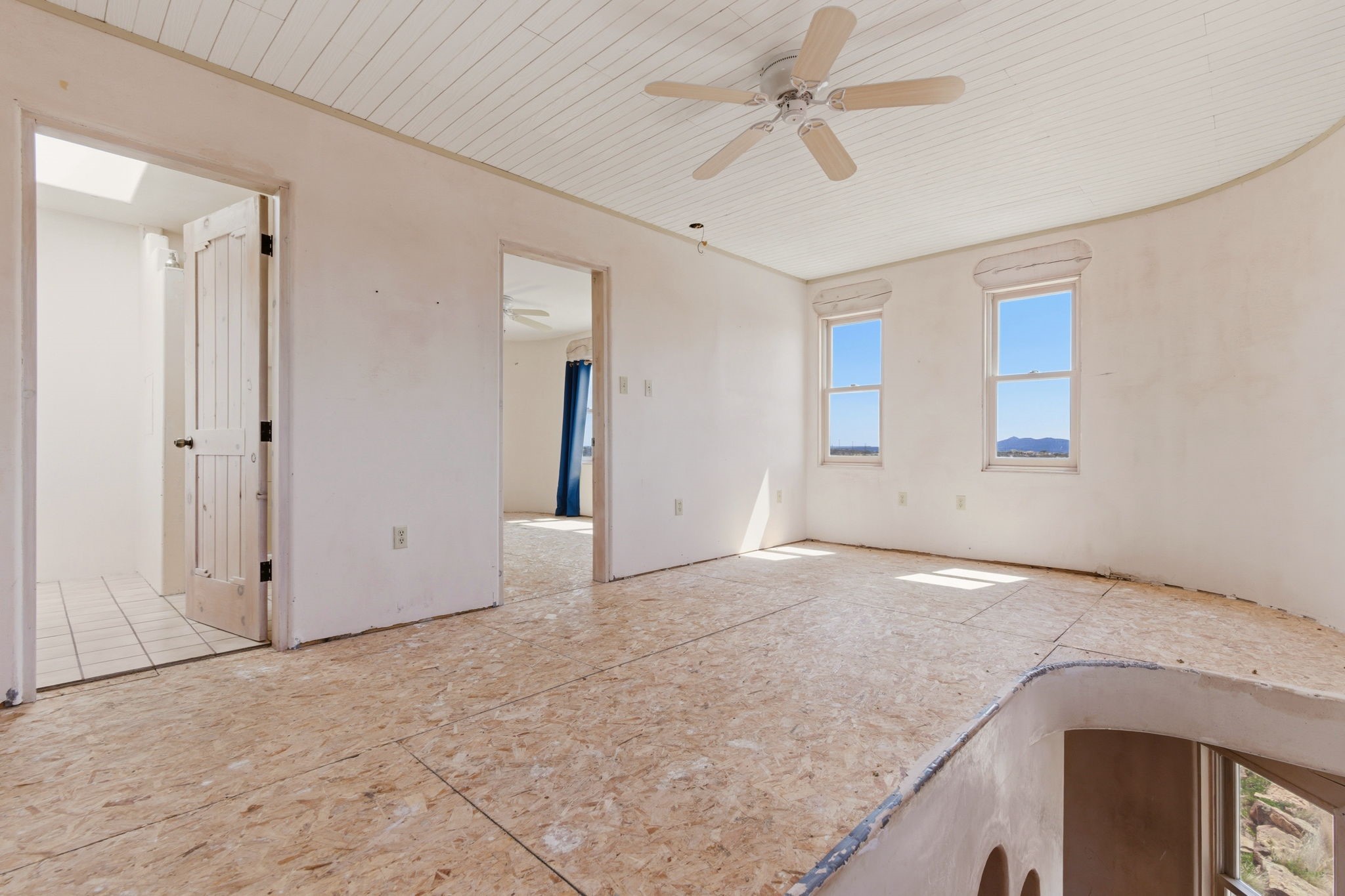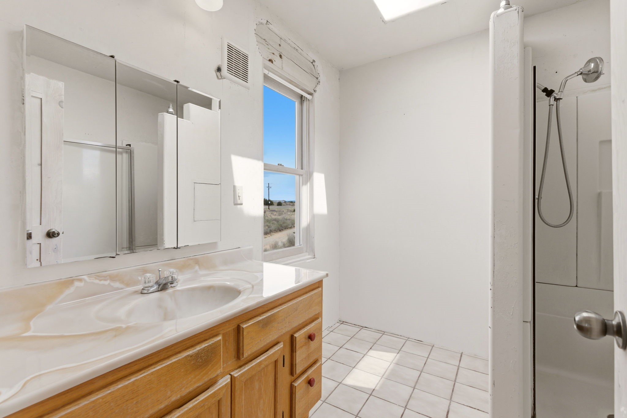Set on 5 private acres, this unique Santa Fe property offers a main home, guest house, and an incredible garage/workshop--perfect for multi-generational living, rental potential, or a live/work lifestyle. Horses are welcome and there's no HOA giving you space, flexibility, and freedom while still being close to town amenities.The main house is a spacious split-level home filled with classic Santa Fe charm. The main level features an open kitchen, dining, and living area with warm brick floors, coved ceilings, and a wood-burning kiva fireplace. Wall-to-wall windows capture stunning western mountain views, while the kitchen's large island and open plan make entertaining easy. The upper level hosts the primary suite with a generous walk-in closet and a spa-like bath. On the lower level, you'll find a cozy sitting room or office with a gas kiva fireplace and the home's second bedroom. A colorful shared bathroom with large soaking tub adds personality and warmth.The guest house is a character-filled multi-level home with attached carport. The main level includes the kitchen, dining, and sitting areas along with the primary bedroom, featuring a walk-in closet and ensuite bath with large soaking tub. Throughout the home you'll find custom carved wood doors, diamond plaster walls, and a mix of brick and Saltillo tile flooring. Upstairs offers another bedroom, bathroom, and additional living space with expansive mountain views. The upper level flooring is ready for your personal finishing touches.The detached garage/workshop is a dream for hobbyists and professionals alike, offering three garage bays, an additional covered carport, abundant storage, and a dedicated workspace. Equipped with a 60-gallon central pneumatic compressor system and central vacuum system, this space is ready for projects of all kinds.With horse-friendly acreage, wide-open space, and endless possibilities, this special property captures the spirit of Santa Fe living. Being sold AS-IS.
